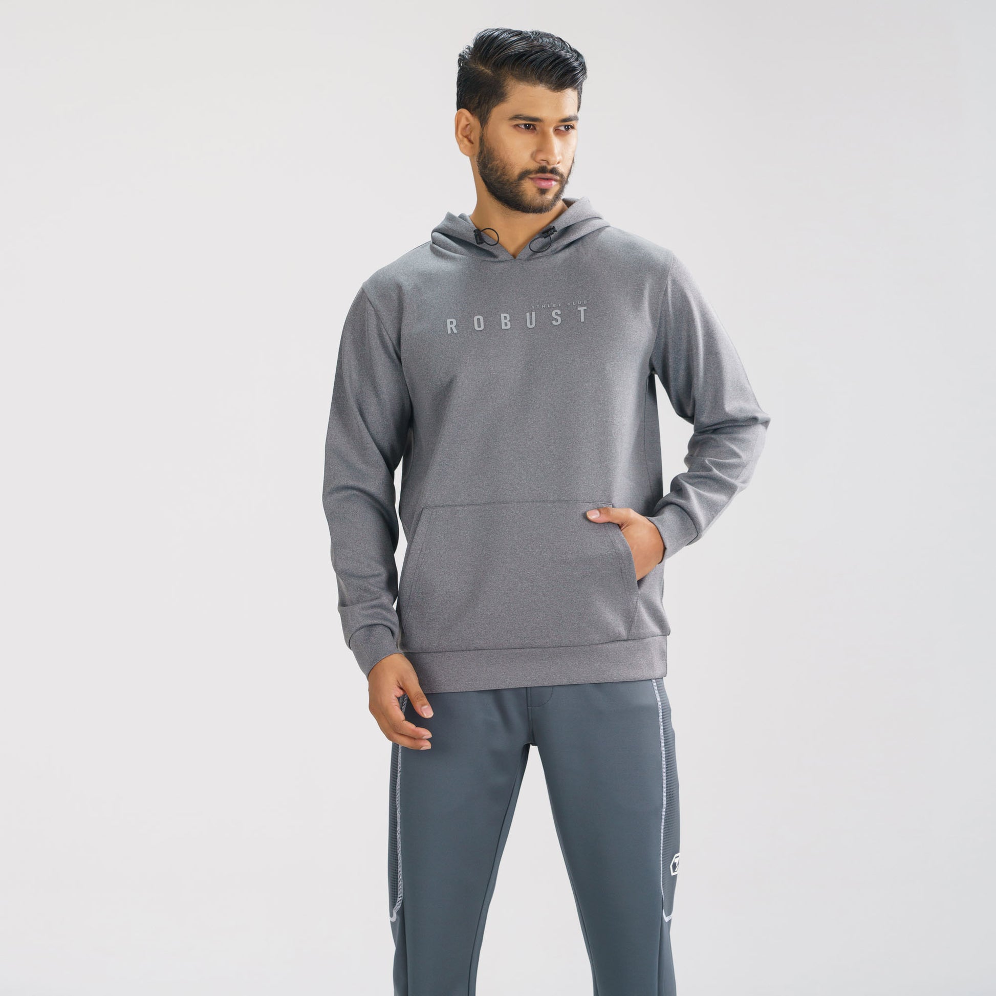 This men’s gray melange hoodie combines comfort and style with its chest print and functional kangaroo pocket. Made from a soft poly-spandex scuba blend, it offers a regular fit and a cozy feel, perfect for casual wear or layering in cooler weather.