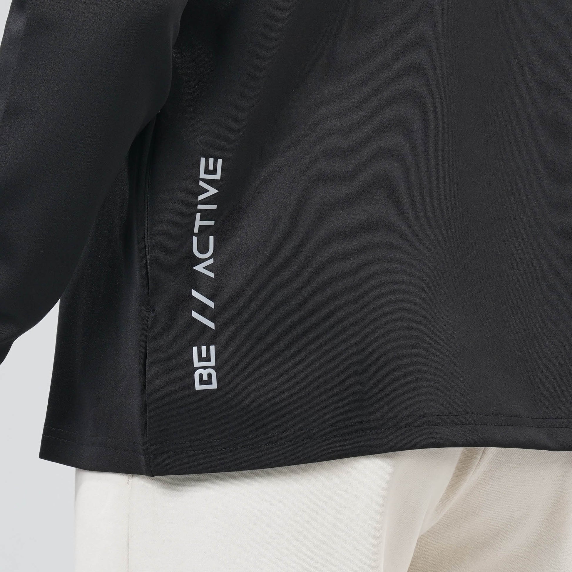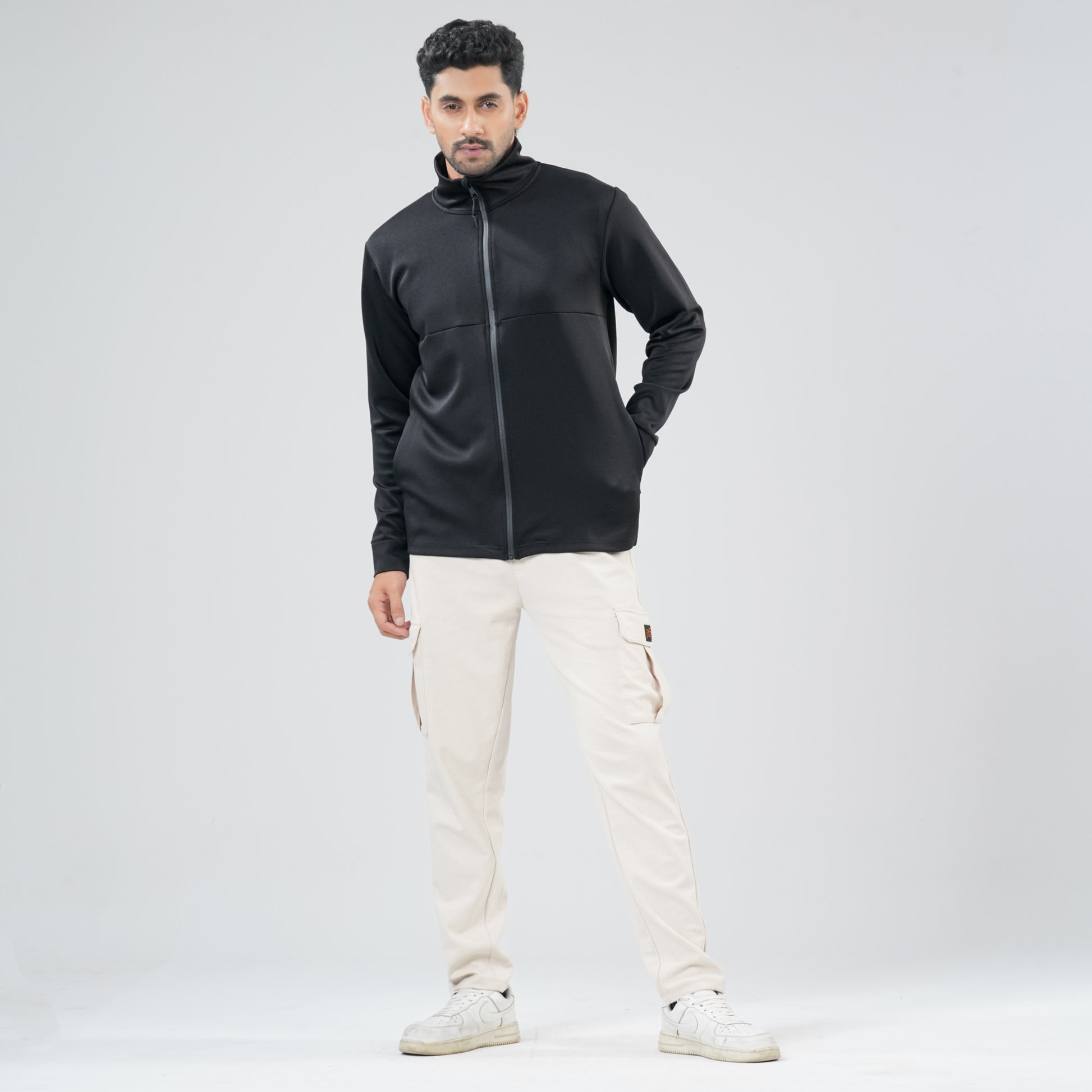 Keep warm and stylish with this mens black sweatshirt, crafted from soft scuba fabric for a smooth and comfortable feel. Designed with a front zipper and cut-and-sew detailing, it features a bottom print that adds a trendy touch. Perfect for a casual yet polished winter look.