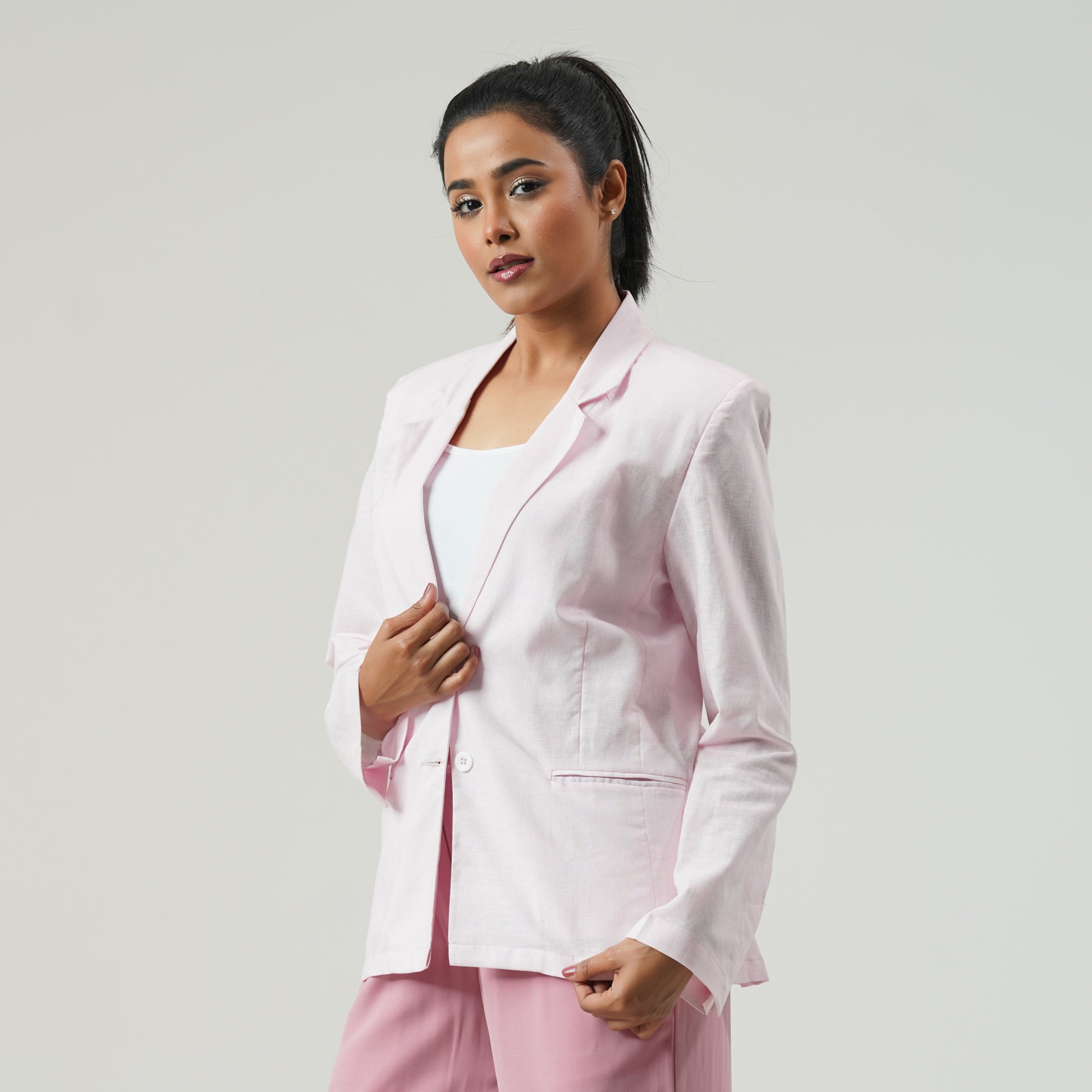 This ladies' baby pink blazer is crafted from a breathable cotton-linen blend, combining casual comfort with a formal cut. Designed in a regular fit, it’s perfect for both workwear and chic casual styling, offering a soft feel with an elegant look.