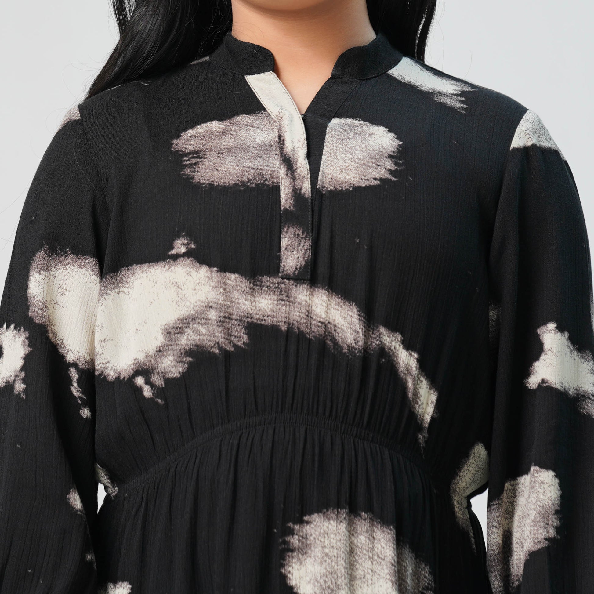 Stylish girls’ dress featuring an all-over print in black. Made from soft, breathable fabric for all-day comfort. Perfect for casual outings or special occasions.