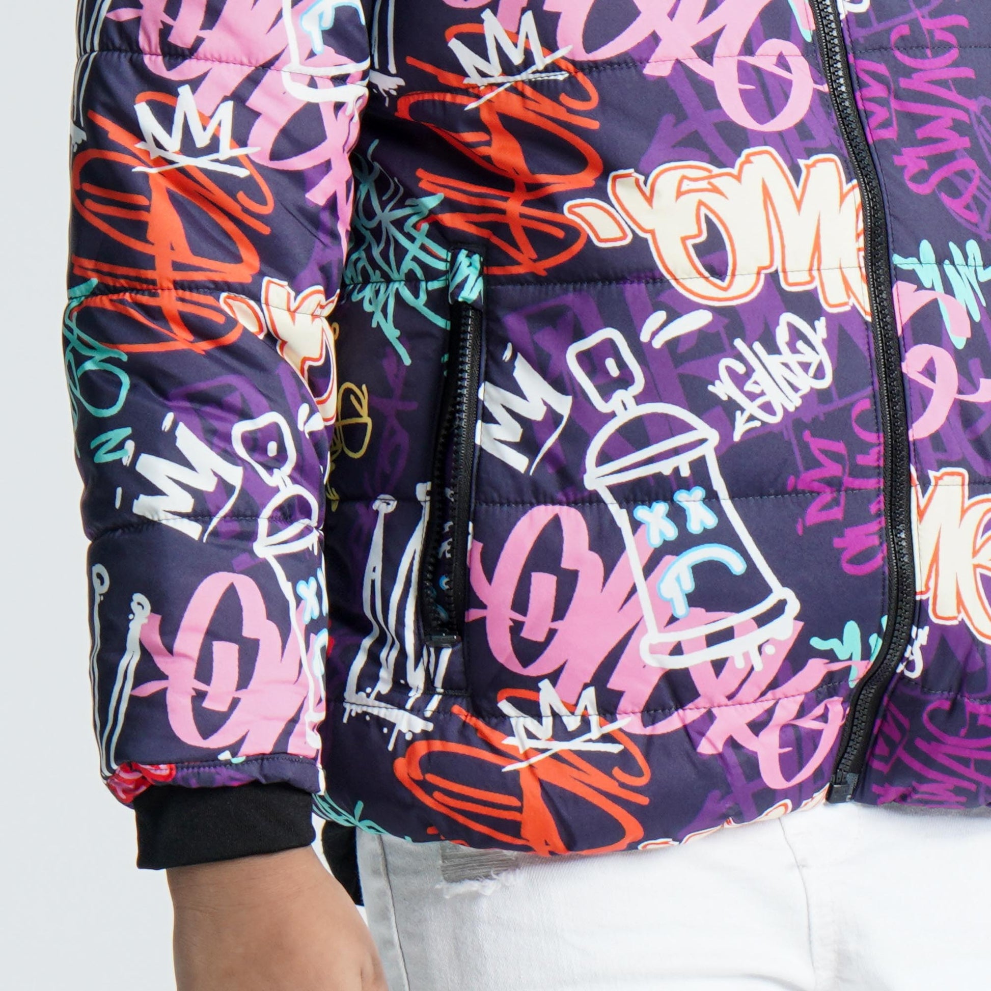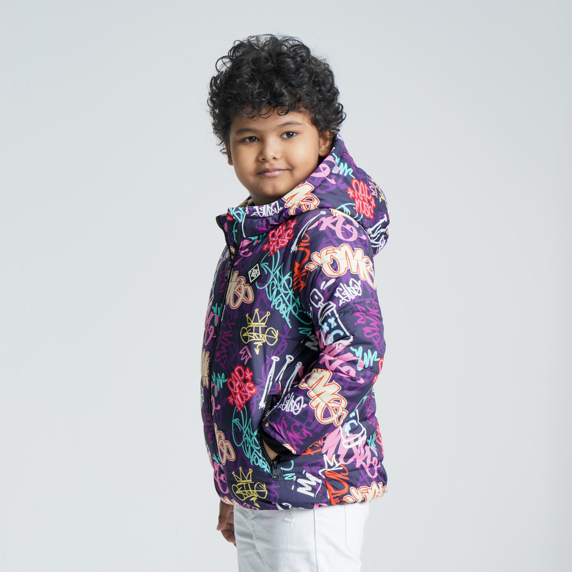 Keep warm and cozy with this baby boys printed padded jacket in purple and yellow. Designed with a soft polyester padded body, it features a hoodie for extra warmth, two functional pockets, and a rubber chest patch for a cute, stylish touch. The zip closure and straight hemline ensure easy wear and a comfortable regular fit. Fully lined for added comfort, this jacket is perfect for chilly winter days.