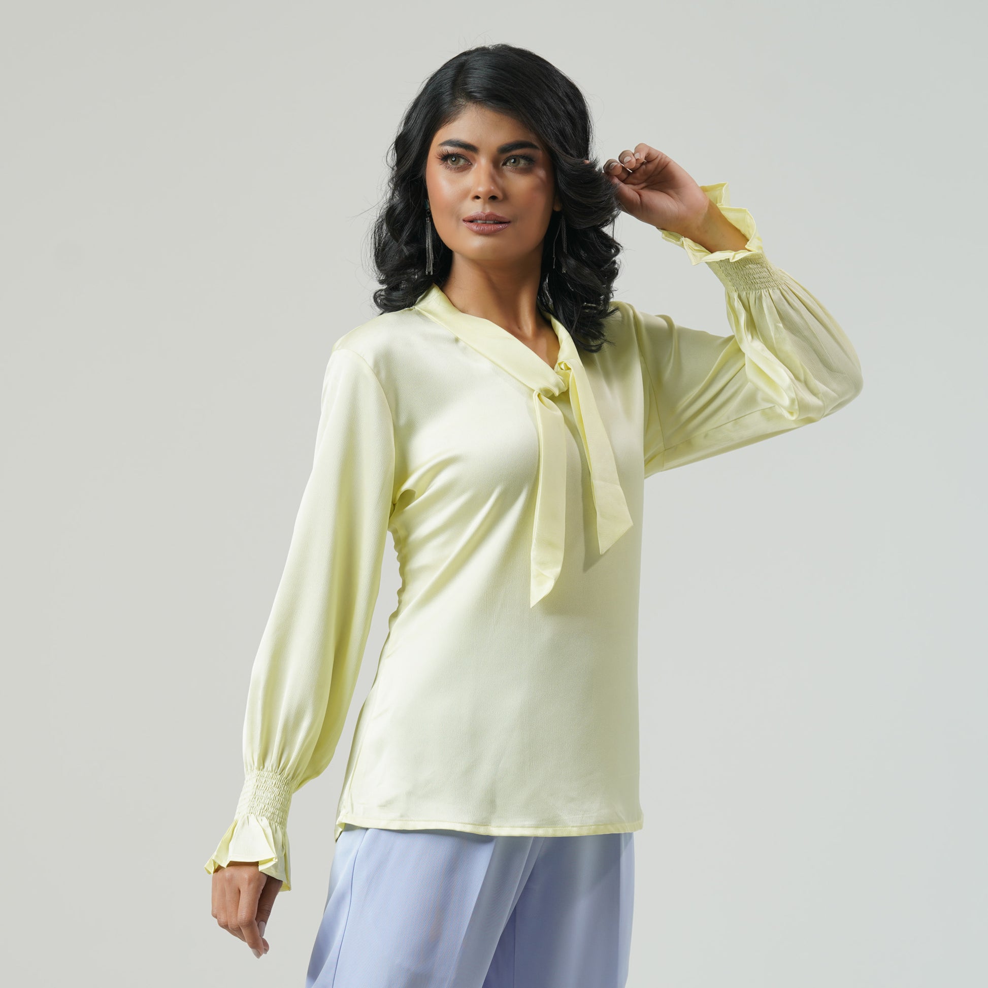 This elegant yellow formal top features a soft collar with a stylish knot at the neck opening and sleeves detailed with smocking at the hem. Crafted from luxurious silk, it offers a sophisticated look perfect for office wear or a polished evening outfit.