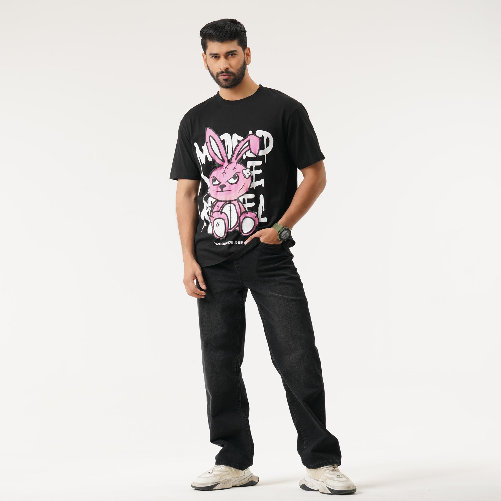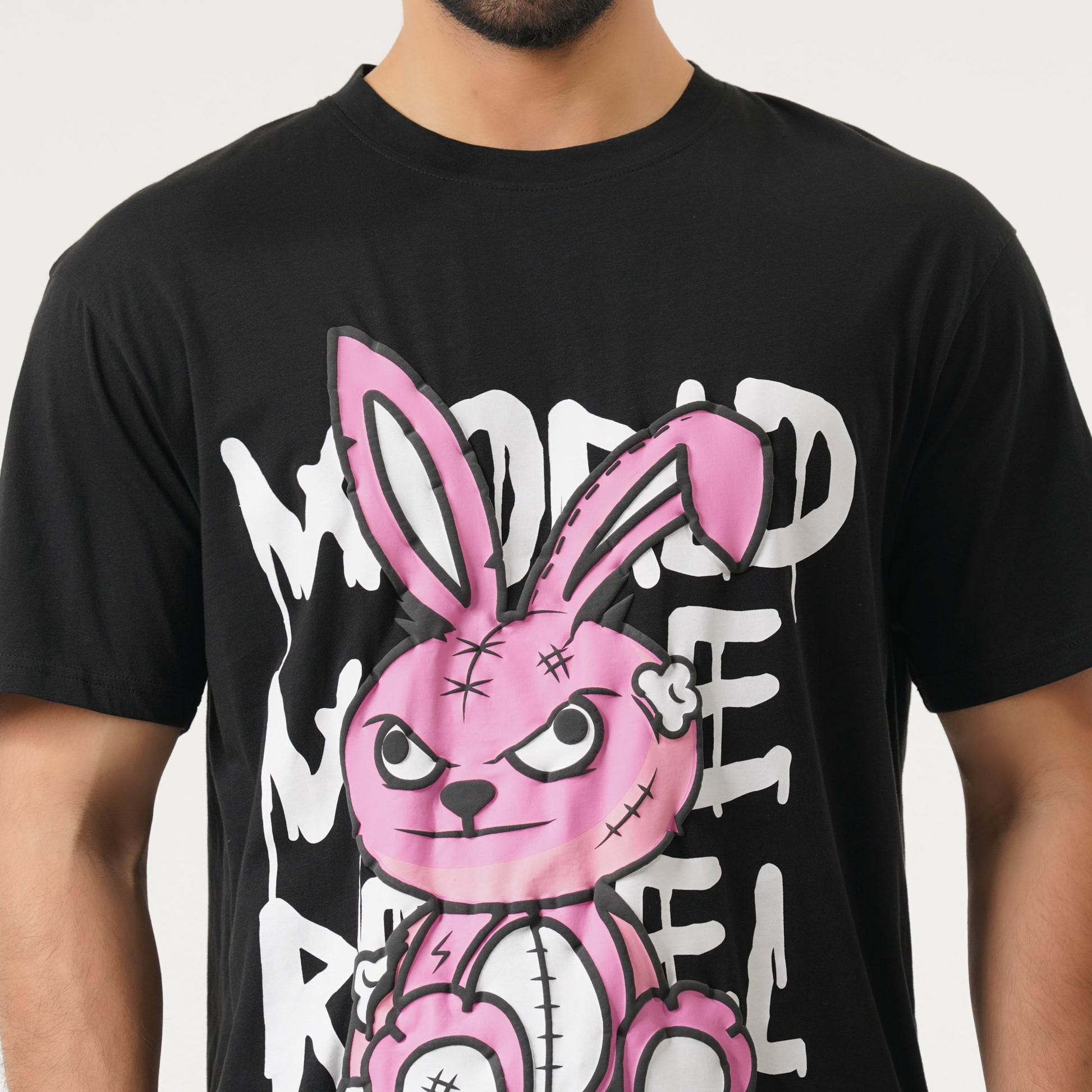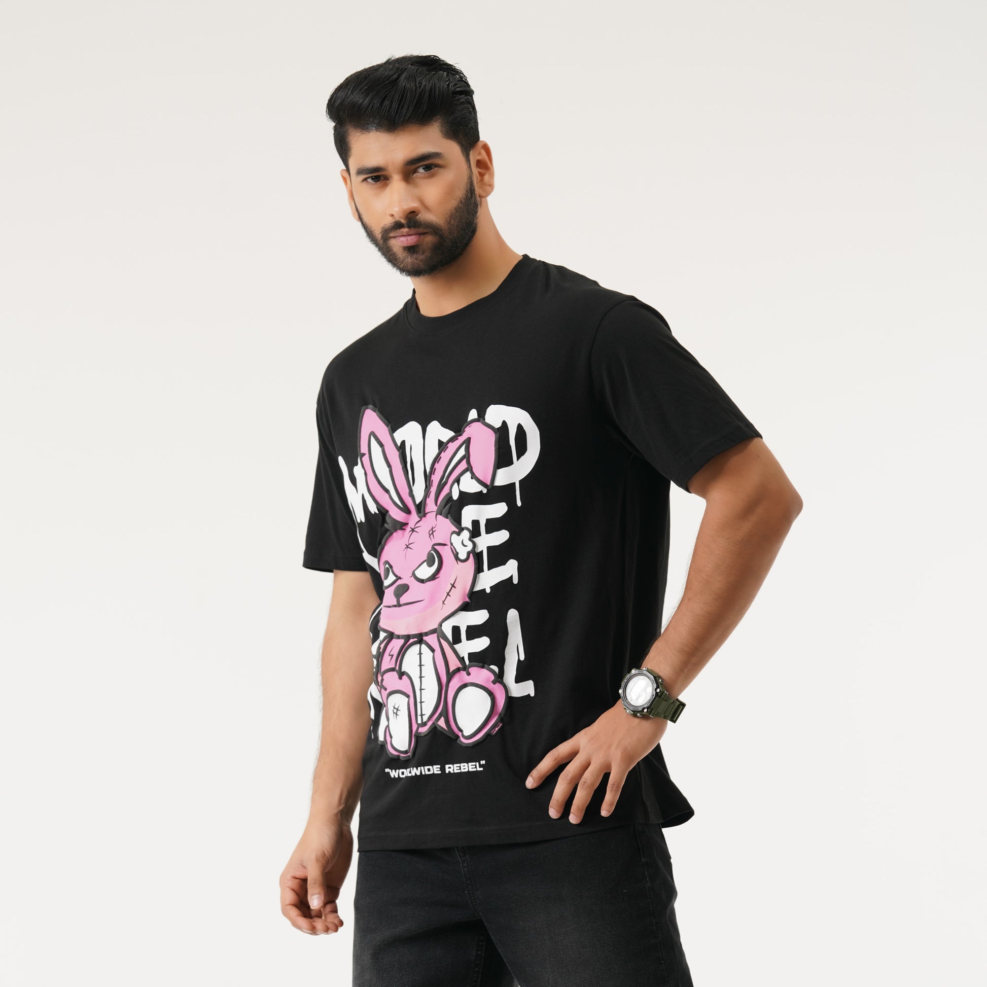 This black mens oversize t-shirt is made from 100% cotton, 220 GSM, ensuring a soft and breathable feel. It features a bold light puff print on the front, combining comfort with standout style perfect for casual, everyday wear.