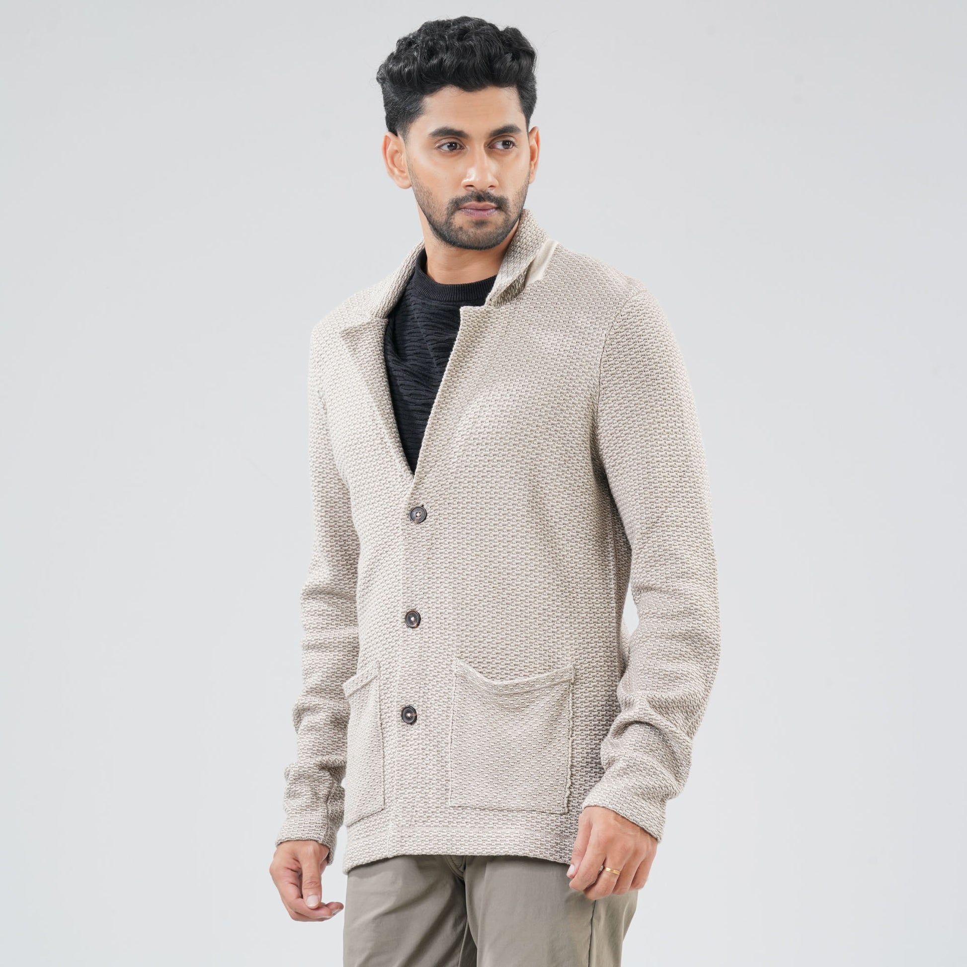Refine his winter look with this men's beige sweater blazer, featuring a textured terry knit design for added warmth and style. Crafted from a soft blend of cotton and acrylic, it comes with a classic lapel collar, front pockets, and plastic horn buttons for a polished finish. Perfect for layering on chilly days.