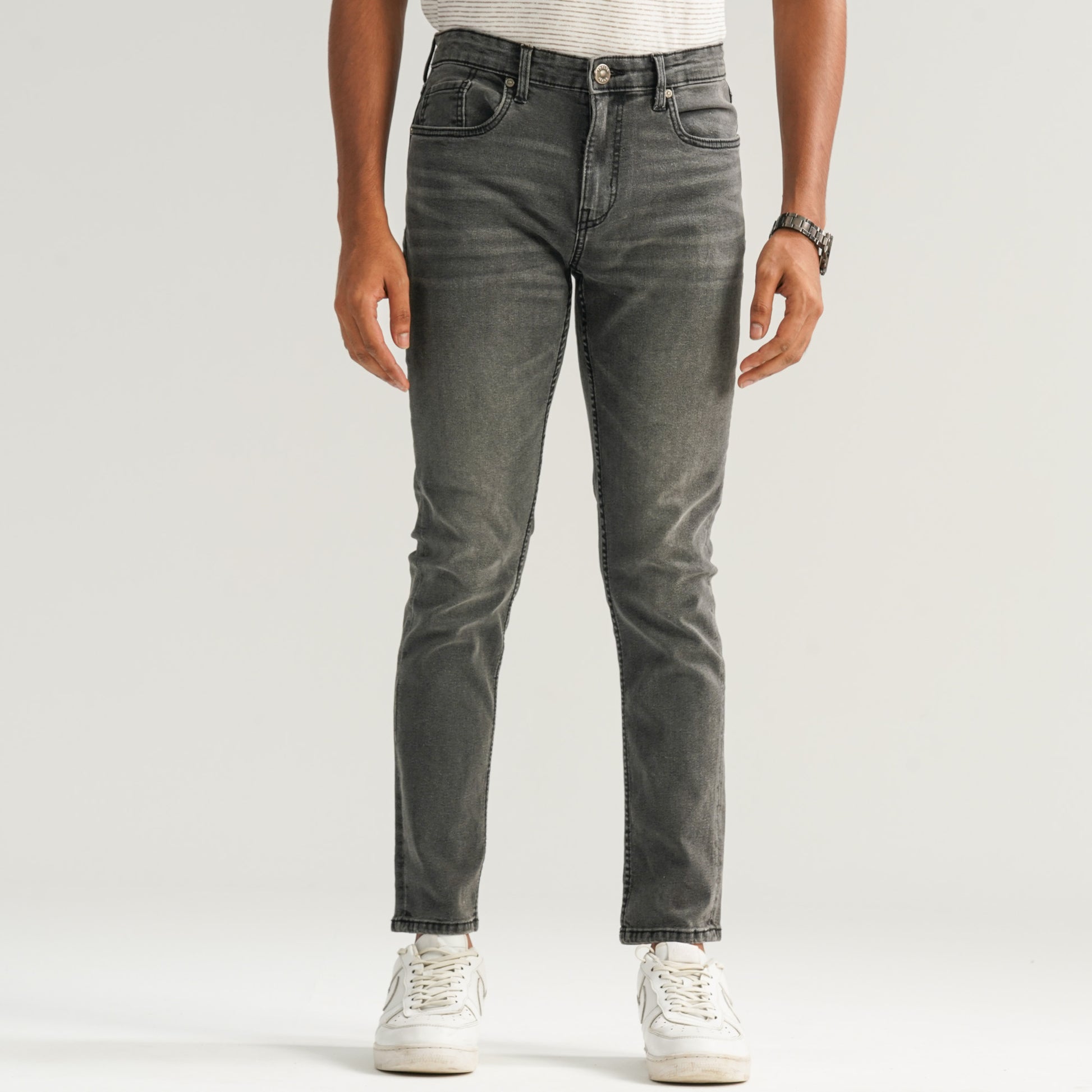 Mens denim pant in classic grey, crafted from a high-quality blend of 72% cotton, 18% polyester, 8% viscose, and 2% spandex for durability and stretch comfort. Features PP wash, whisker effect, and subtle abrasion for a stylish worn-in look. Embroidered detailing on the back pocket adds a refined touch, making it perfect for both casual and smart-casual wear.