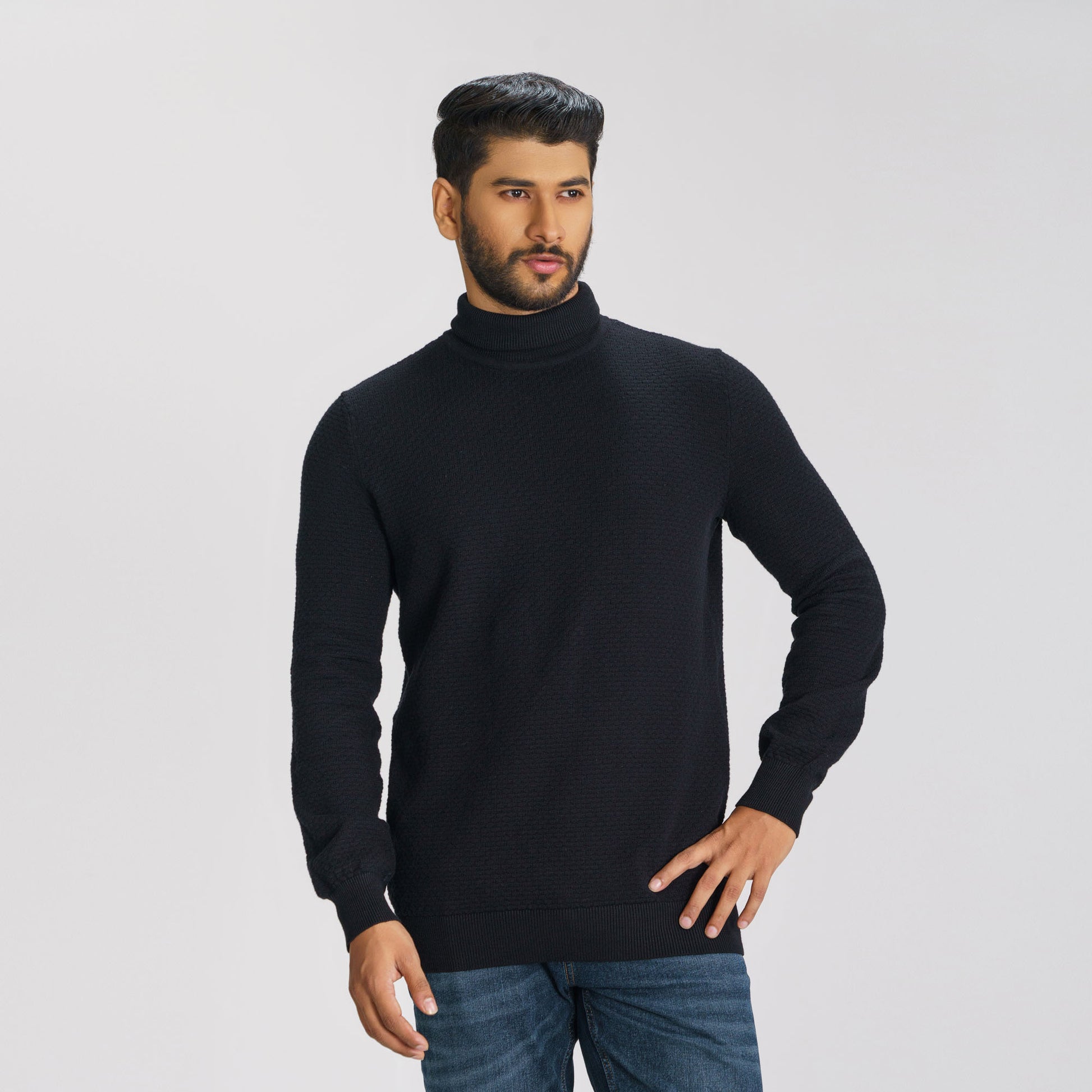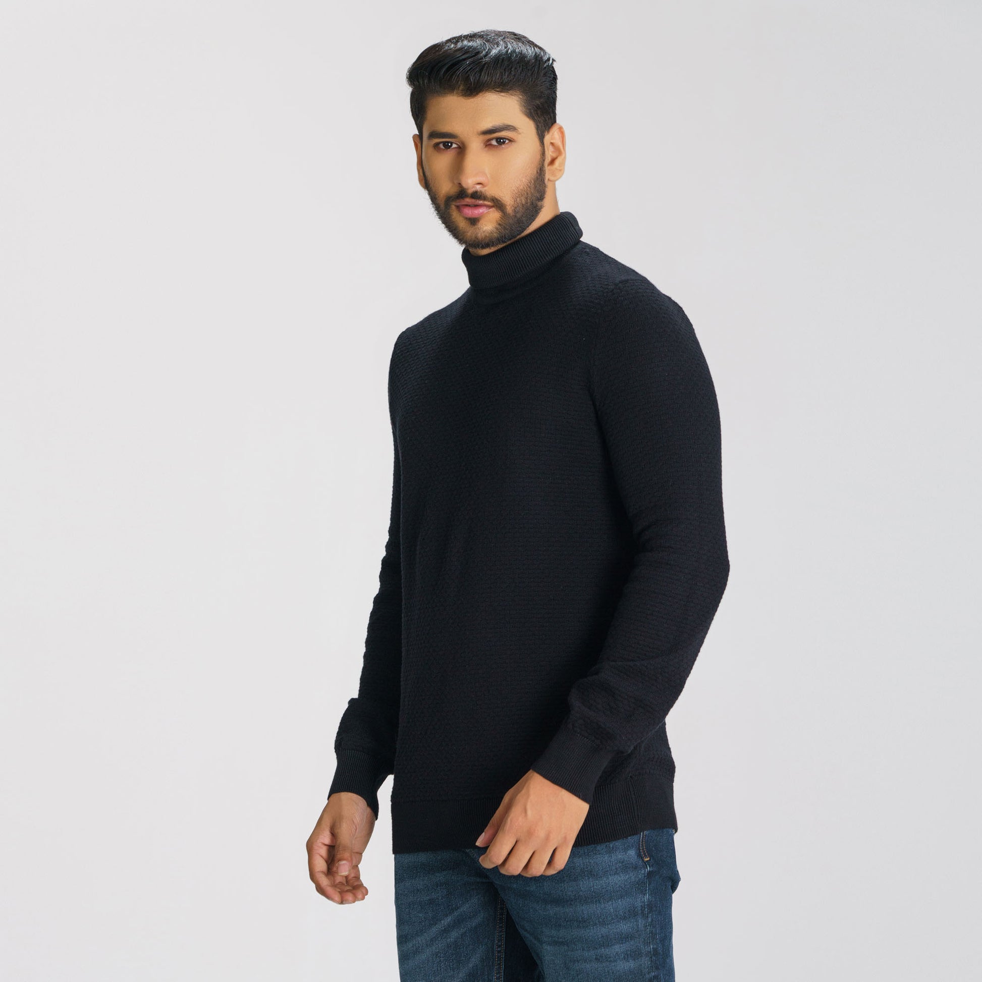 This black pullover sweater for men features a high neck and a refined textured design, crafted from a soft cotton-nylon blend for ultimate comfort. With a regular fit and a smooth hand feel, it’s an ideal choice for a cozy, stylish look during cooler months.