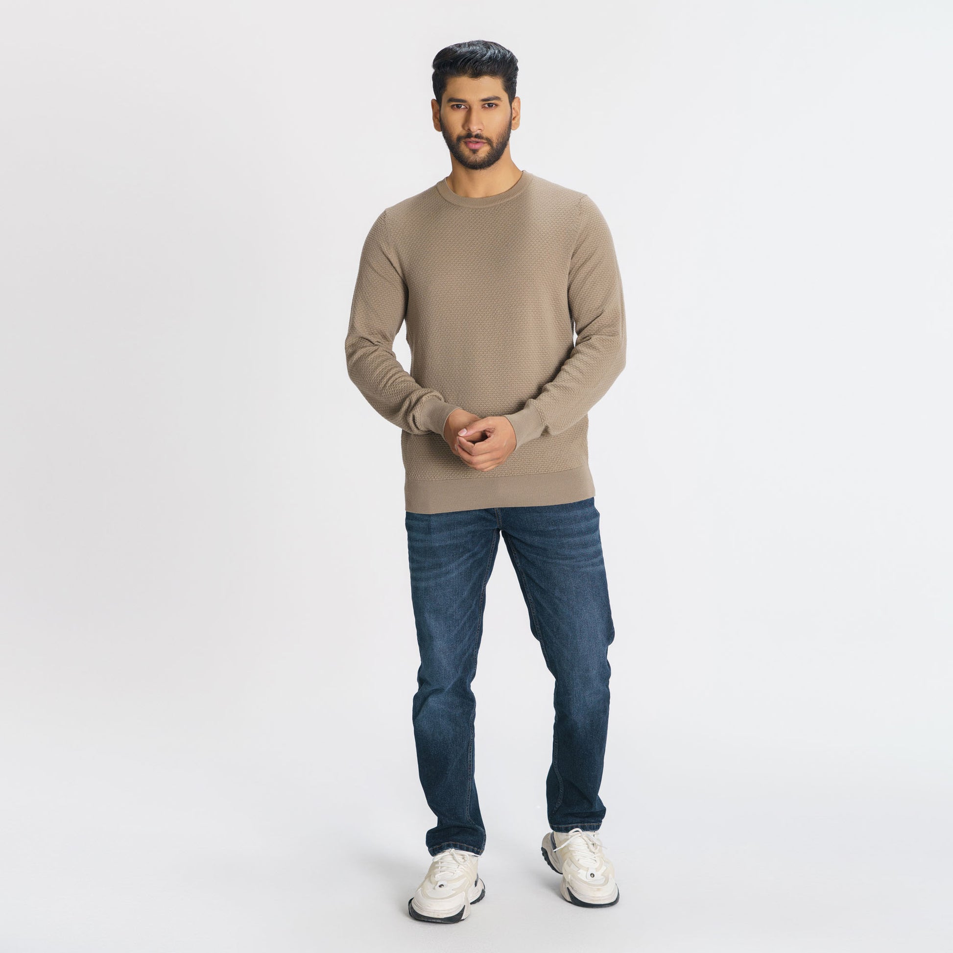 Stay warm and stylish with this men’s beige bubble-knitted pullover. Crafted from a premium blend of wool and acrylic, this sweater offers both comfort and durability. The regular fit and textured knit design make it a versatile choice for cooler days, perfect for layering or wearing on its own.