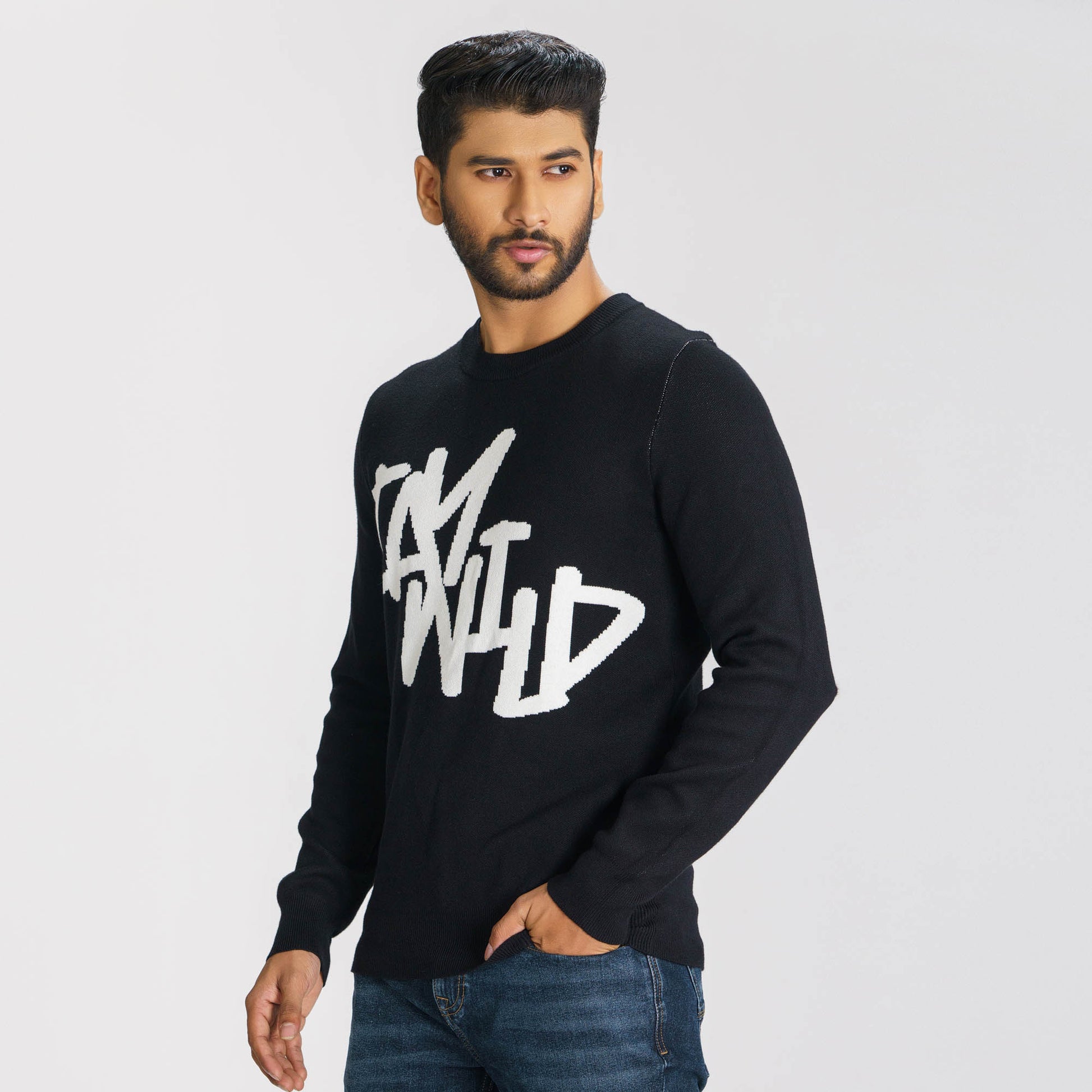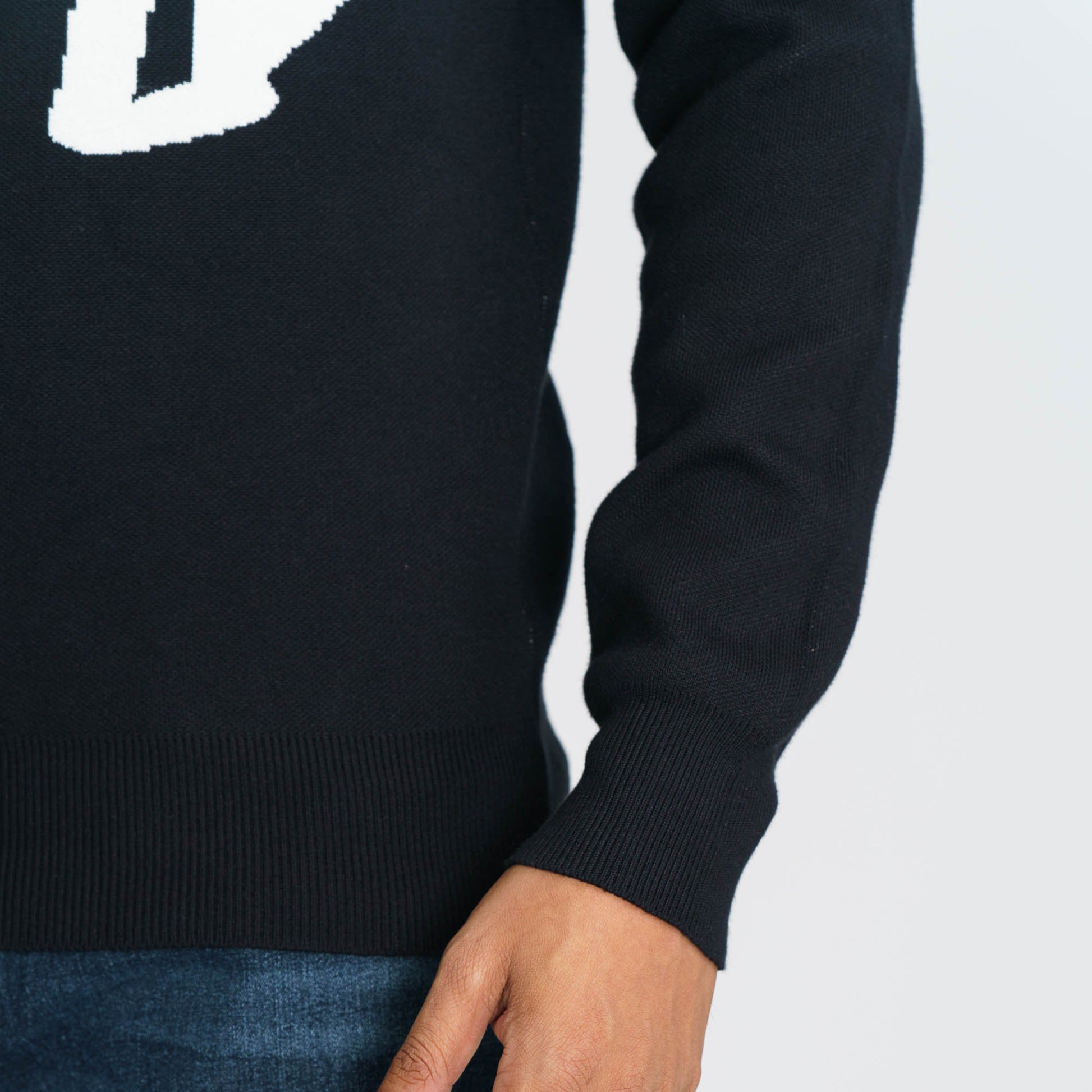 This men’s black and white sweater pullover offers a soft handfeel and bold graphic design, perfect for making a statement. Crafted from a comfortable viscose-nylon blend, it provides both warmth and flexibility. The regular fit ensures all-day comfort, making it an ideal choice for casual outings or layering during cooler weather.