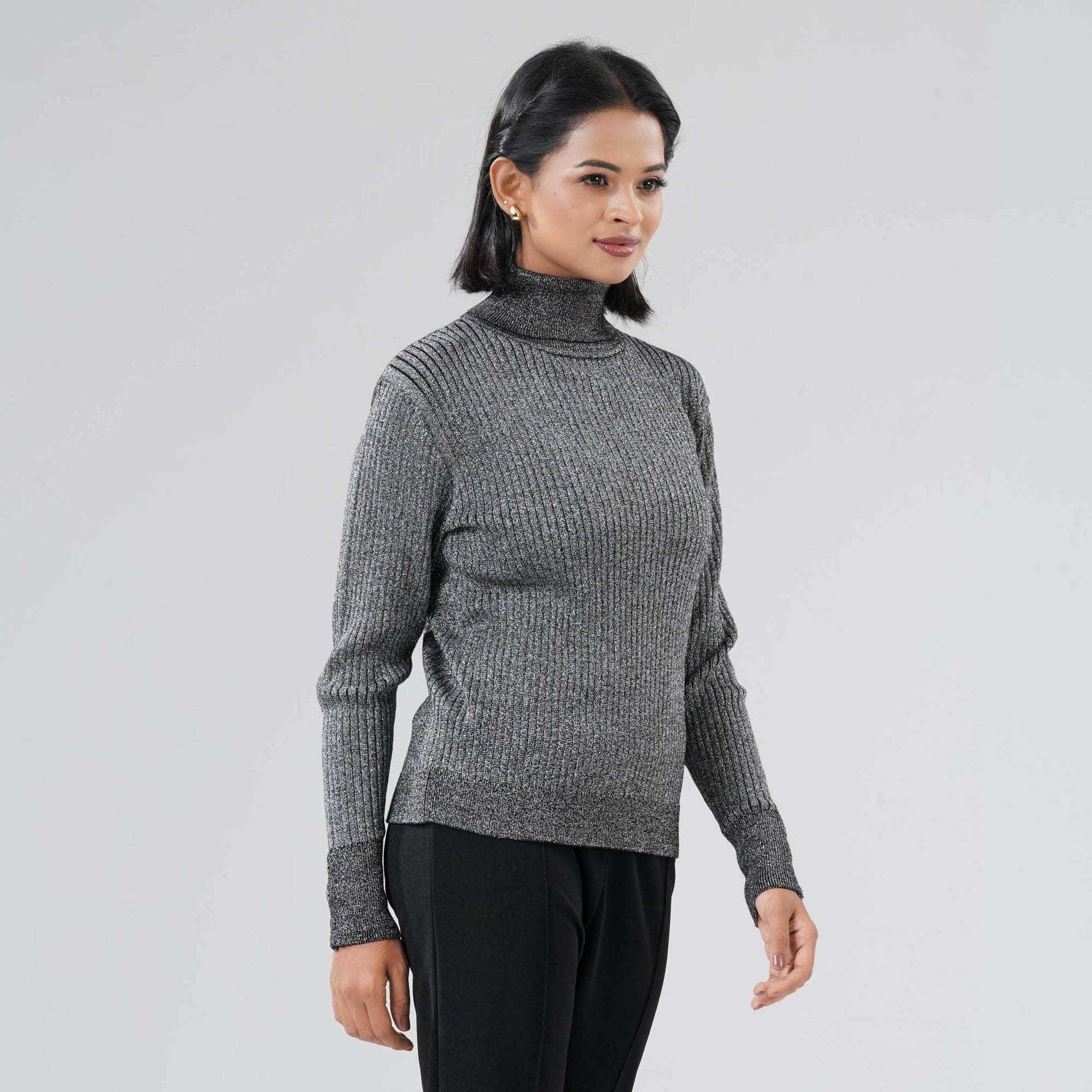 Elevate your style with this women’s black sweater crafted from a premium blend of 85% viscose, 5% nylon, and 10% lurex. It features a high neck for an elegant look, while the lurex yarn adds a subtle, glittery sheen. Designed for comfort and stretch, it offers a perfect balance of warmth, style, and coziness.