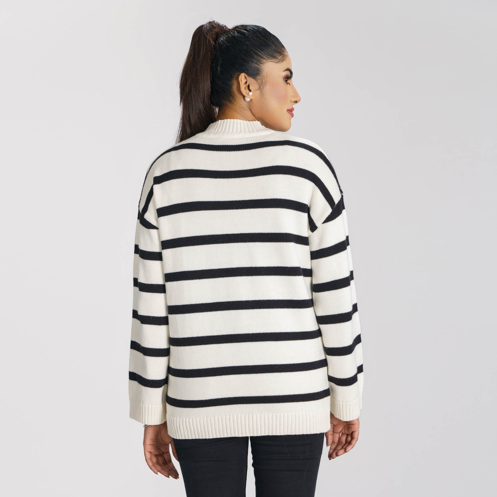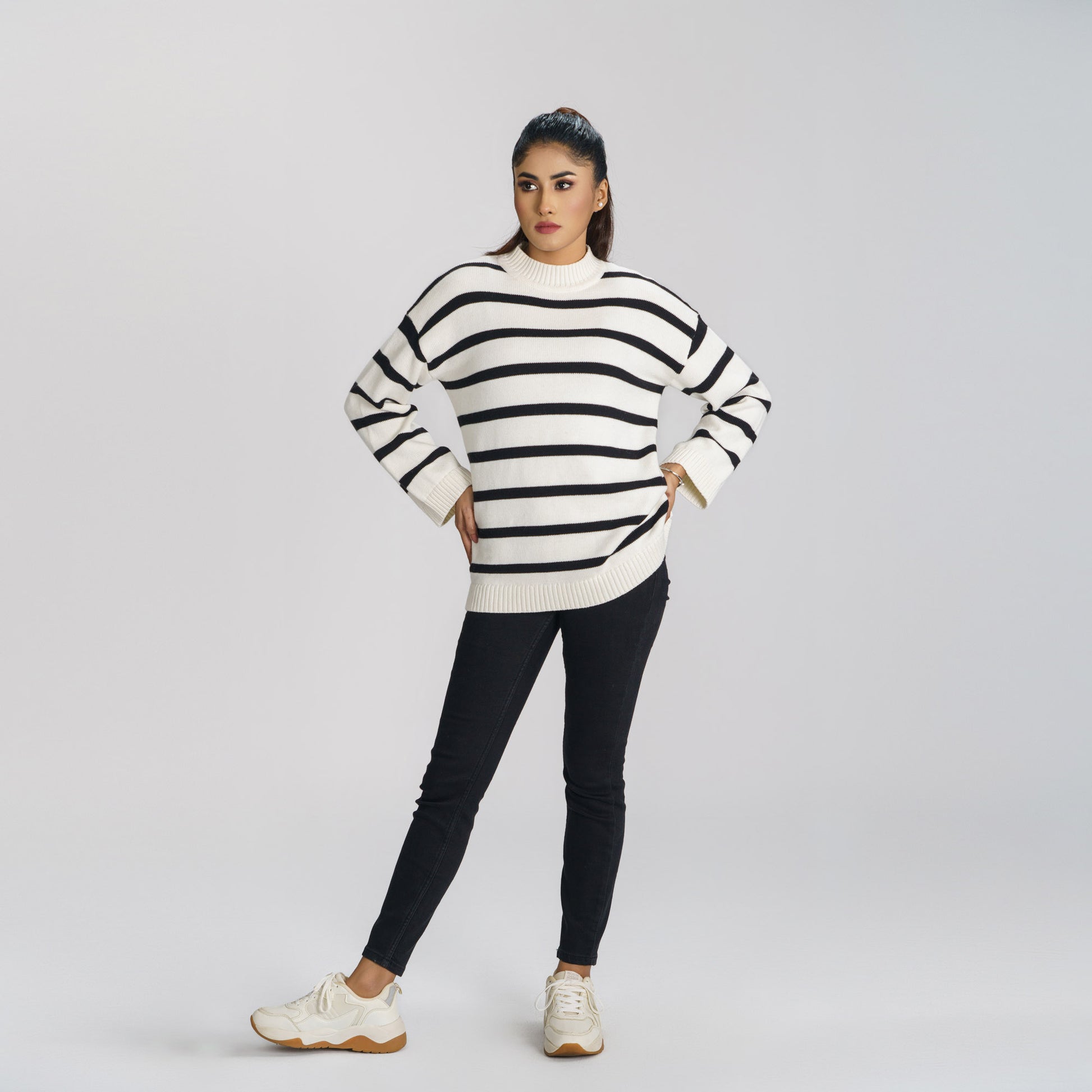 This black and white pullover combines a soft handfeel with stylish stripes, offering a modern yet comfortable look. Made from a cotton-acrylic blend, it provides warmth and breathability, perfect for layering during cooler days. A versatile piece to complement any casual outfit.