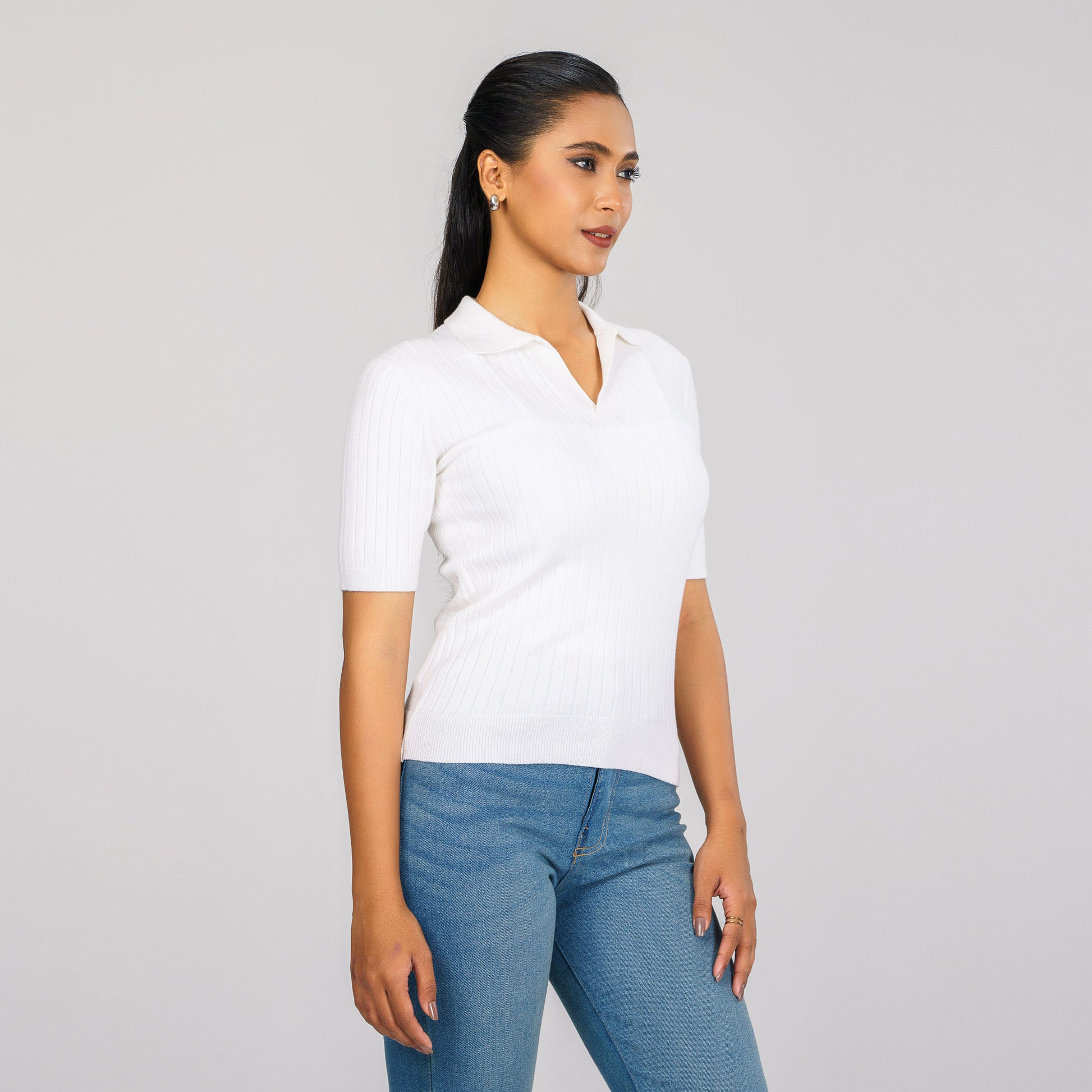 This white polo sweater combines stretch and comfort, crafted from a soft viscose-nylon blend. Featuring a stylish V-neck with a classic collar, it offers a regular fit that’s perfect for layering in cooler weather. A cozy and versatile choice for any casual wardrobe.