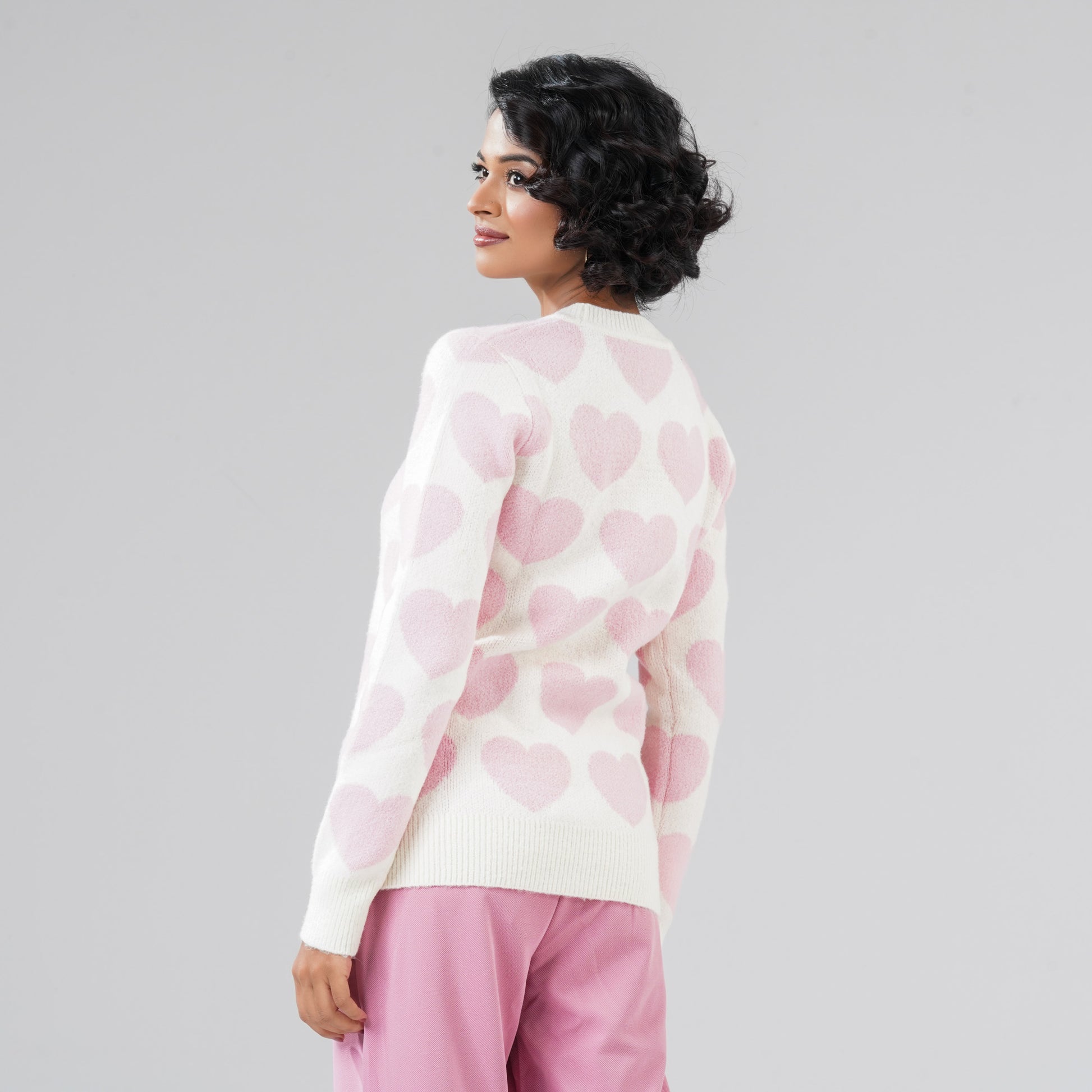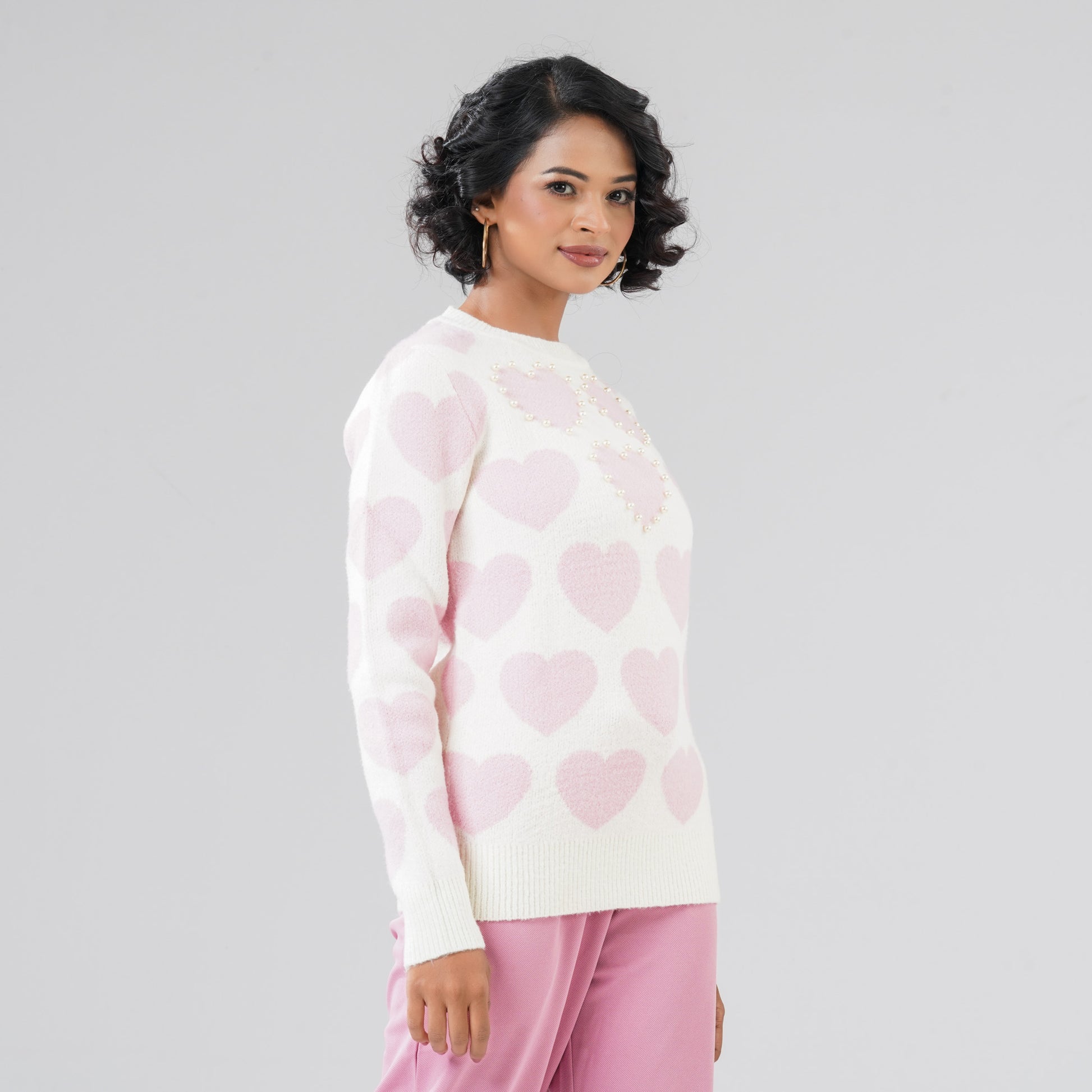Brighten her winter look with this women's white pullover, featuring pink love prints all over and delicate pearl work on the chest. Crafted from soft mossy fabric for warmth and comfort, it offers a regular fit that’s perfect for everyday wear. Stylish and cozy for the season.