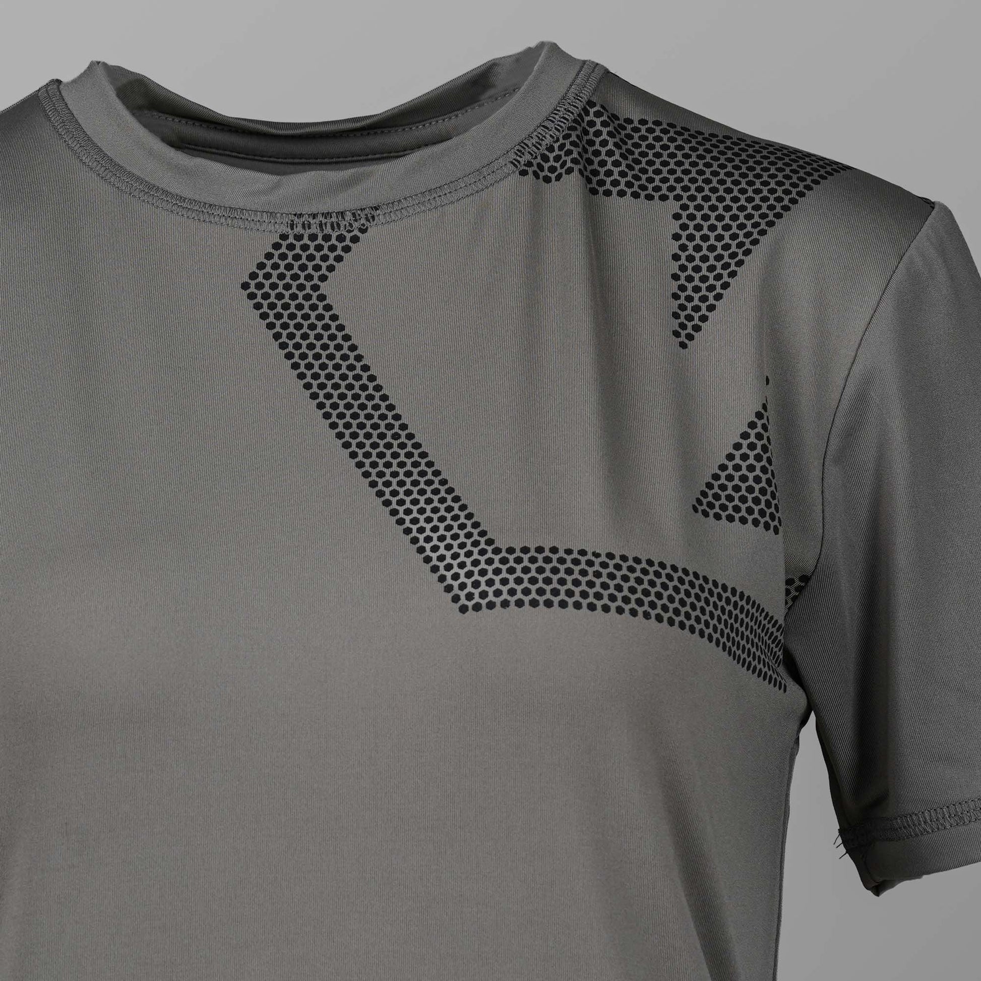 Womens gray active t-shirt crafted from soft, breathable fabric for all-day comfort. Designed with a lightweight stretch fit, it allows easy movement during workouts or casual wear. Perfect for gym sessions, yoga, or an active day out.