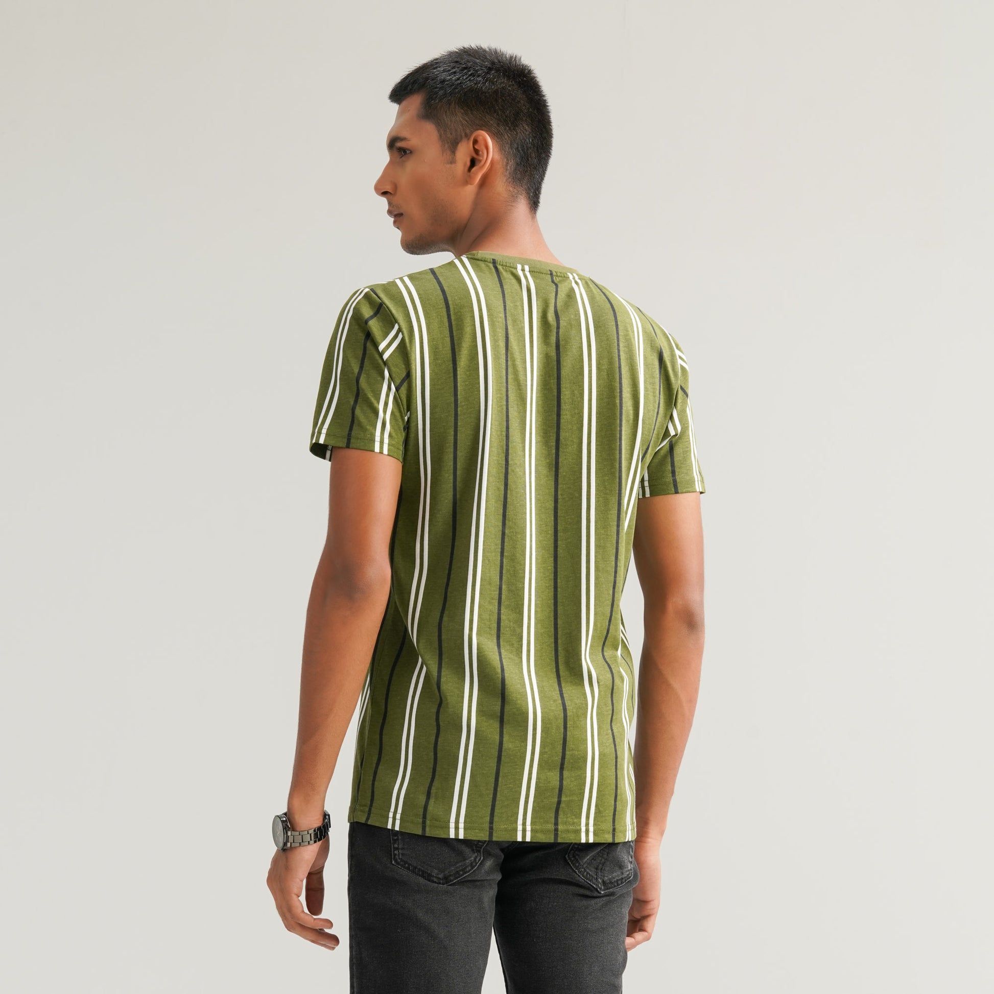Slim-fit mens t-shirt in olive green, crafted from 100% cotton compact single jersey (160 GSM) for a soft and breathable feel. Designed with vertical stripe all-over print and typo embroidery at the chest, it blends comfort with a trendy, modern style. Perfect for casual everyday wear.