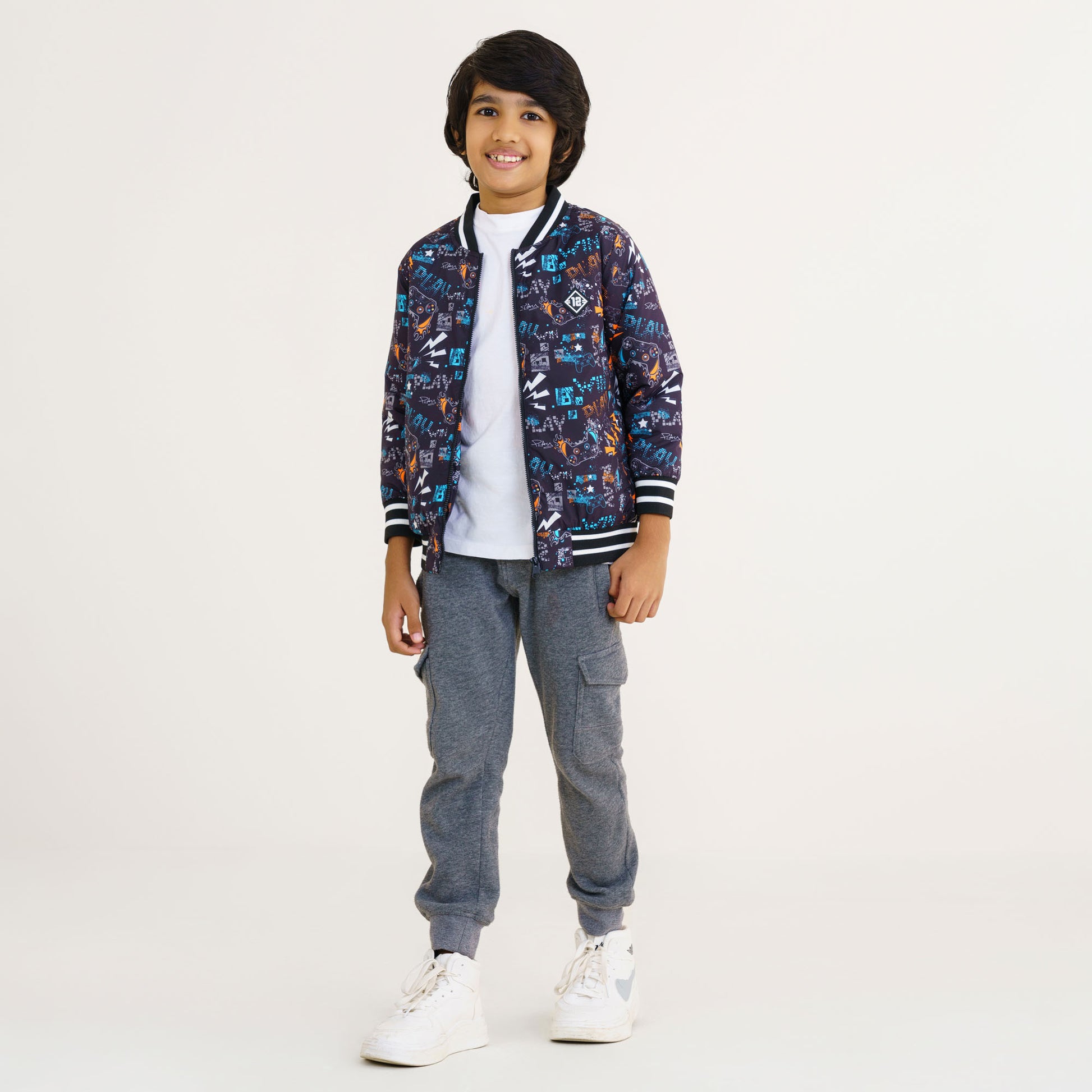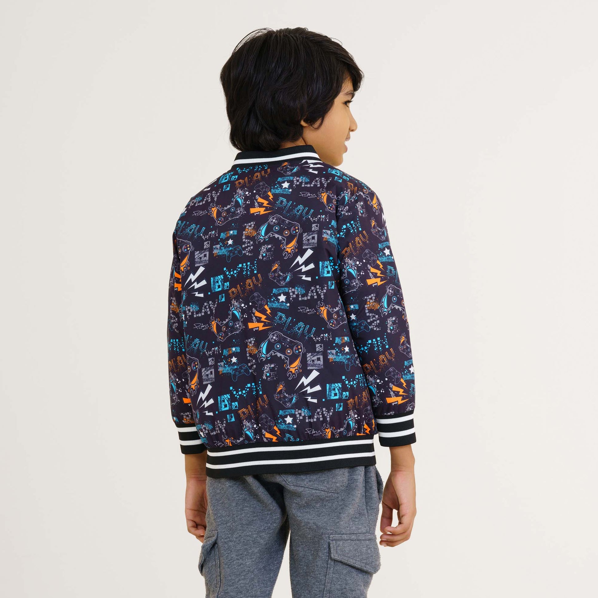Keep your little one cozy and stylish in this black printed bomber jacket. Featuring a ribbed collar, long sleeves, and a straight hemline, it's perfect for chilly days. Designed with tipping ribs, solid lining, and padded body and sleeves for extra warmth. Crafted from polyester for durability and comfort.