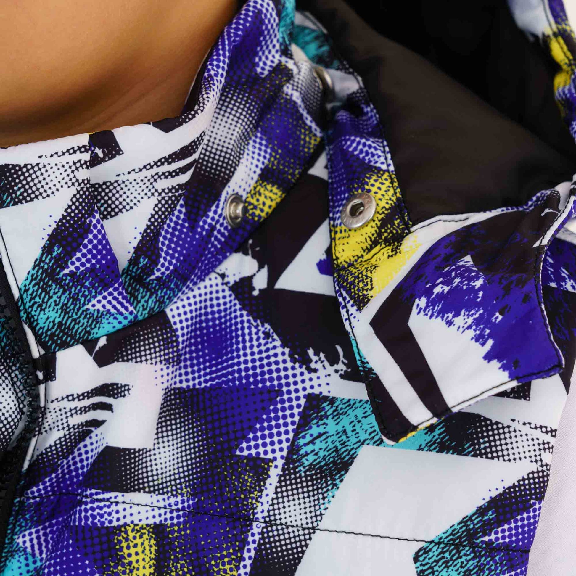 This blue printed padded jacket is designed for boys, featuring a cozy hood and sleeveless design for a trendy look. With two practical pockets, a zip closure, and a straight hemline, it offers both style and functionality. Crafted from 100% polyester with a lining, it’s perfect for keeping warm during chilly days.