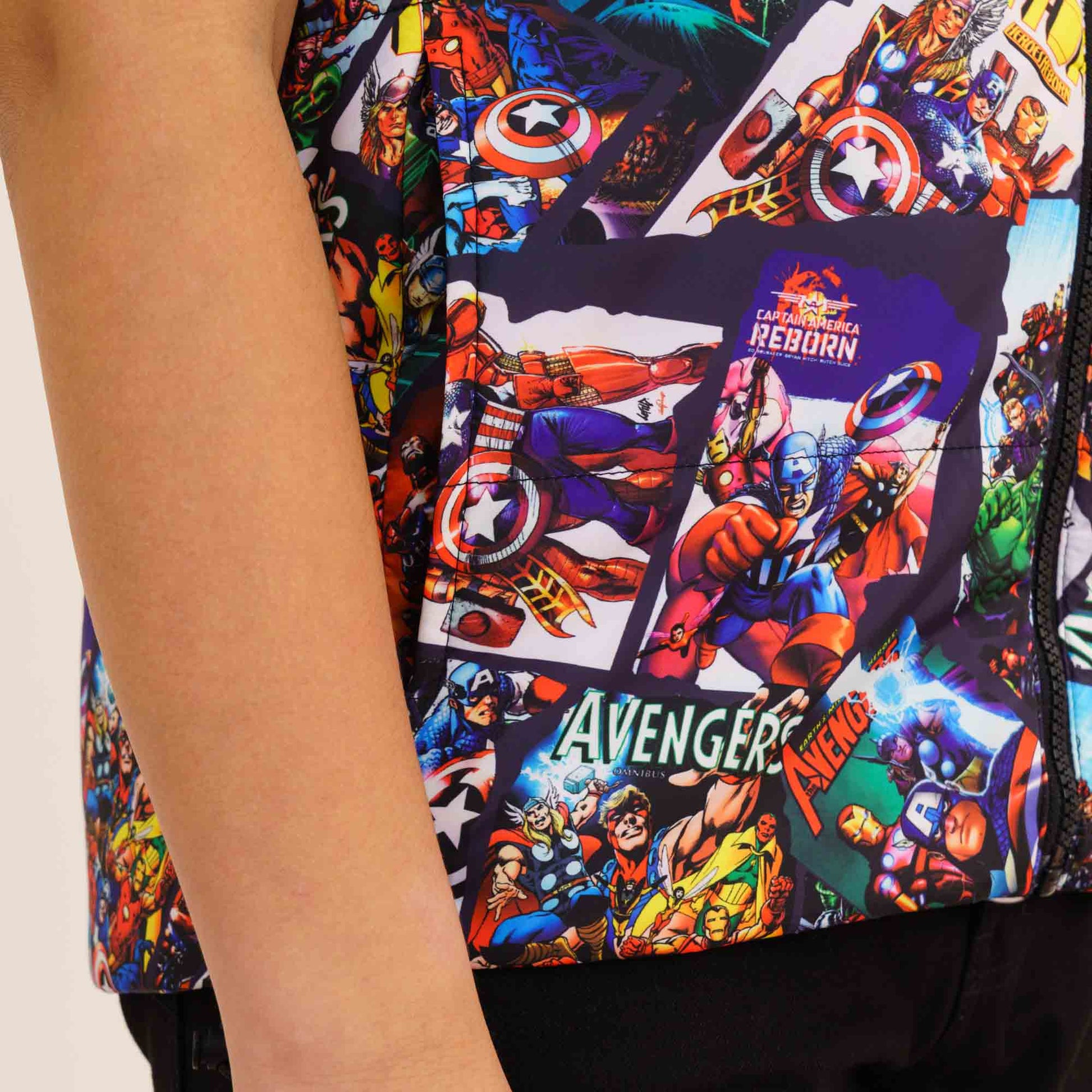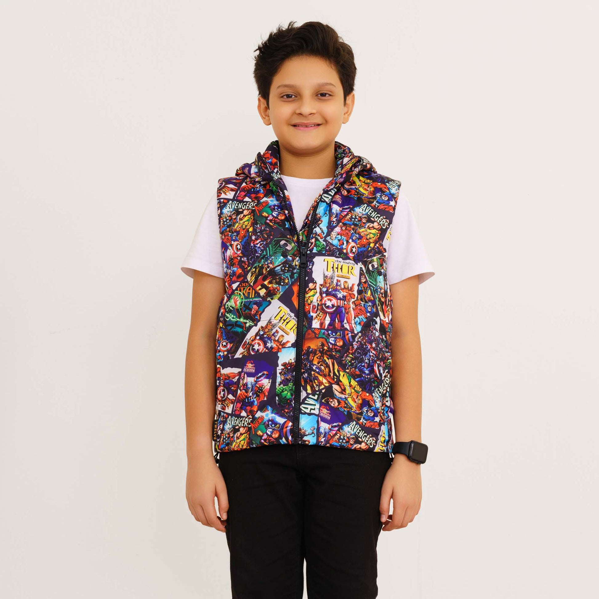 This red printed padded jacket is designed for boys, featuring a cozy hood and sleeveless design for a trendy look. With two practical pockets, a zip closure, and a straight hemline, it offers both style and functionality. Crafted from 100% polyester with a lining, it’s perfect for keeping warm during chilly days.
