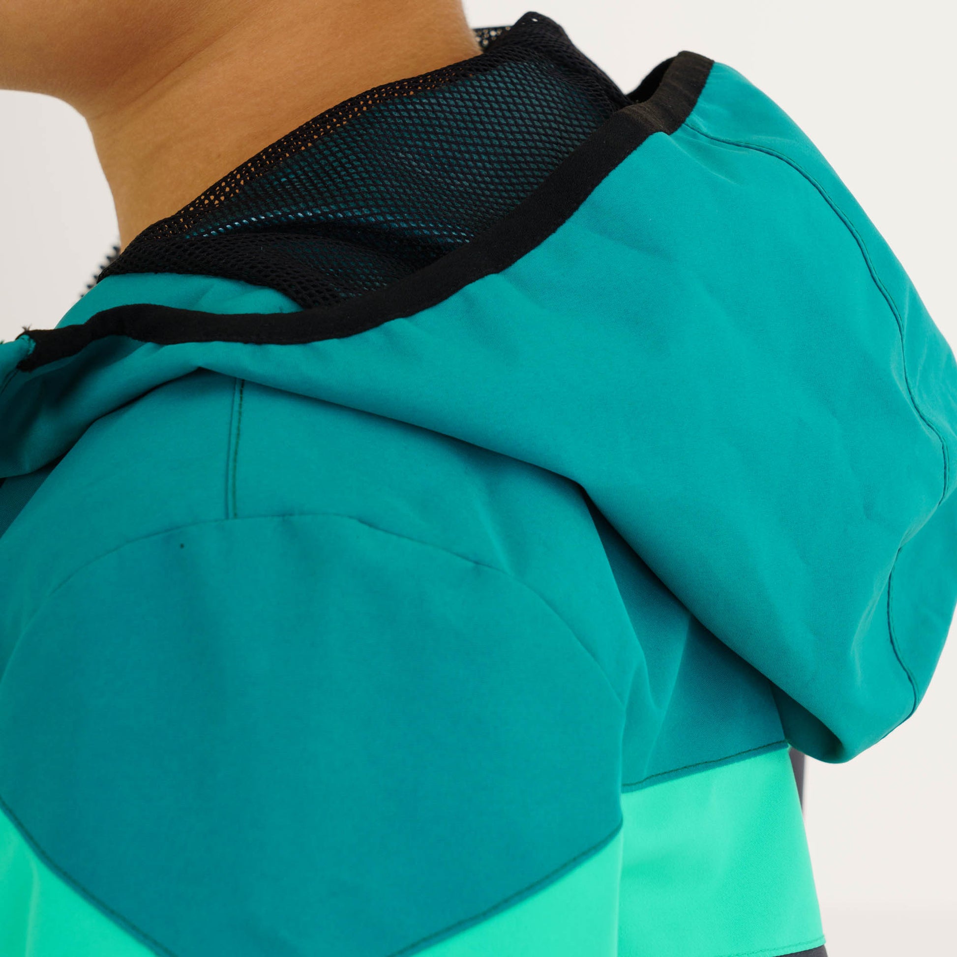 This gray and green padded windbreaker is designed to keep kids warm and stylish. Featuring a hood, two pockets, and long sleeves, it’s perfect for chilly days. The hidden front zipper adds a sleek touch, while the straight hemline and polyester lining provide comfort and durability. Ideal for active days outdoors.