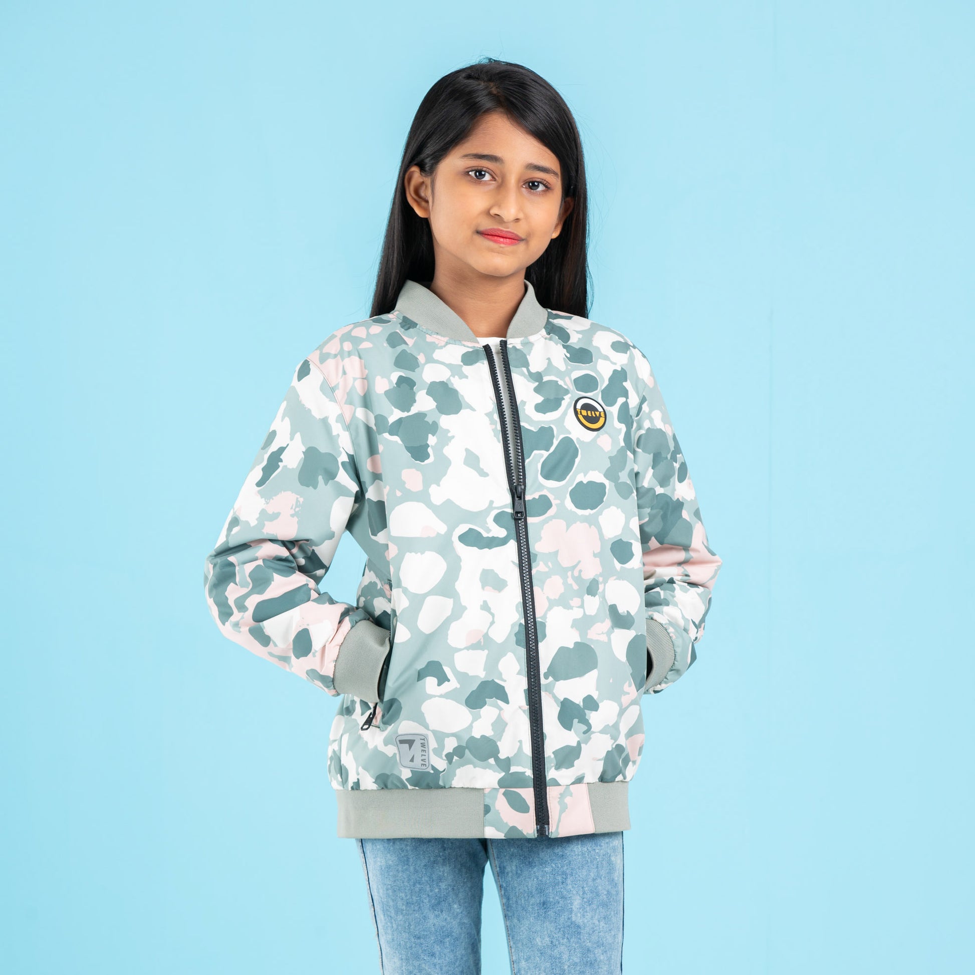 This Girls Bomber Jacket from GIRLS is made from 100% Cotton and comes in a stylish Green/White AOP pattern. Featuring a drawstring hood, two side pockets, and ribbed hem and cuffs, it is ideal for outdoor activities.