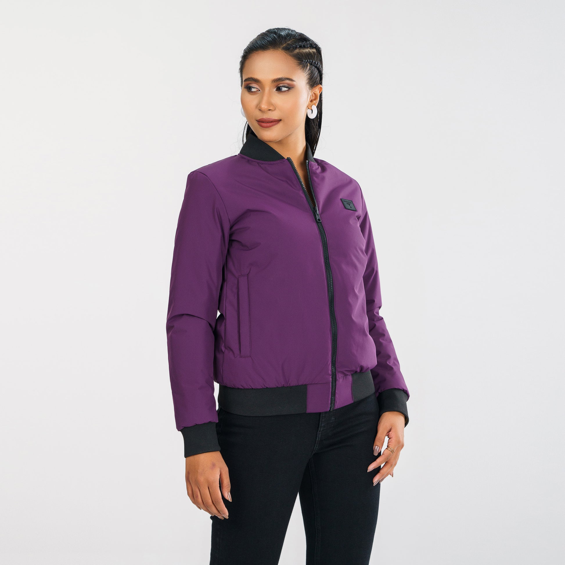 Experience versatile style with this purple reversible bomber jacket. One side features a chic printed design, while the other is a sleek solid color, perfect for any look. Designed with a stand collar, zip closure, four functional pockets, and long sleeves, this lightweight jacket is crafted from 100% polyester for all-day comfort.