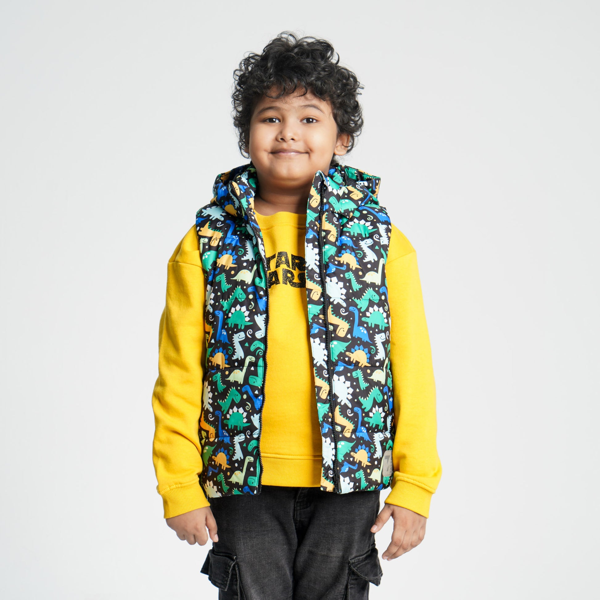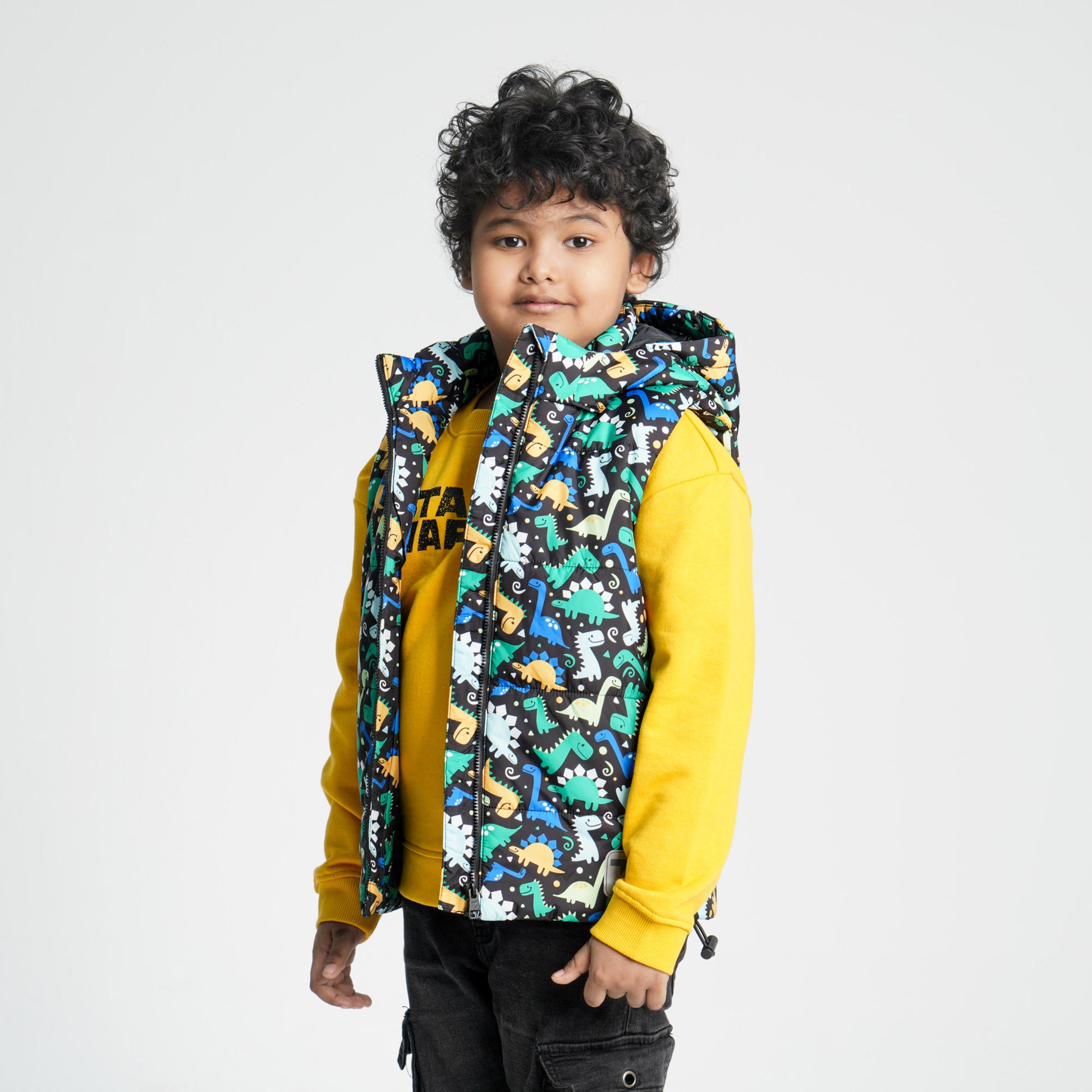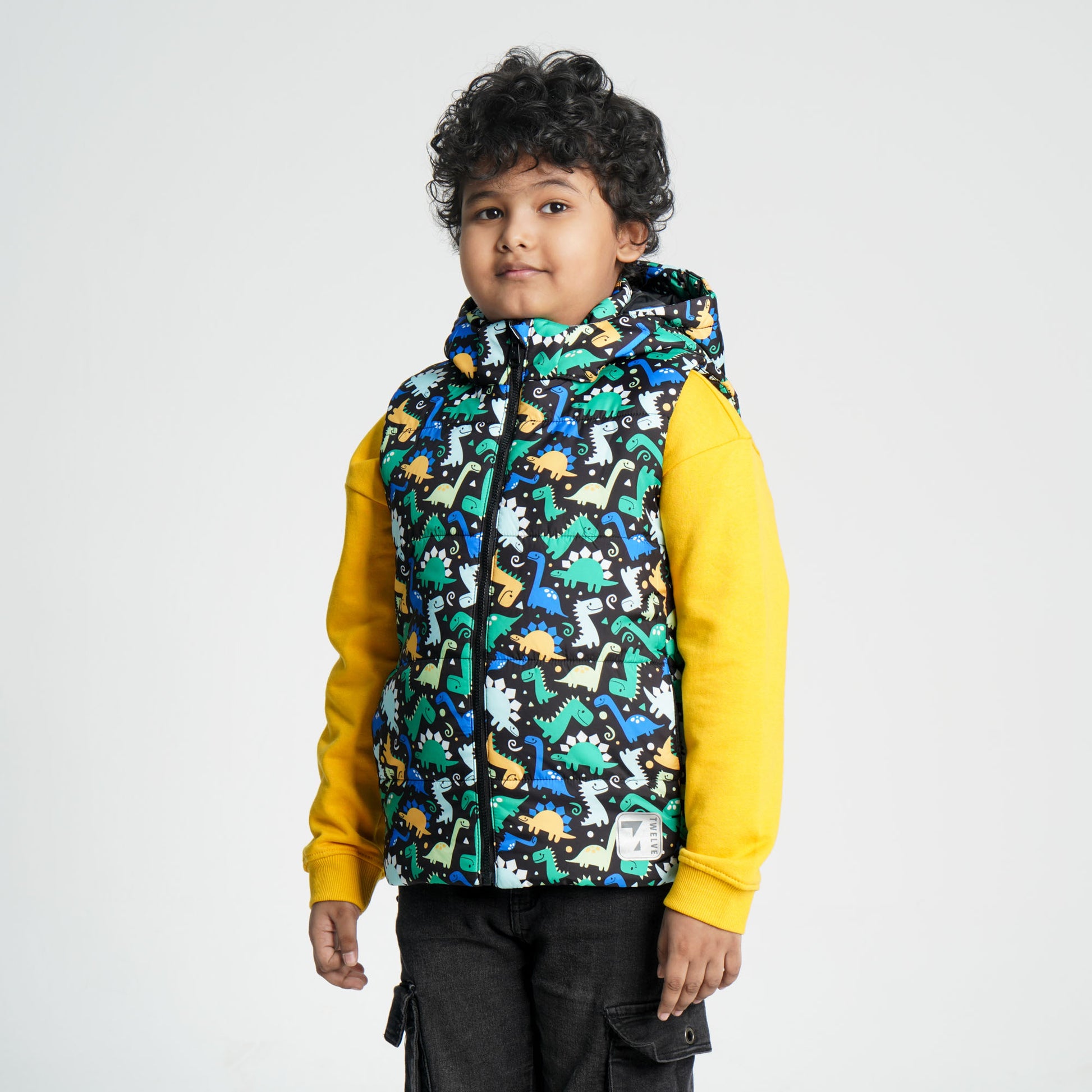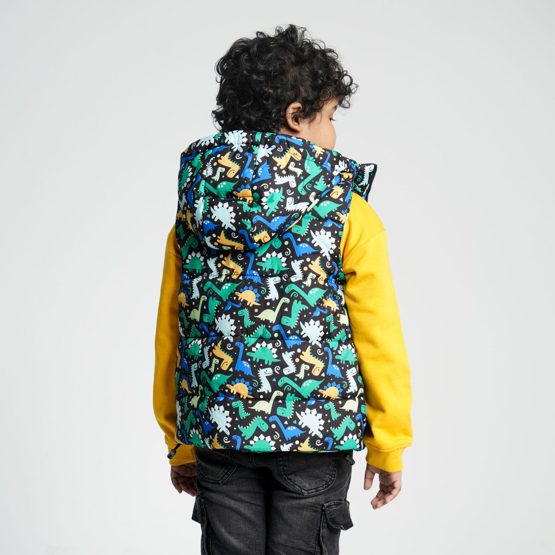 This baby boy's padded jacket features a fun printed design in black and green. It includes a hood, two pockets, and a zip closure for easy wear. Designed sleeveless with a straight hemline and soft lining for added comfort. Made from durable poly fabric, perfect for regular use.