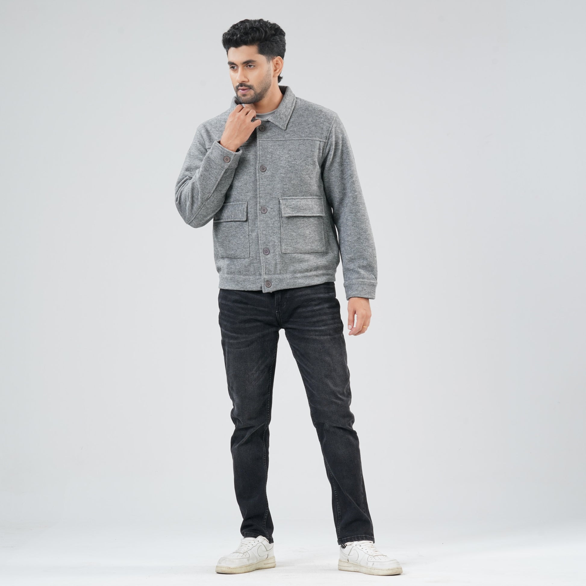 This men’s grey shacket is crafted from soft fleece fabric (66% polyester, 29% rayon, 3% wool, 2% spandex) for warmth and comfort. It features a classic spread collar, button closure, and two front pockets, with stylish chest cut-and-sew detailing for a modern touch. Long sleeves and a straight hemline complete the versatile design, making it ideal for casual everyday wear.