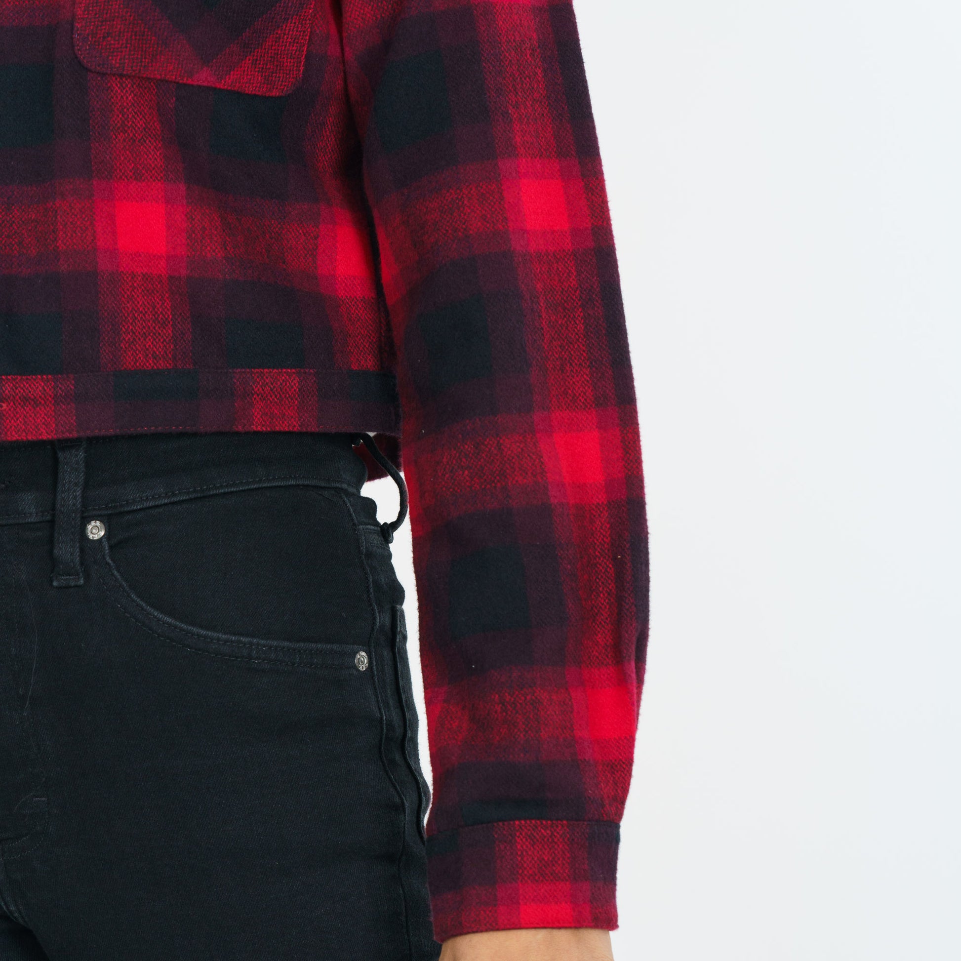 Stay stylish with this red checkered shacket, a perfect blend of shirt and jacket. Made from lightweight, non-padded fabric, it features a spread collar, button closure, long sleeves, and a straight hemline. Finished with a polyester lining for added comfort. Ideal for layering in cooler weather.