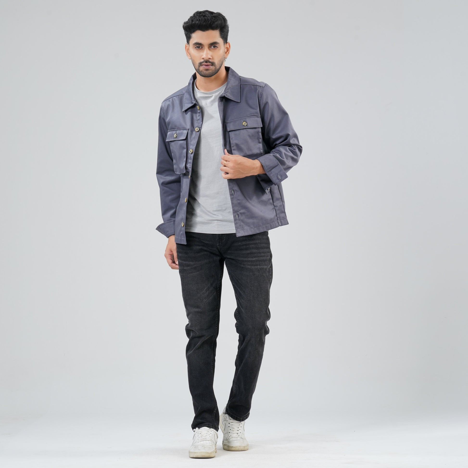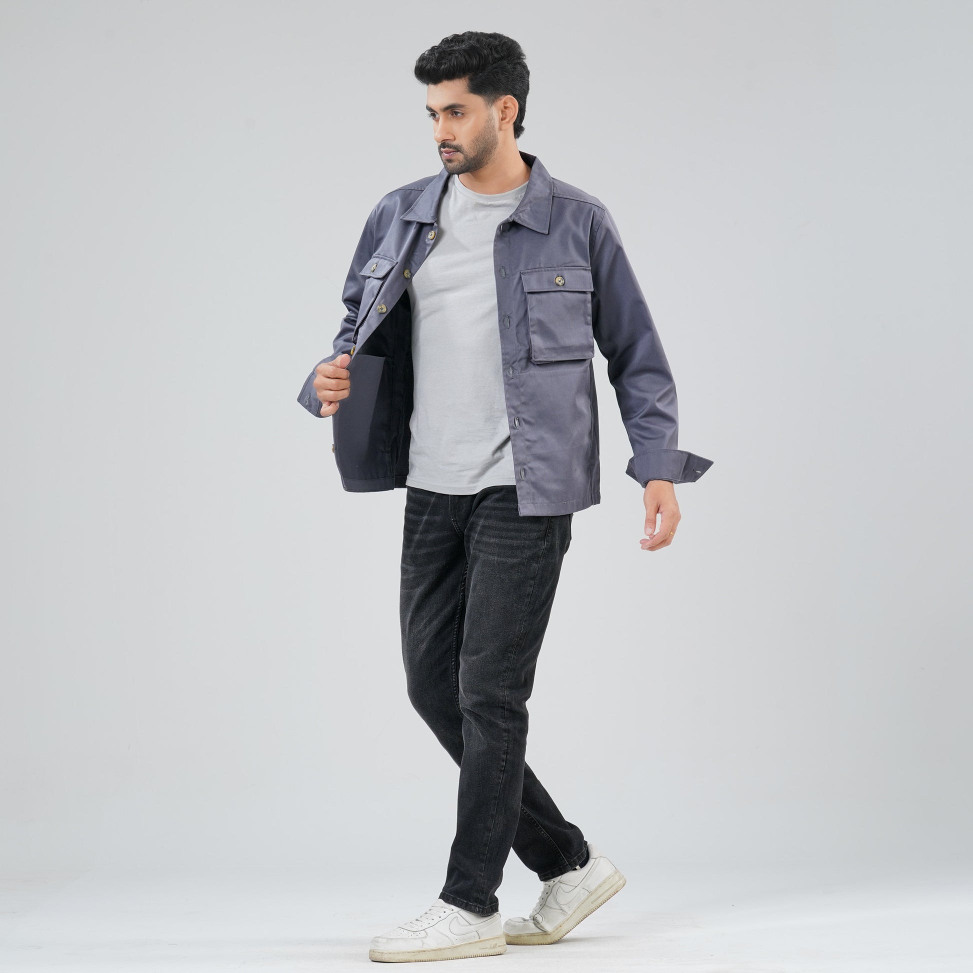 This men’s dark gray twill jacket features a spread collar and long sleeves with a straight hemline. It has two front pockets and a button closure for a classic look. Crafted from a blended lightweight fabric, it offers comfort and style for everyday wear.