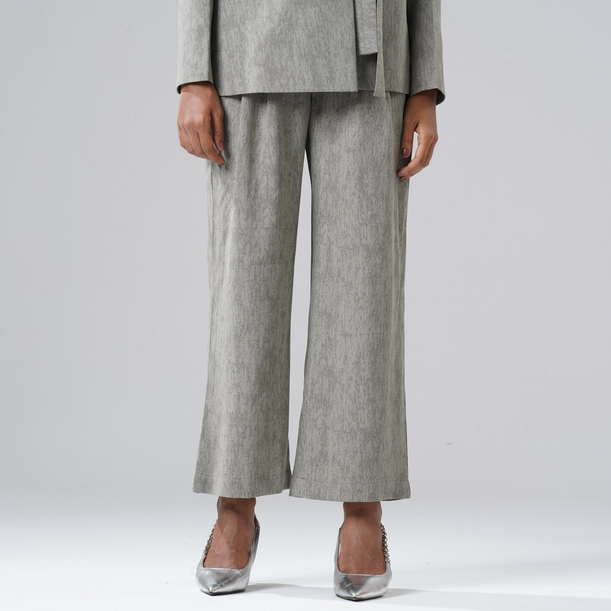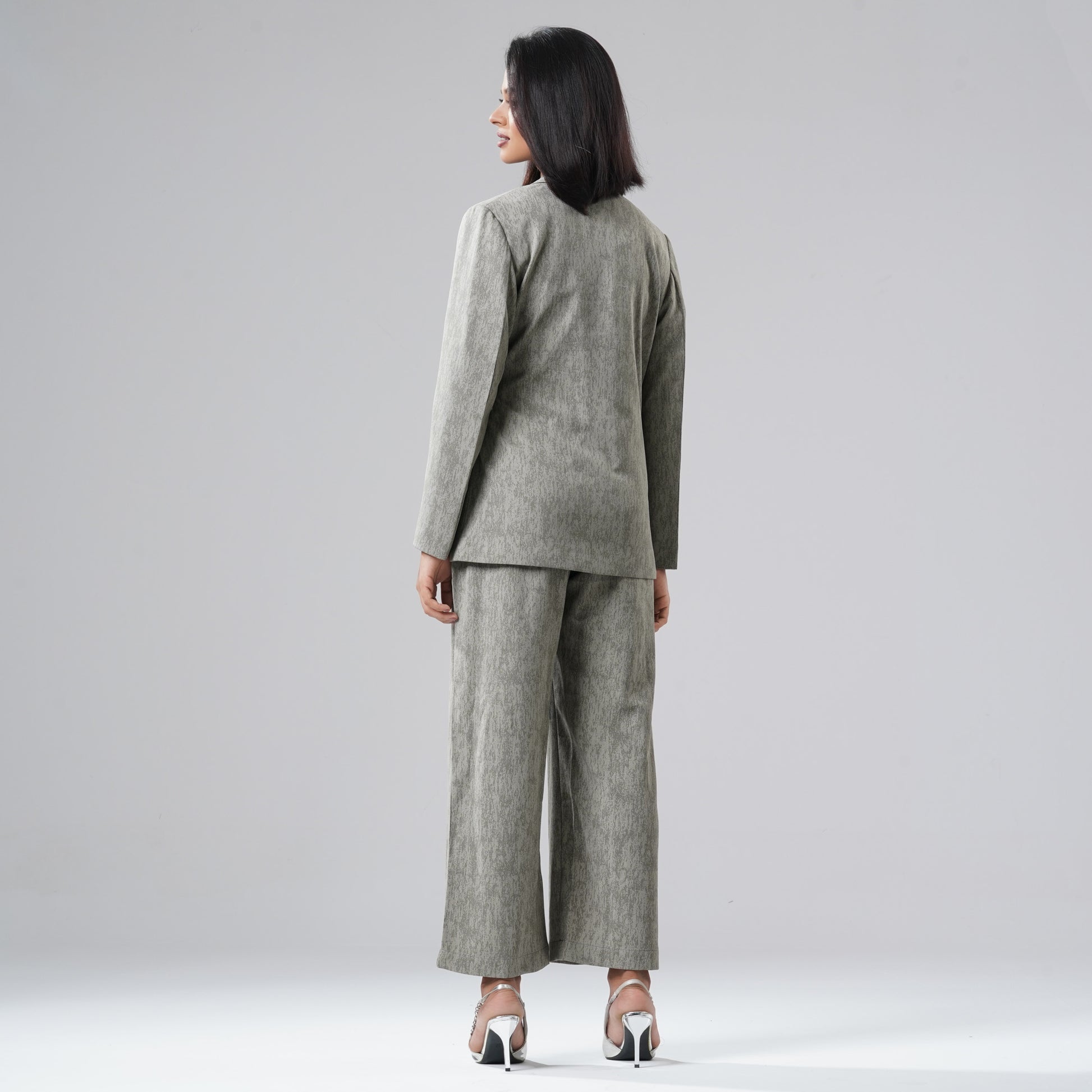 This stylish two piece set features a wrap-style blazer paired with straight-fit pleated trousers. The blazer comes with a single-breasted front, notched lapel collar, and a flattering tie-waist detail for an elegant silhouette. The matching trousers include soft pleats and functional side pockets for added comfort and practicality. Crafted from textured georgette fabric, this set offers a refined look perfect for festive events, workwear, or special occasions.