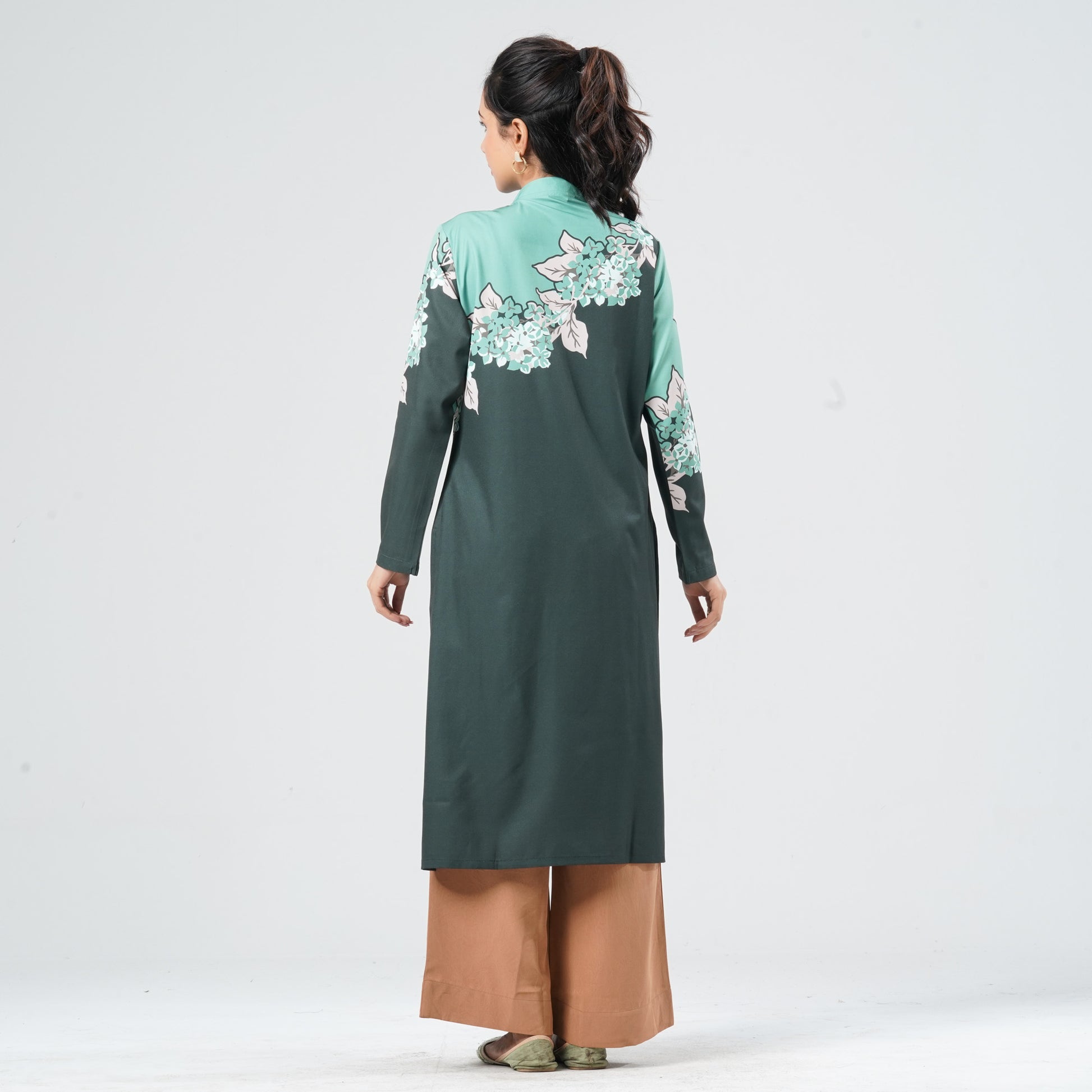 This women’s pistachio green ethnic two-piece set features a straight-cut kameez with elegant sublimation print detailing. The bottom hem flared pant adds a graceful silhouette, enhanced with subtle sequin work for a refined touch. Crafted from blended silk for the kameez and soft viscose for the pant, it offers both comfort and style. Perfect for festive occasions and special gatherings.