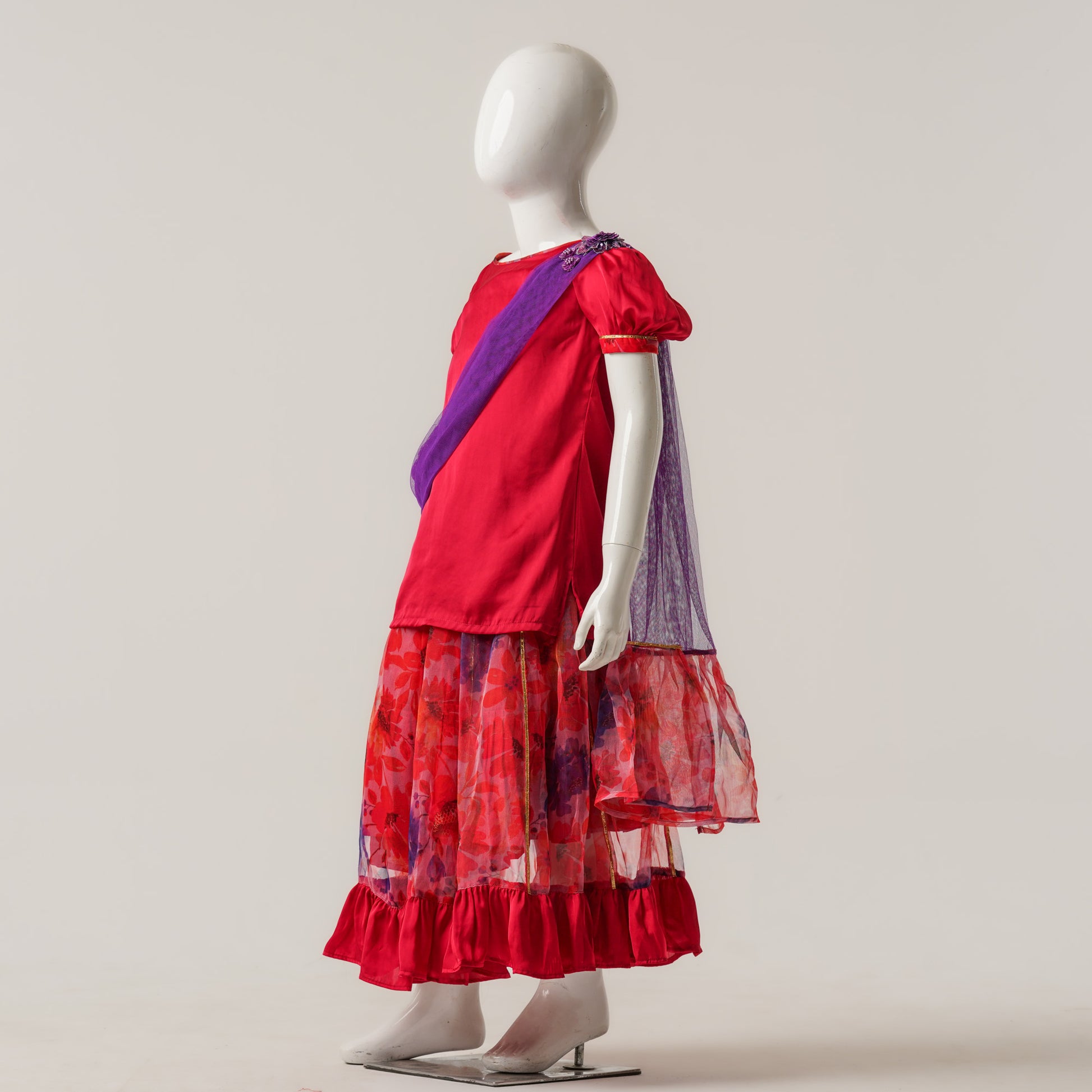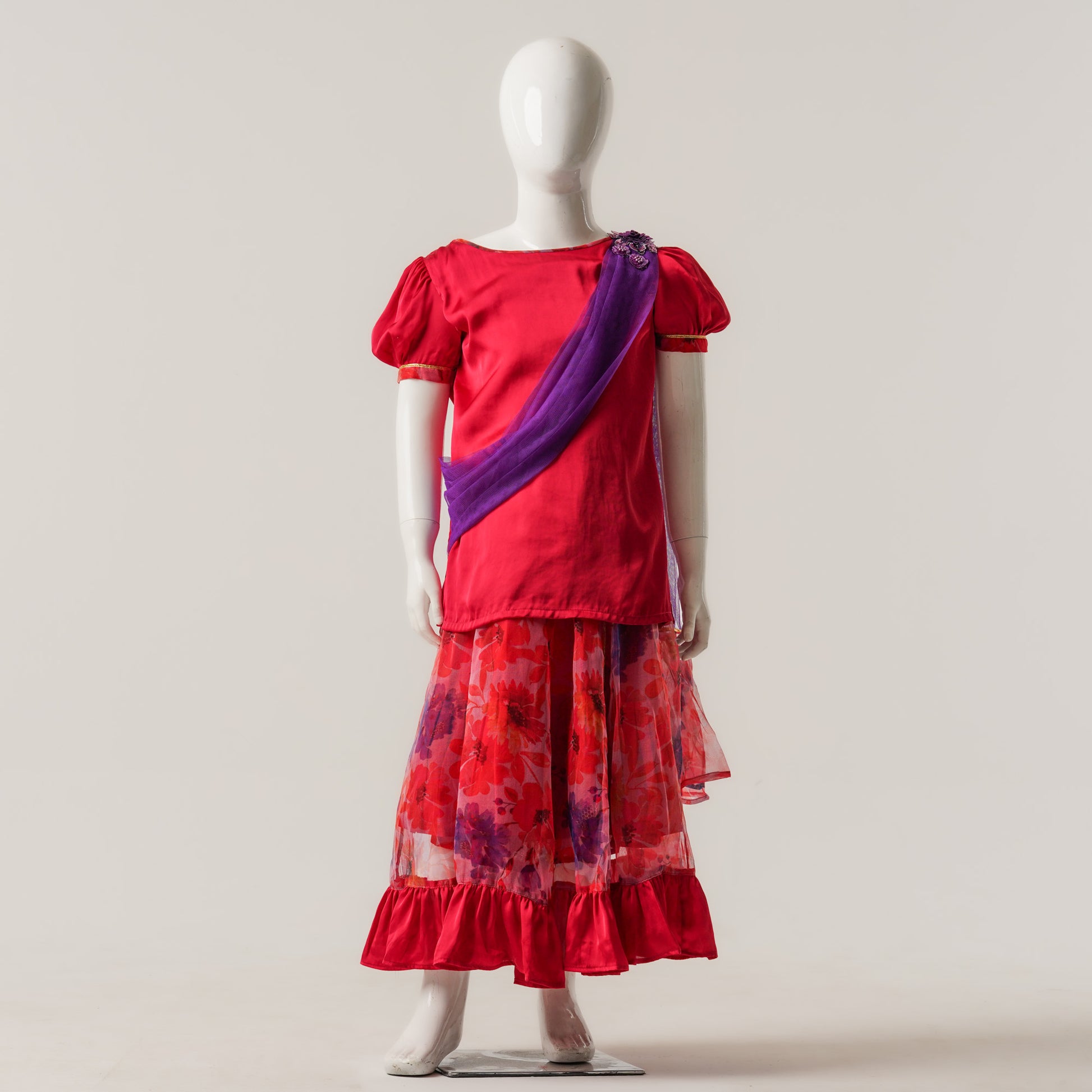 A festive three piece set ensemble crafted from silk, organza, and mesh. Features an elegant panel skirt with ruffles, floral patch detailing, and an attached dupatta for a graceful look perfect for any celebrations and special occasions.