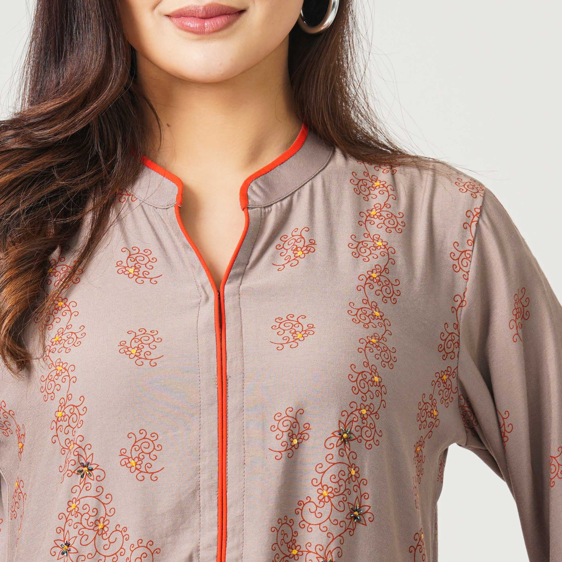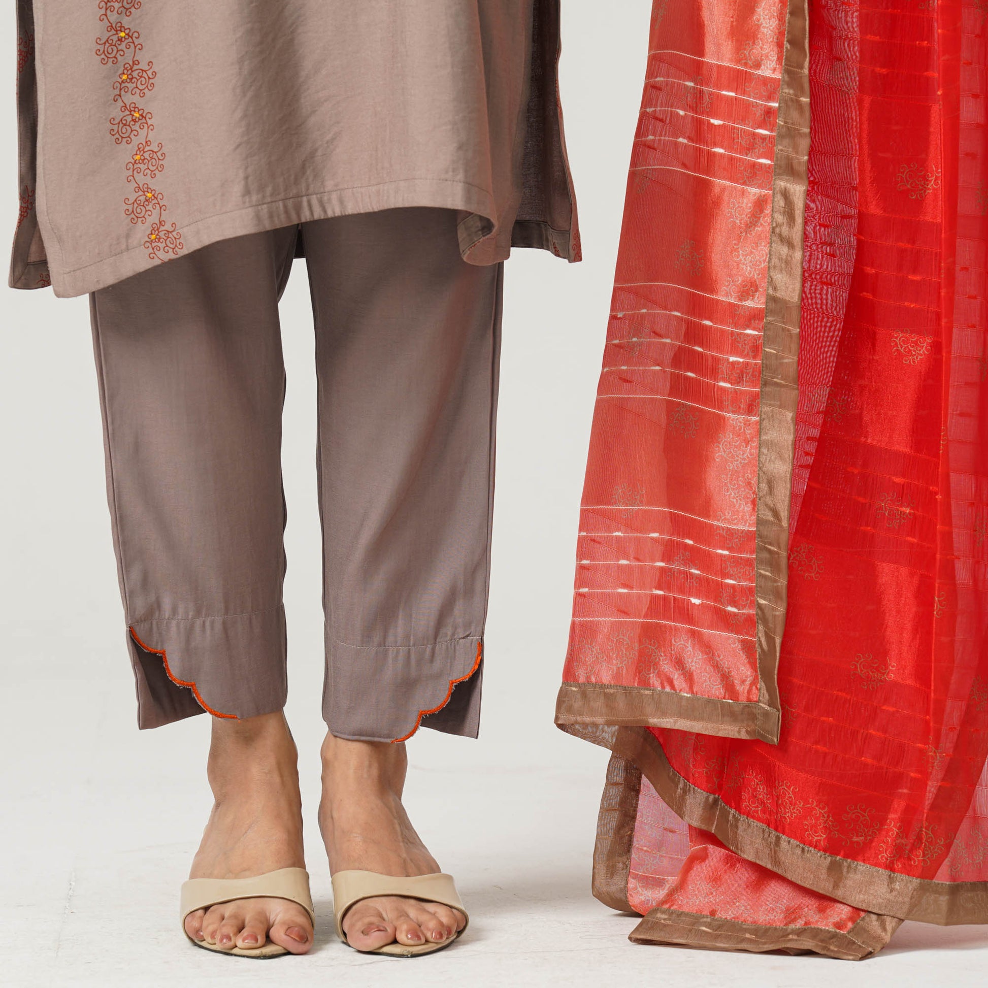 This elegant three-piece set features a comfortable straight-cut cashmilon top with a mandarin collar and subtle burnt-orange piping. The matching pant is finished with scalloped embroidered hems, while the floral screen-printed front is enhanced with delicate golden kardana beadwork. Paired with a burnt-orange georgette dupatta, this outfit offers a refined look for festive and casual wear.