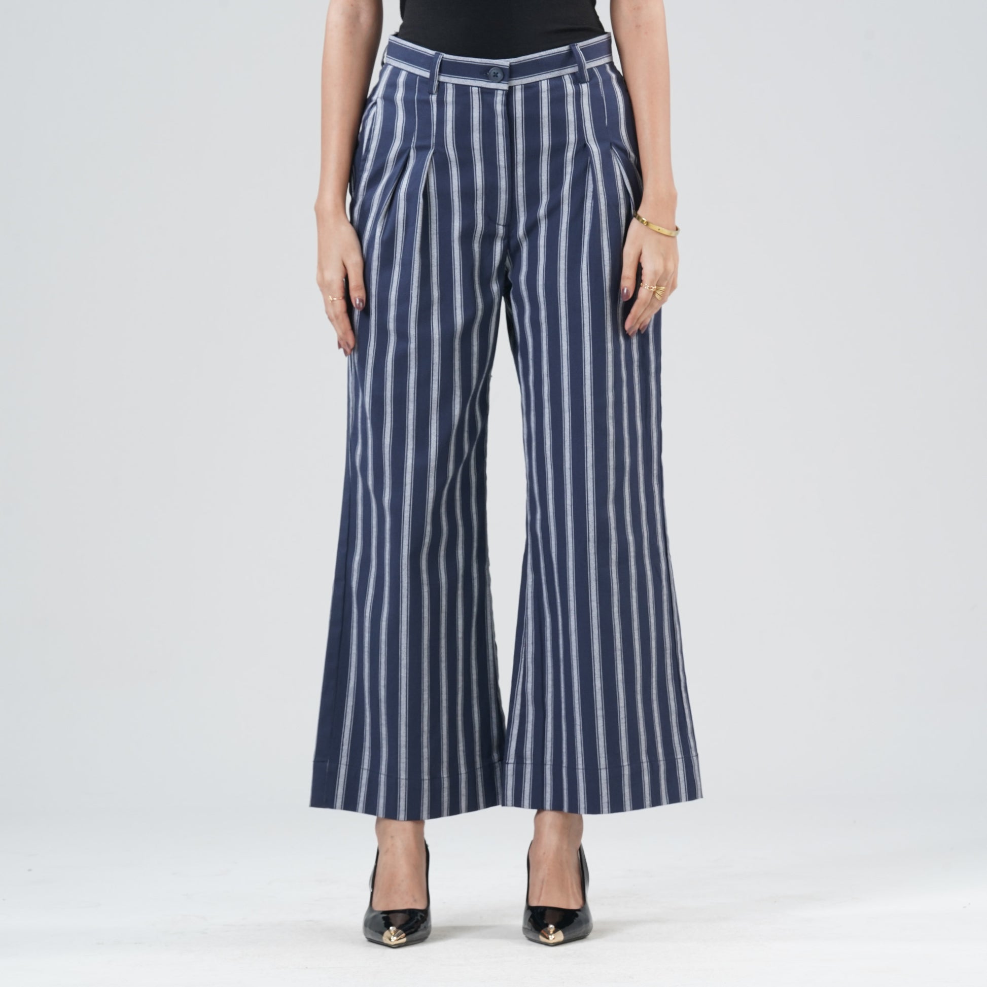 Women’s navy bottom crafted from soft blended fabric for comfort and durability. Designed with a high-rise waist and a wide-leg silhouette for a flattering, modern fit. Features prominent front pleats that add structure and elegance. Finished with a zip fly and button closure, making it suitable for both formal and smart-casual styling.