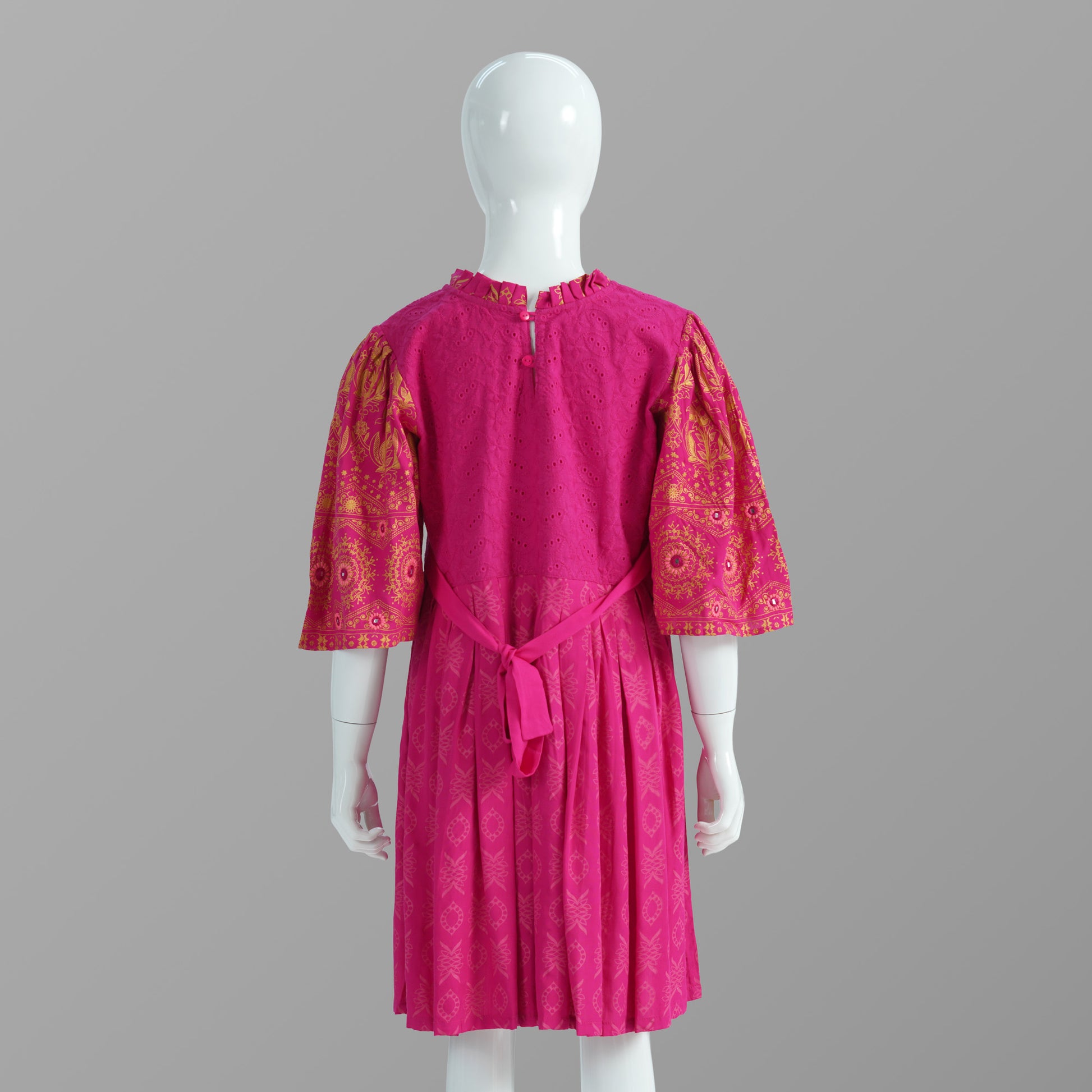 Charming pink girls frock crafted from soft linen fabric for comfort and breathability. Features elegant screen prints that add a playful yet stylish touch. Designed in a regular fit, perfect for casual outings, festive occasions, or family gatherings.