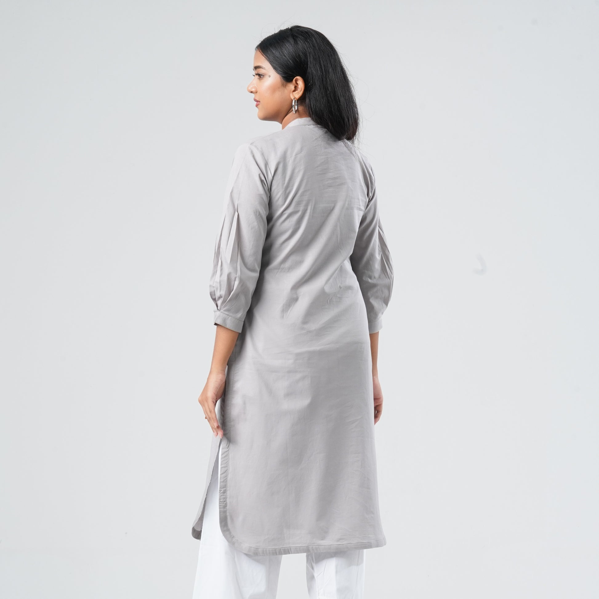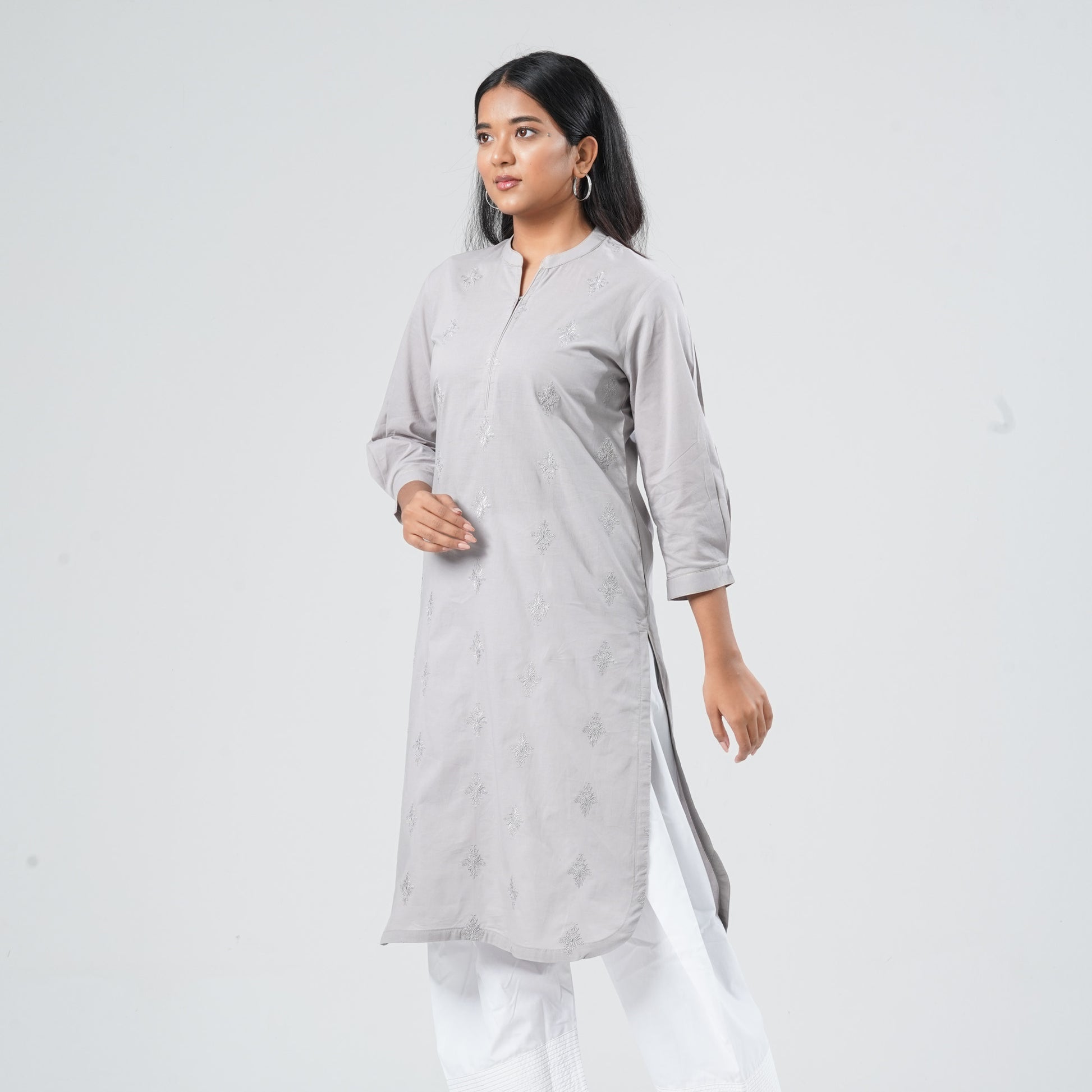 This cotton Kurti features a classic mandarin-collar silhouette for a clean and structured look. The front body is adorned with allover embroidery, adding texture and refined detailing. Soft, breathable cotton ensures all-day comfort, making it ideal for both casual and semi-ethnic wear. A versatile piece that blends simplicity with elegant craftsmanship.
