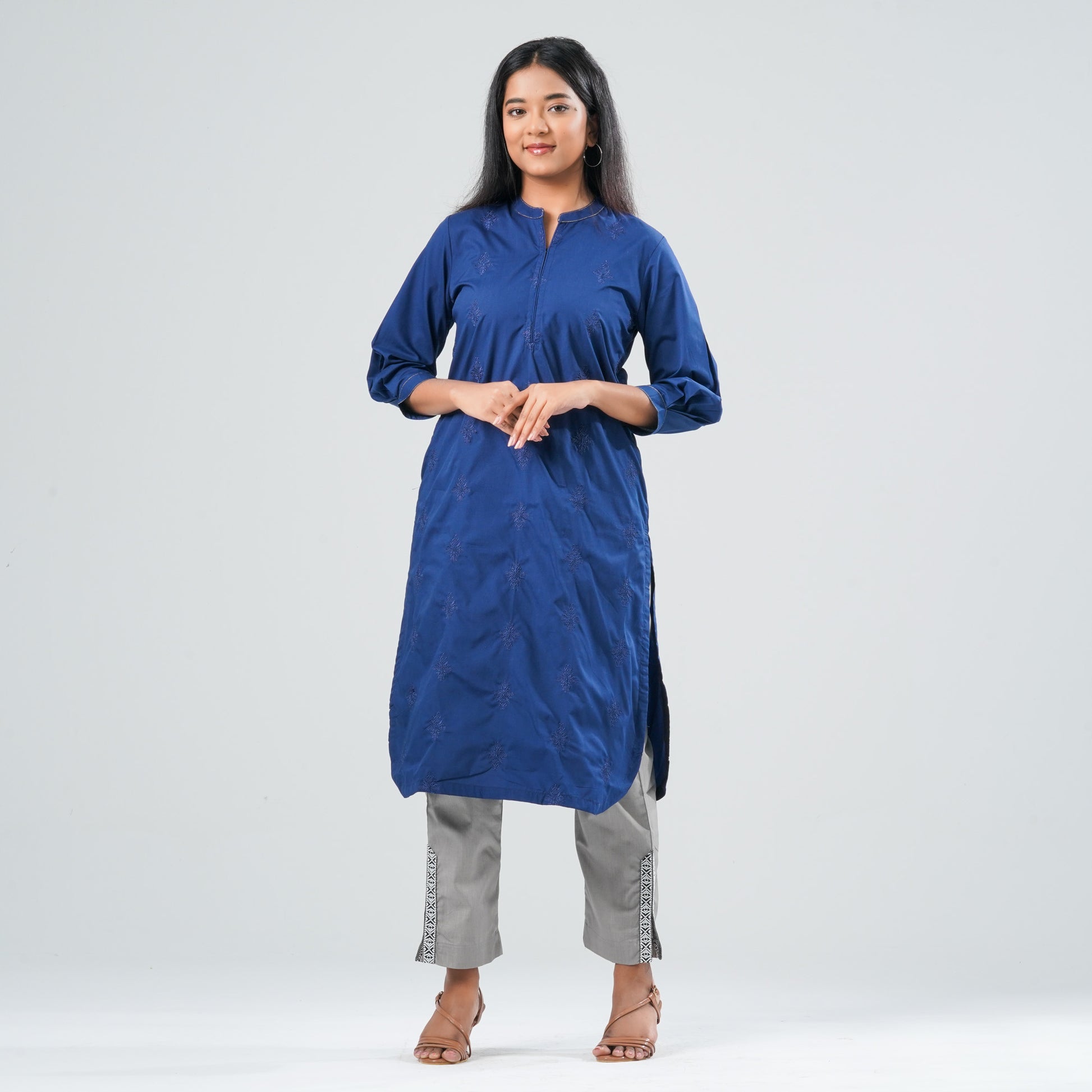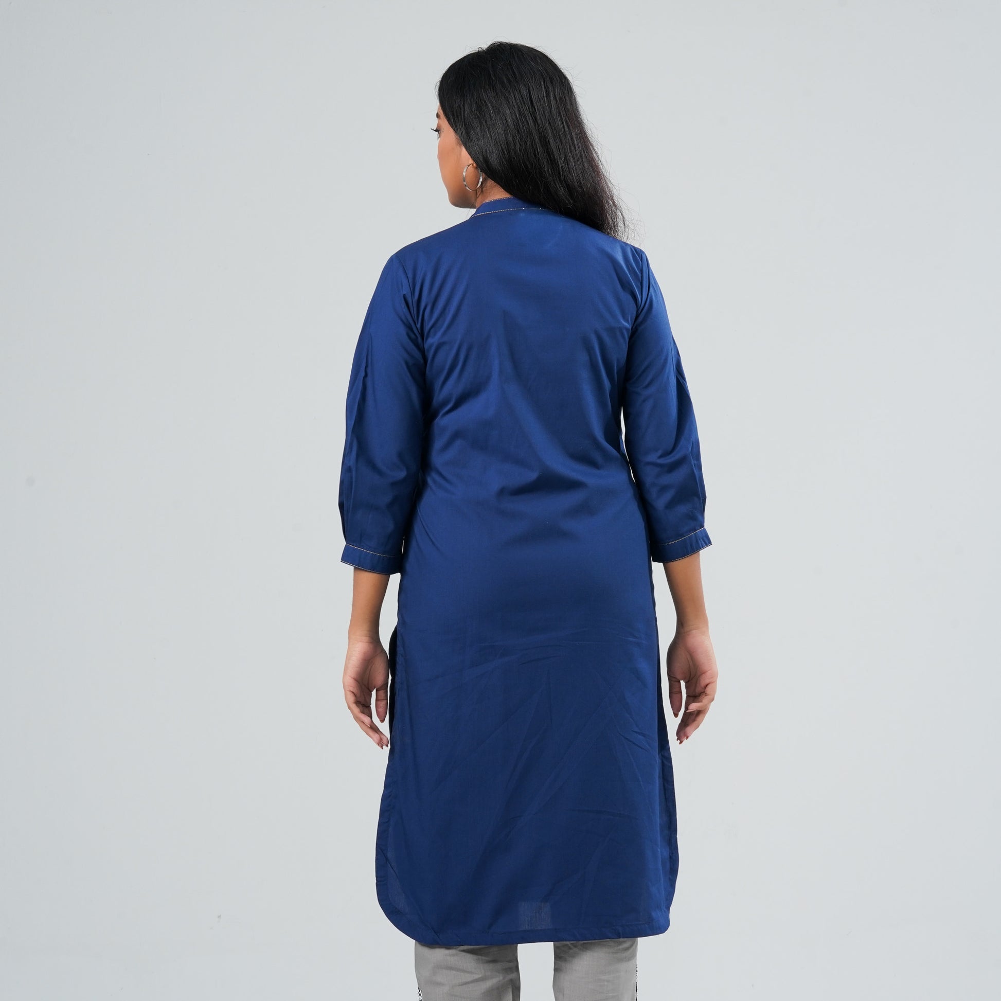 This cotton Kurti features a classic mandarin-collar silhouette for a clean and structured look. The front body is adorned with allover embroidery, adding texture and refined detailing. Soft, breathable cotton ensures all-day comfort, making it ideal for both casual and semi-ethnic wear. A versatile piece that blends simplicity with elegant craftsmanship.