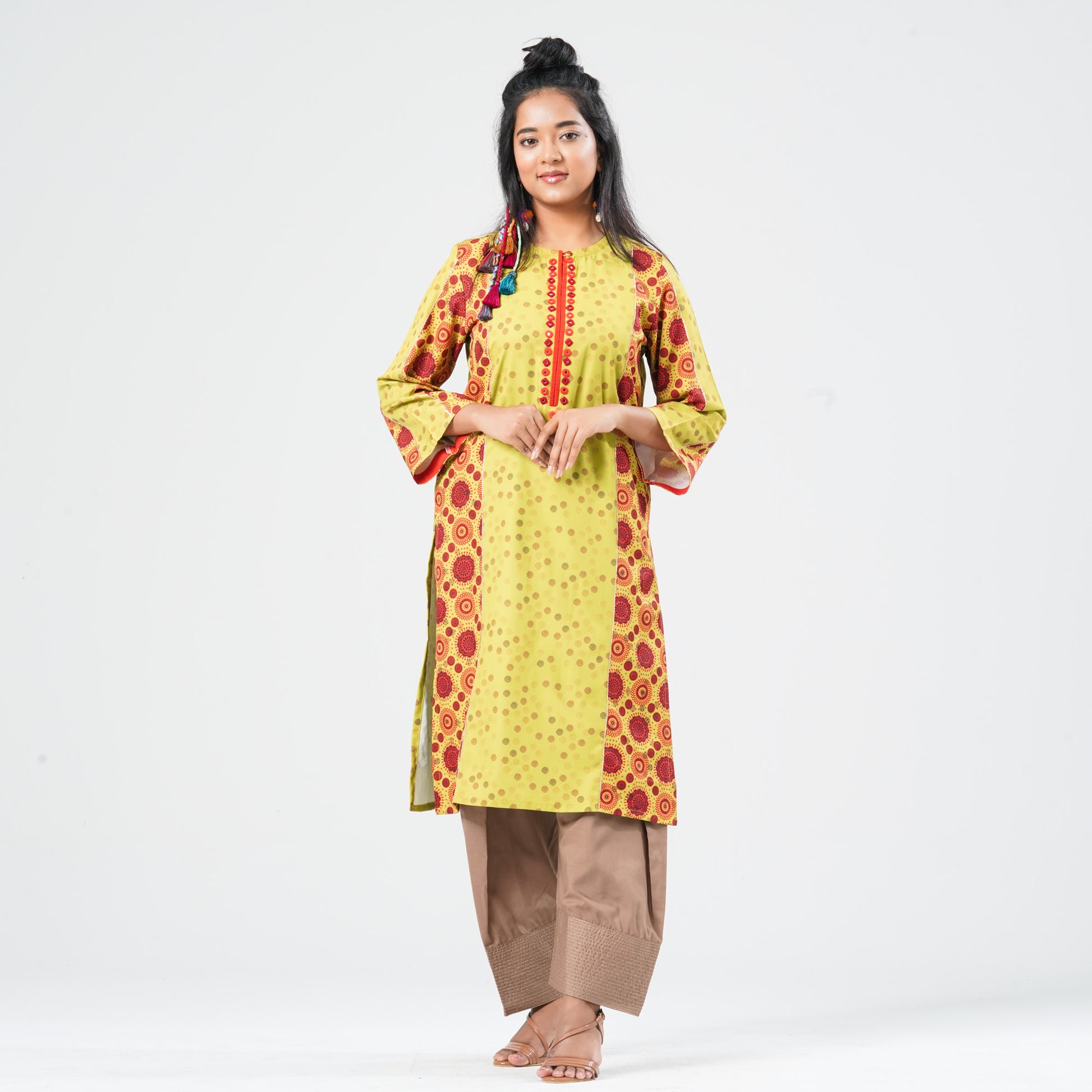 Elegant blended silk Kurti with a round neck and straight cut silhouette. Features a vibrant digital print and delicate glass embroidery on the yoke, perfect for casual or semi-formal occasions.