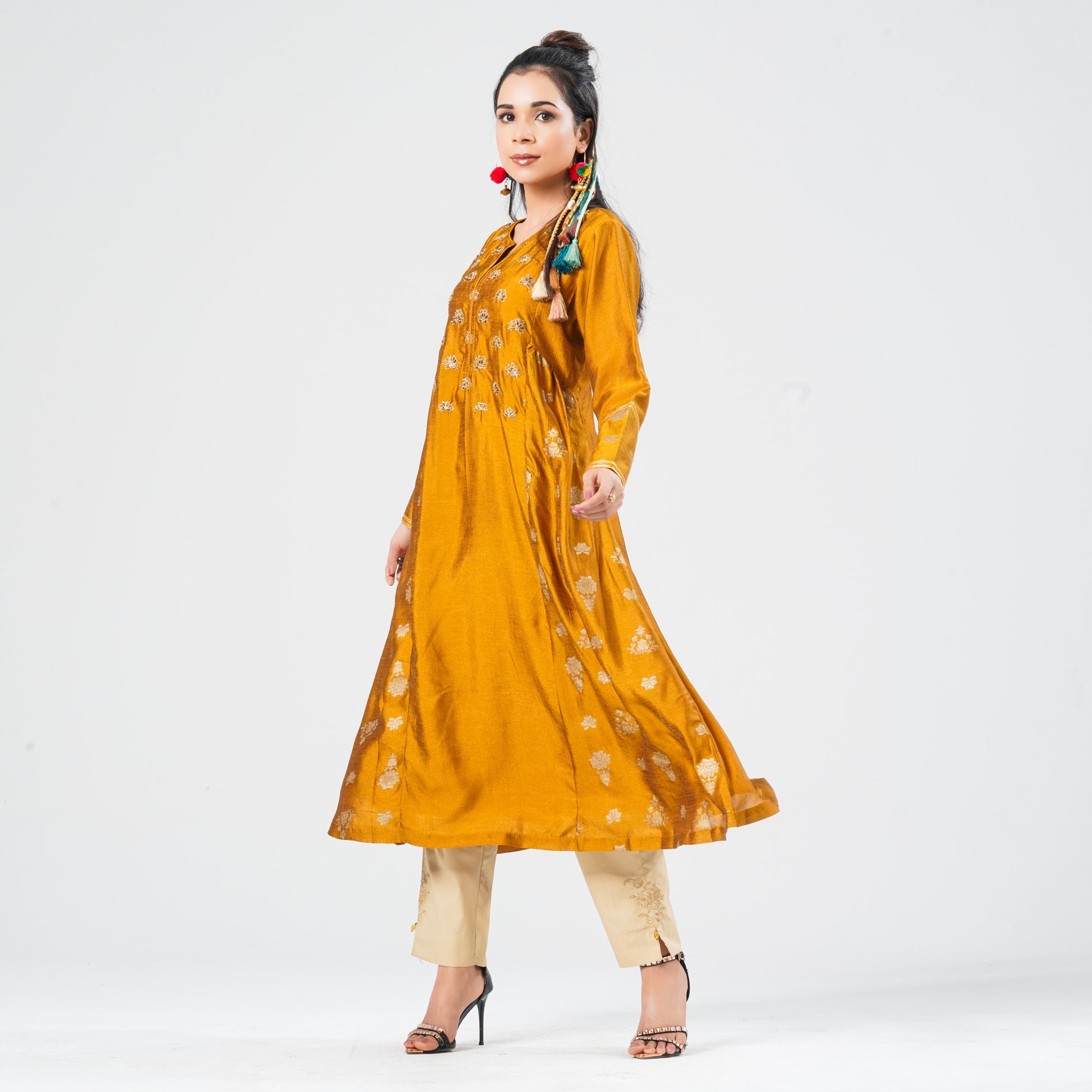 Elegant double-layer Kurti crafted from soft silk georgette for a luxurious feel. Features a flattering round neck and flared hem that adds graceful movement. The Kurti is adorned with a carefully placed print and delicate embroidery on the sleeves, enhanced with golden ribbon lace for a touch of sophistication. Perfect for festive occasions, casual outings, or semi-formal events, this Kurti combines comfort with stylish elegance.