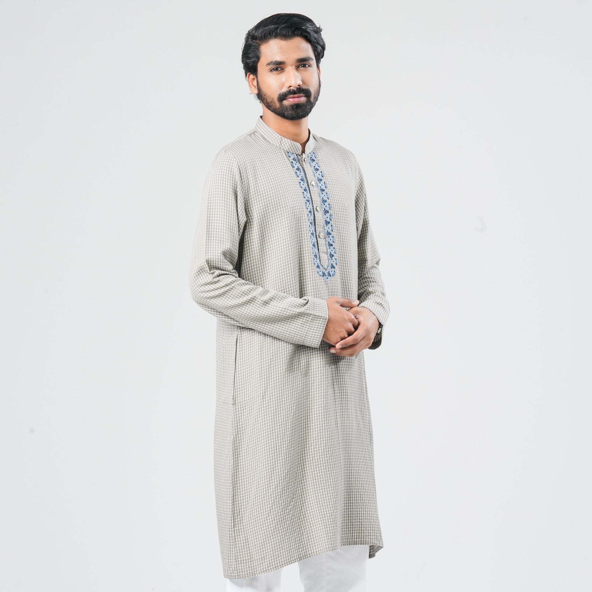 This men’s cotton panjabi features a clean and basic design that delivers a smart masculine appeal. Made from breathable cotton fabric, it ensures comfort and ease of wear throughout the day. Its semi-formal look makes it suitable for office wear, casual outings, or social gatherings. Pair it with trousers or pajama for a refined and versatile ethnic style.