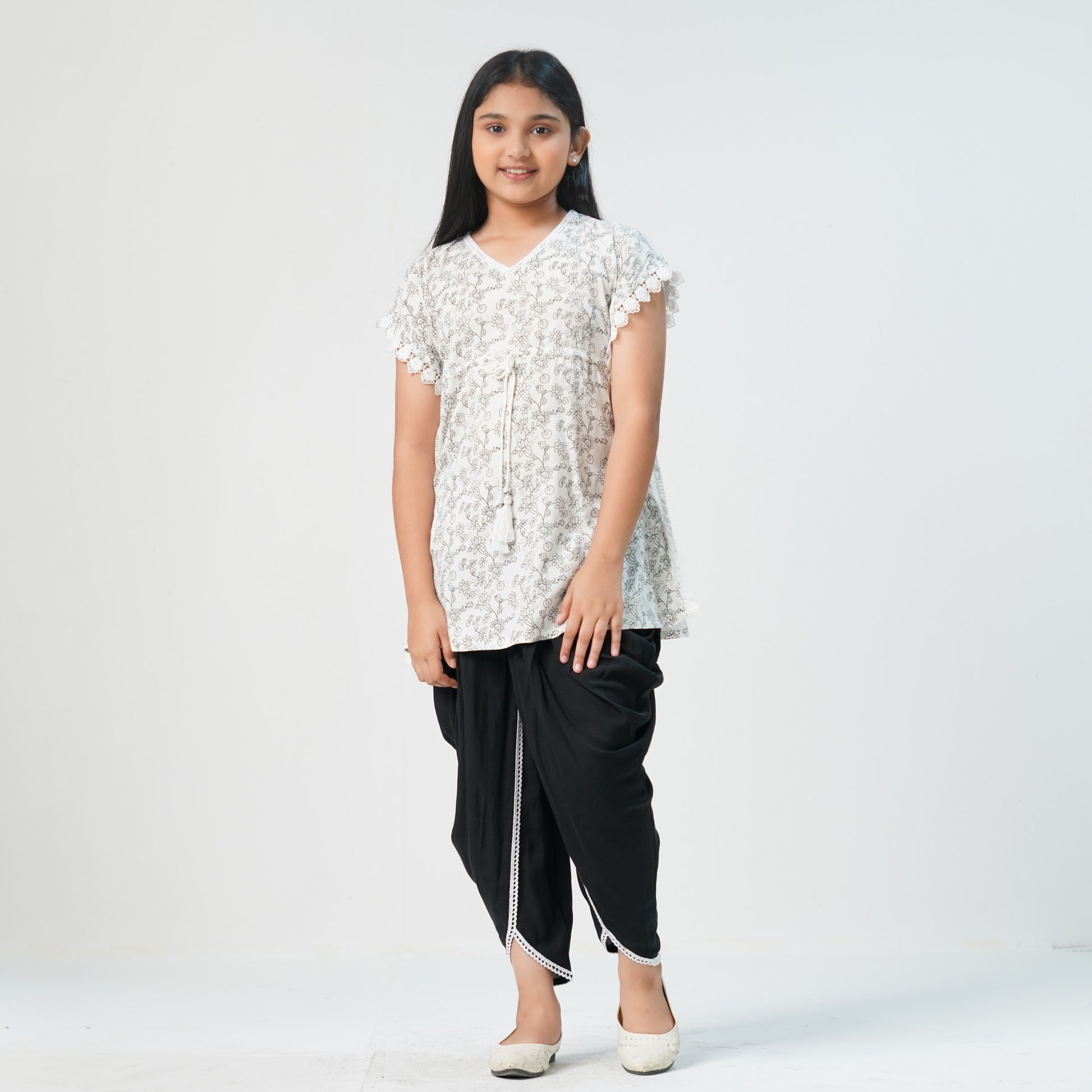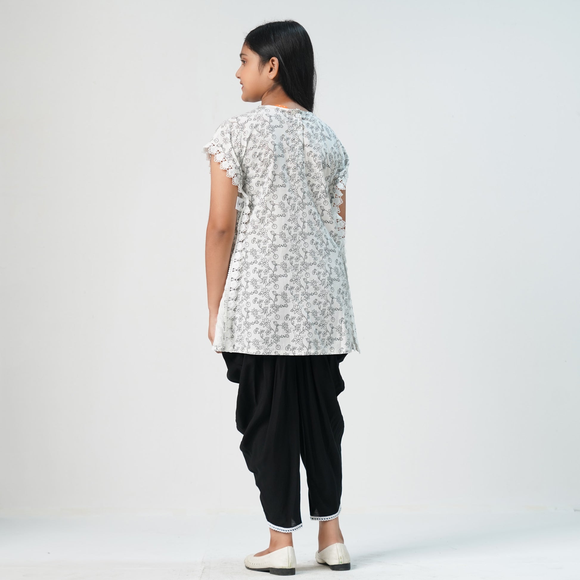 Elevate your little girl's wardrobe with this elegant white and black 2-piece set. Featuring delicate lace embellishments for a touch of luxury, the stylish printed top pairs beautifully with the comfortable cotton-blended fabric. Perfect for any occasion, this ensemble blends sophistication with everyday charm.