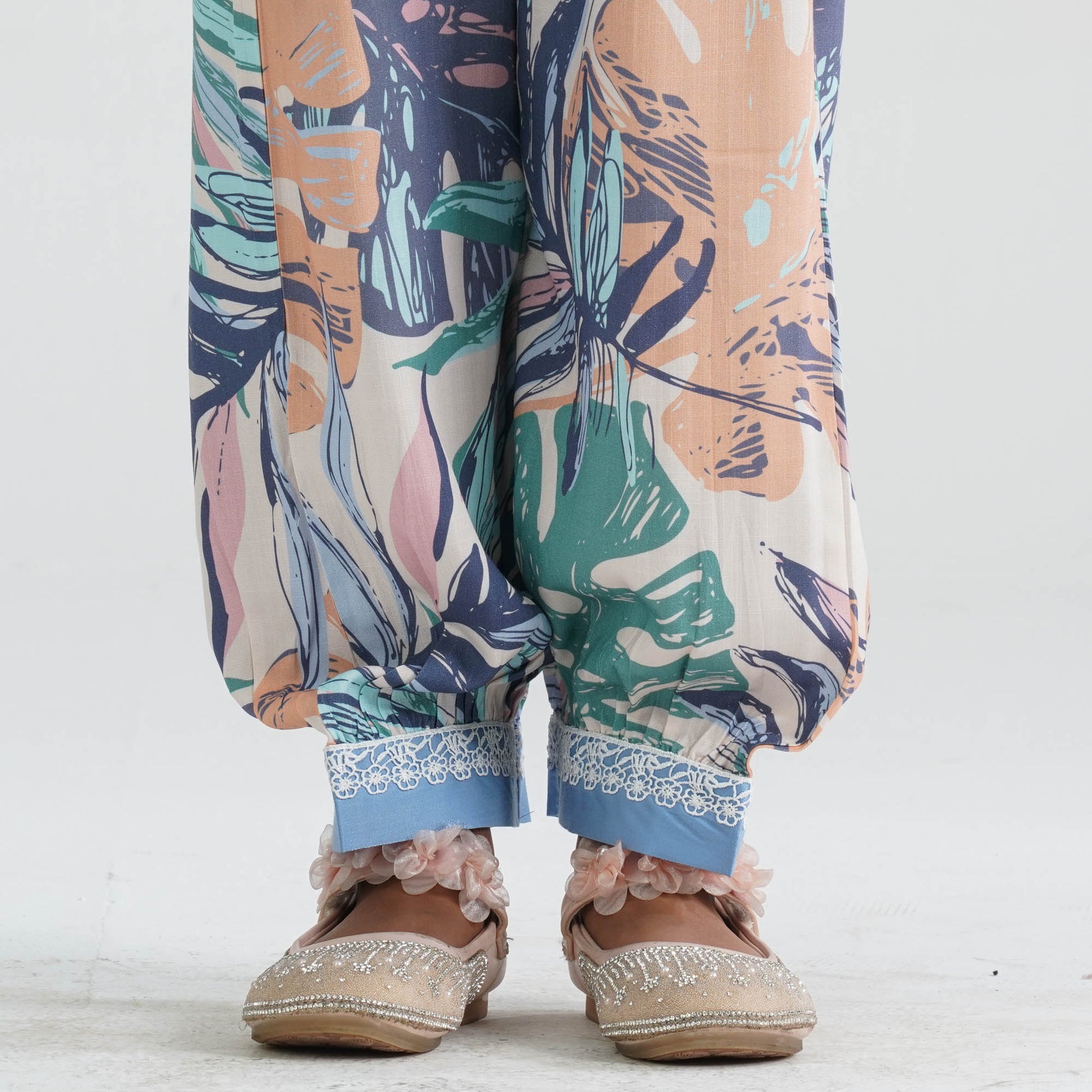 Crafted from shimmery woven fabric for the kaftan-style top and printed viscose for the baggy pant, this girl’s blue two piece ethnic set offers comfort with festive elegance. The flowy kaftan top is beautifully detailed with embroidery, sequin accents, and delicate lace for added charm. The relaxed baggy pant ensures easy movement while maintaining a trendy traditional look. Perfect for festive celebrations, cultural programs, and special occasions.