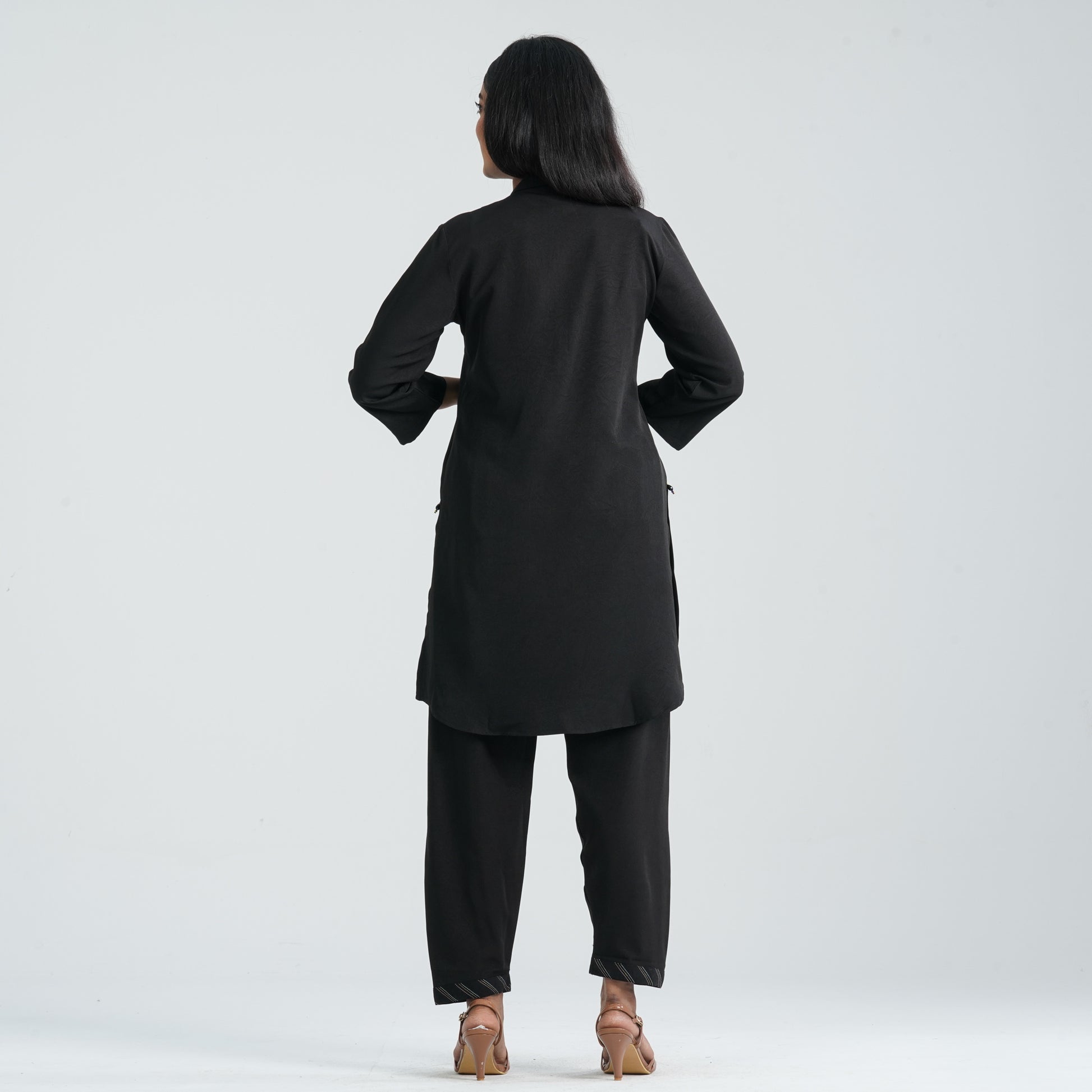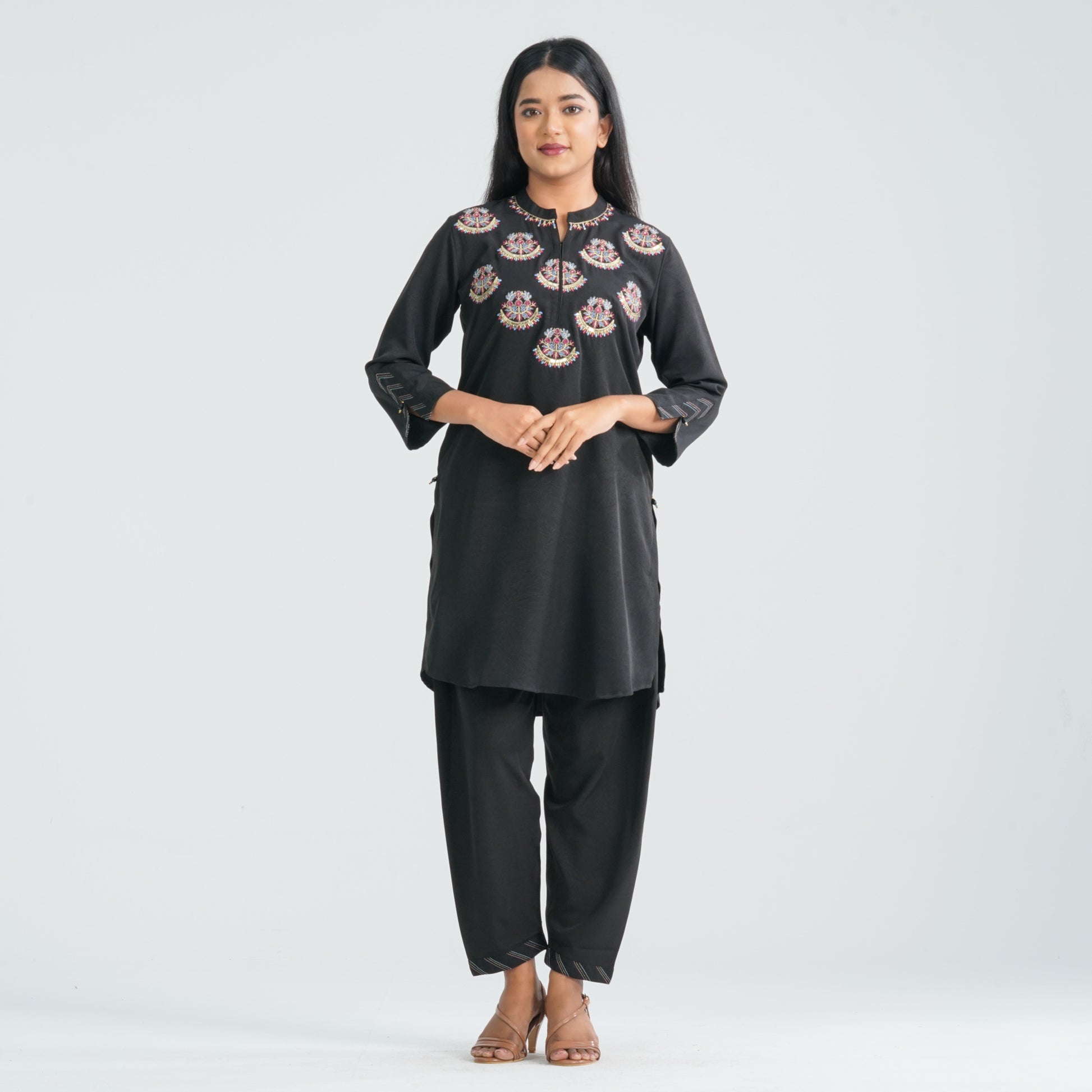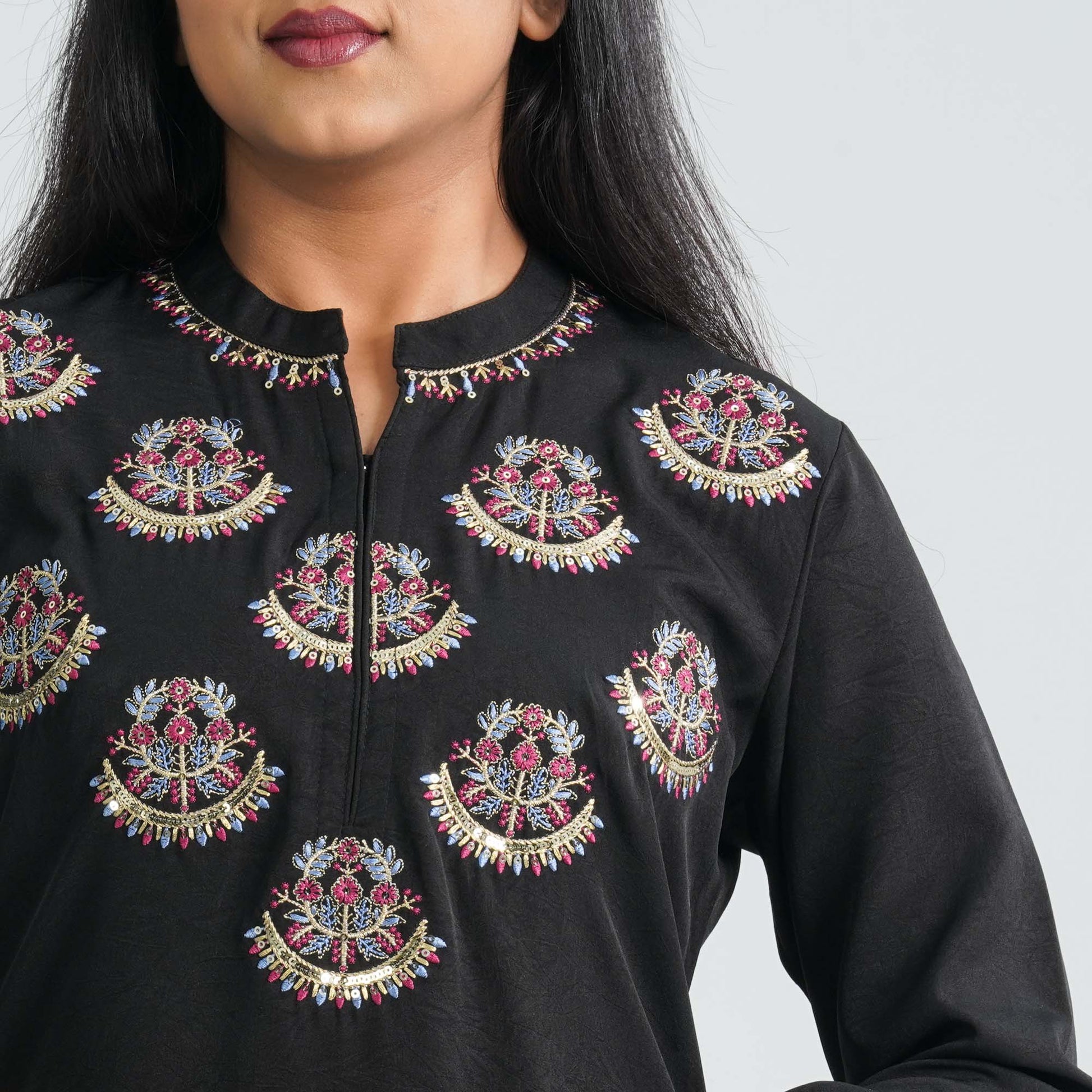 Crafted from soft crinkle georgette, this ethnic two piece set features a Mandarin-collar Kurti in a straight silhouette paired with a matching straight-cut pant. Sequin embroidery adds subtle sparkle, complemented by refined run-stitch detailing. Lightweight, elegant, and perfect for festive or semi-formal occasions.