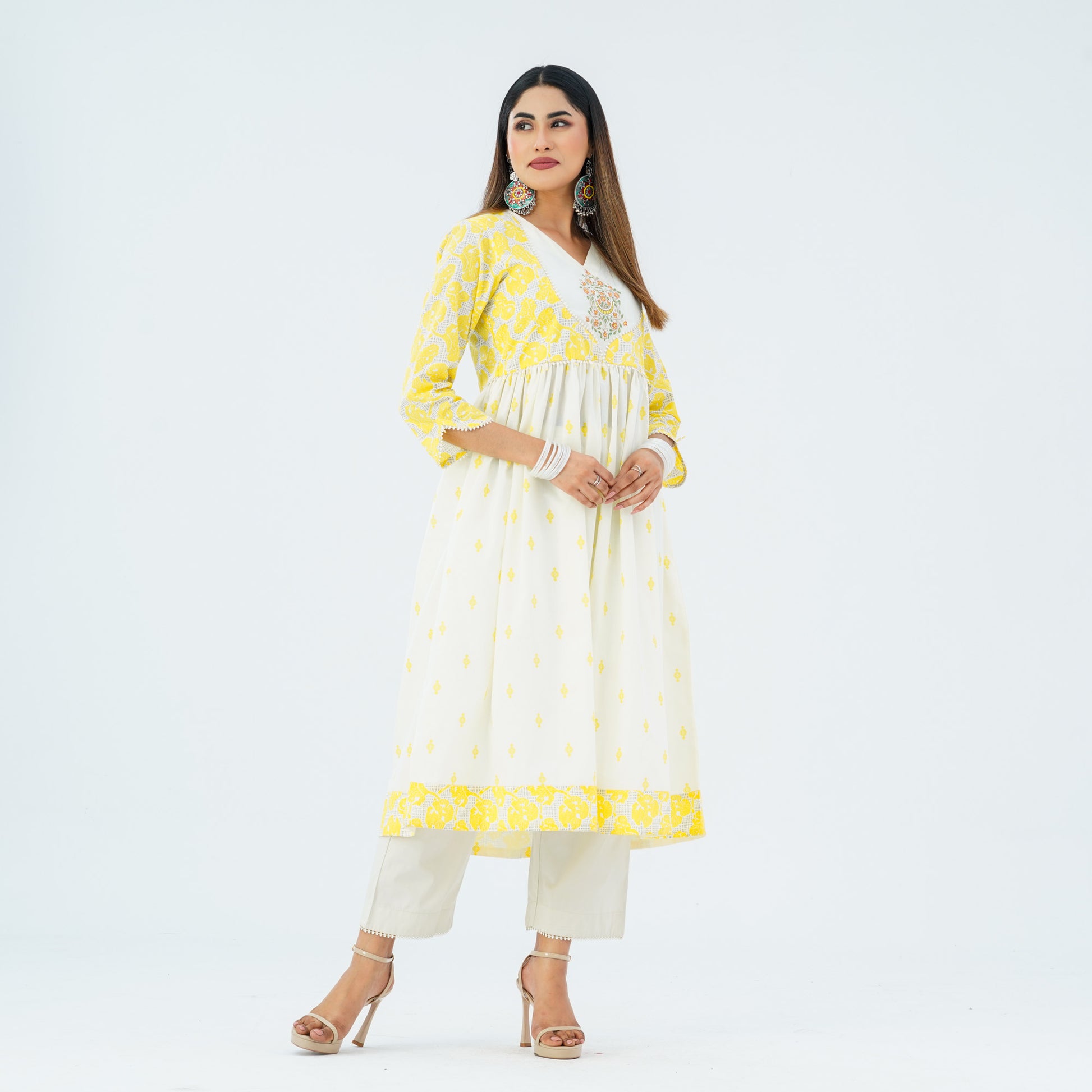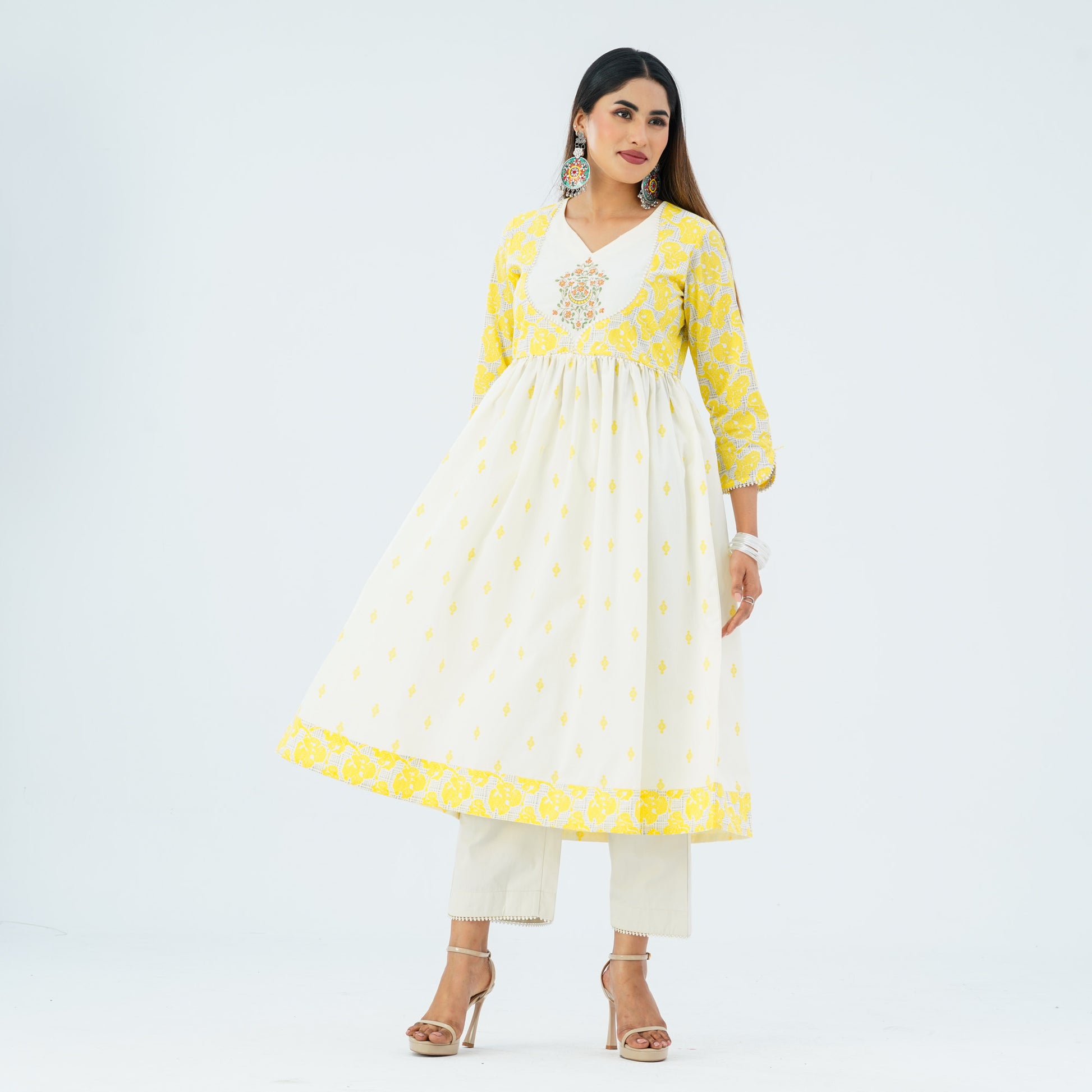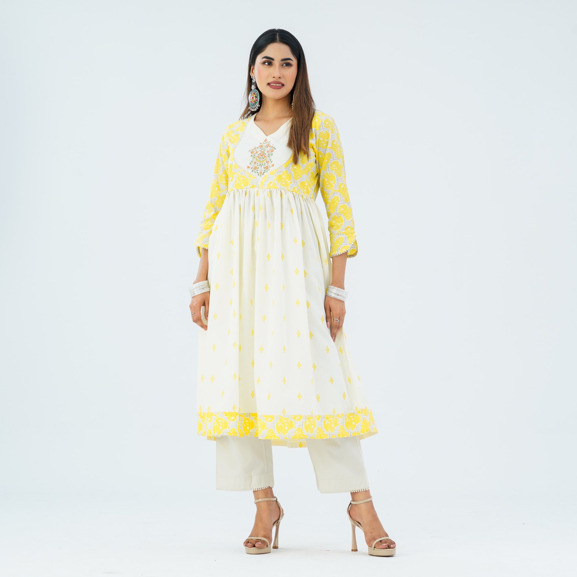 This elegant two piece is crafted from blended cotton and features a flared hem with patch border for a graceful koti style. The gown is adorned with screen prints and decorative embroidery, adding a refined ethnic charm. Perfect for festive occasions, cultural gatherings, and semi-formal celebrations.