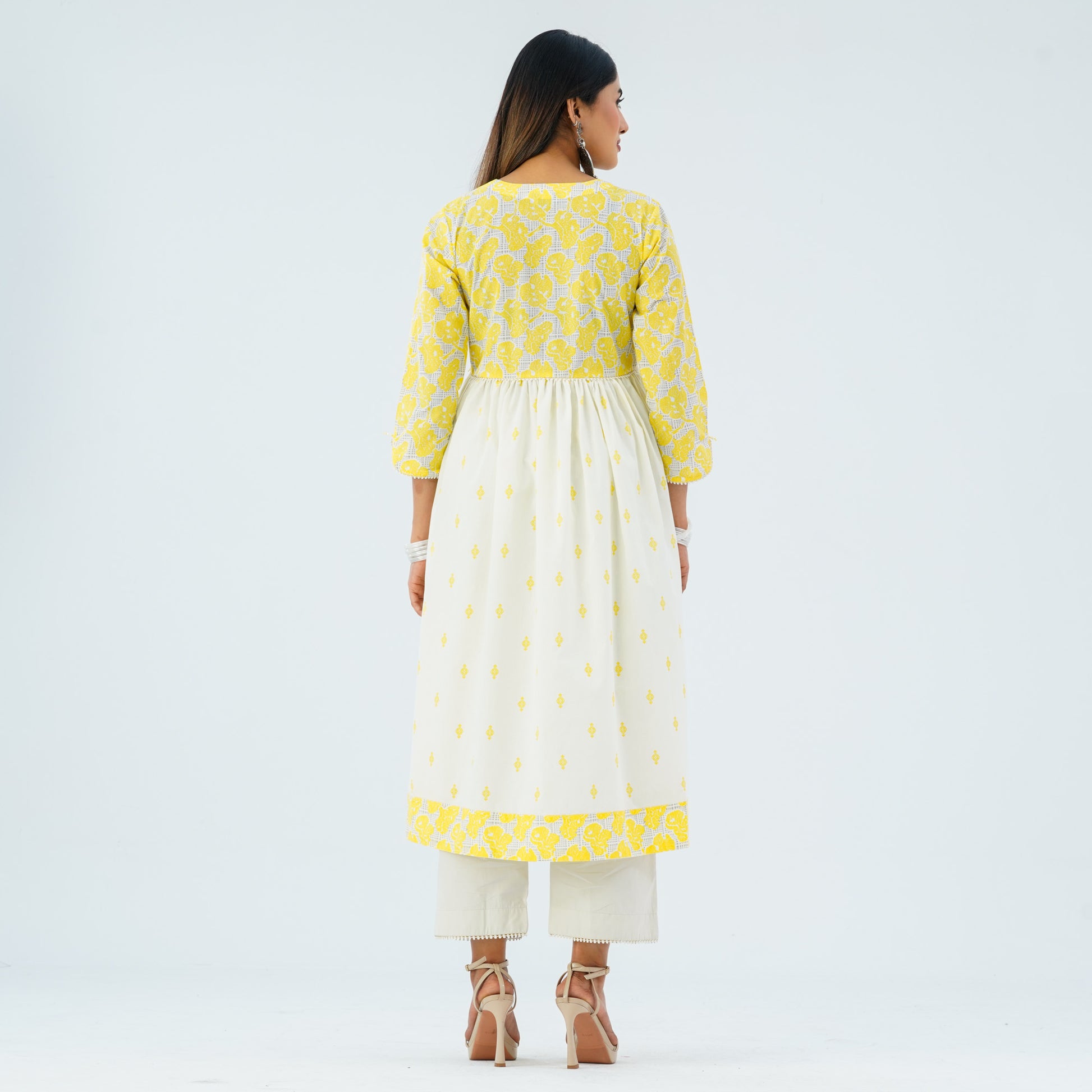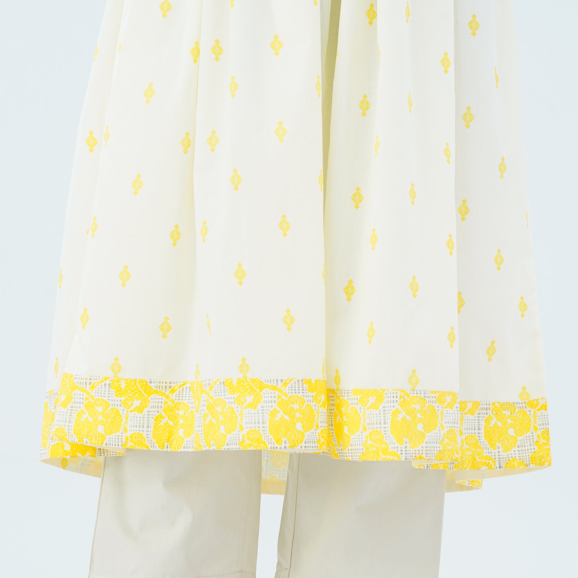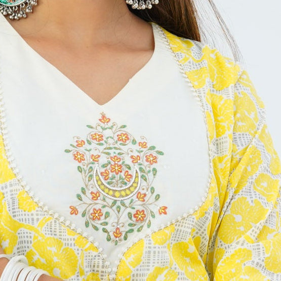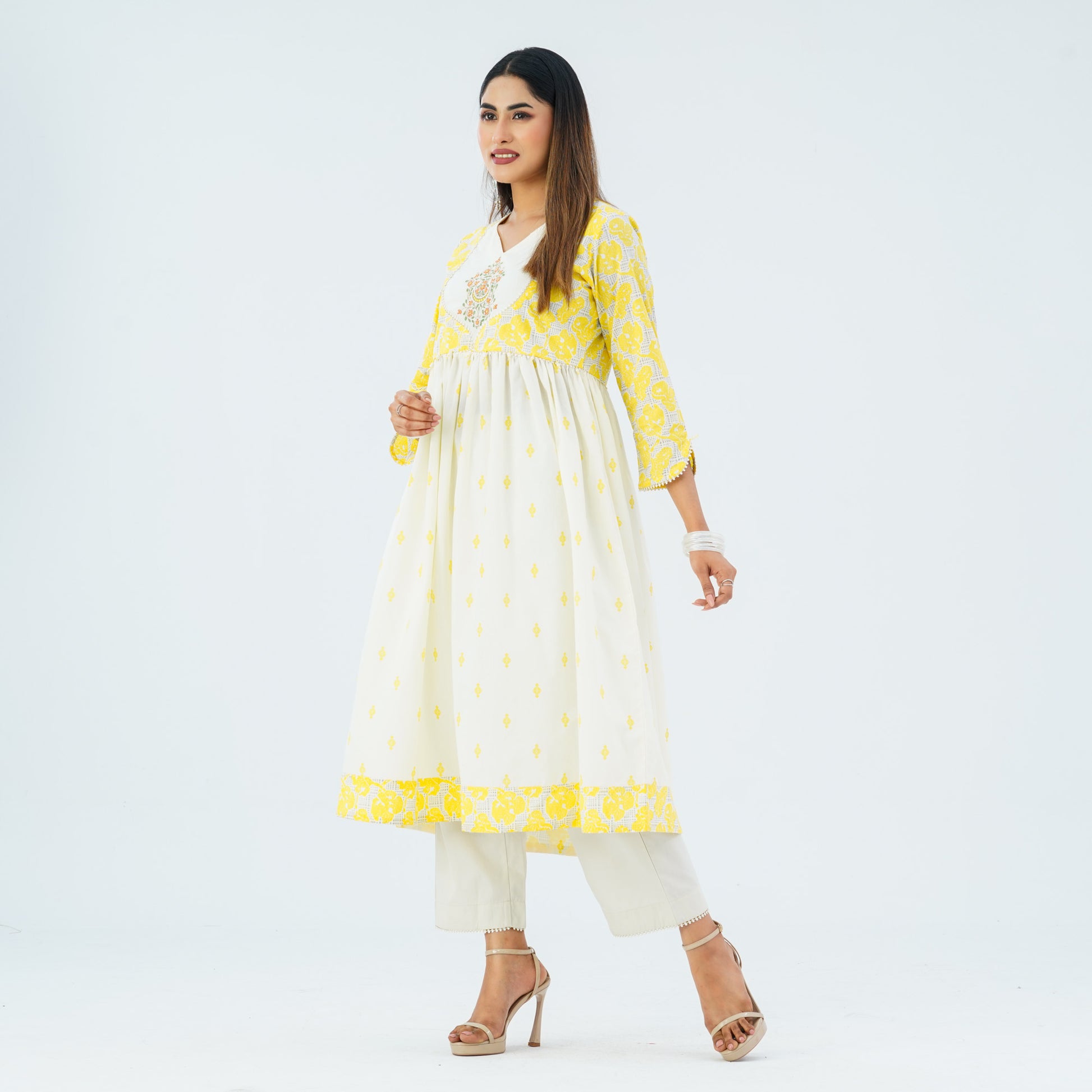 This elegant two piece is crafted from blended cotton and features a flared hem with patch border for a graceful koti style. The gown is adorned with screen prints and decorative embroidery, adding a refined ethnic charm. Perfect for festive occasions, cultural gatherings, and semi-formal celebrations.