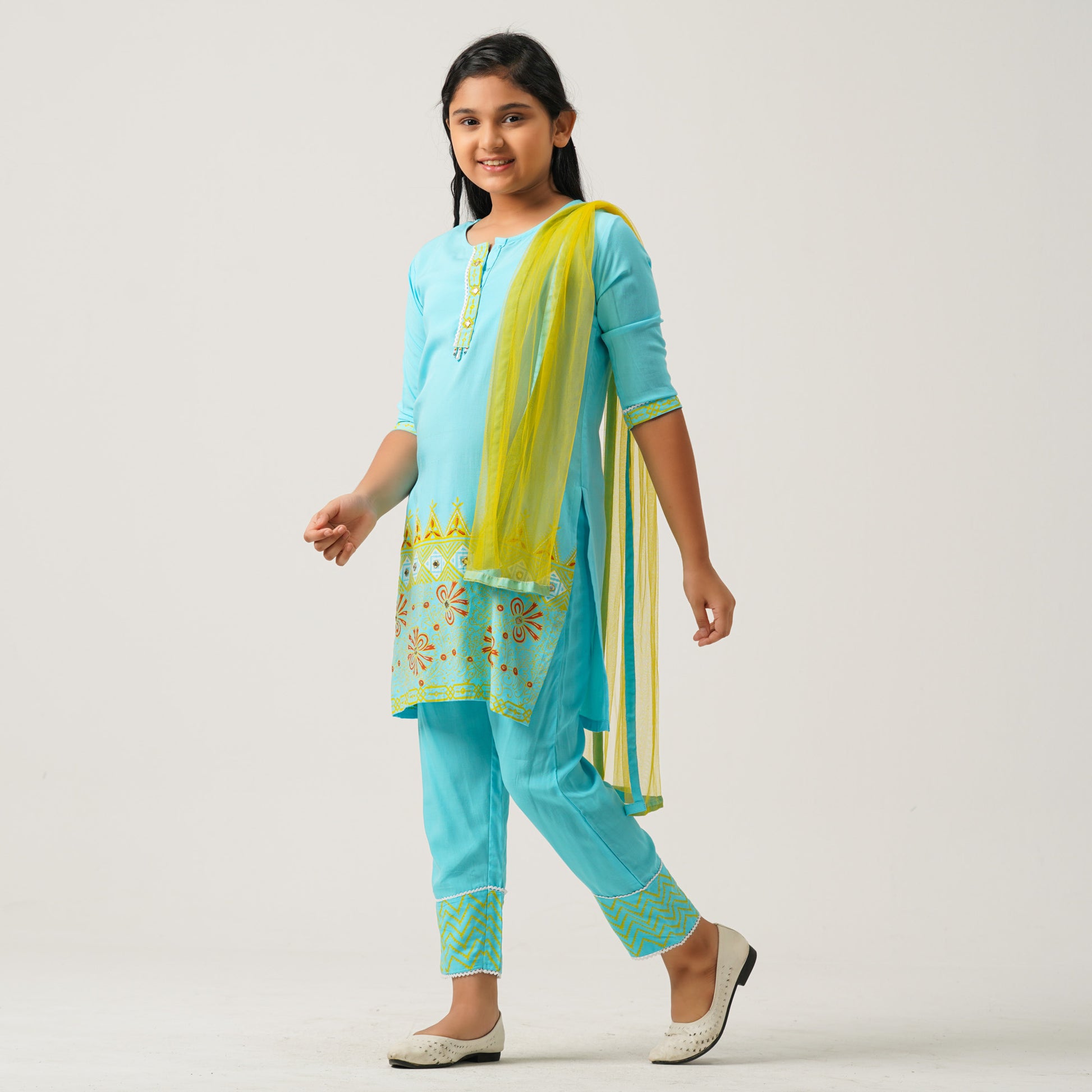 Elegant three piece linen set for girls featuring placement block prints and delicate beadwork. The breathable fabric ensures all-day comfort, while the detailed design adds a festive charm perfect for any celebrations.