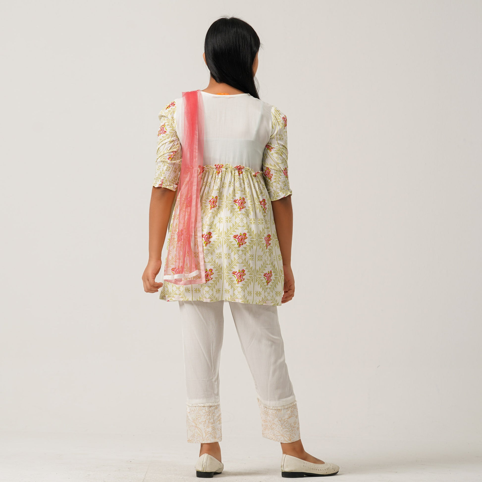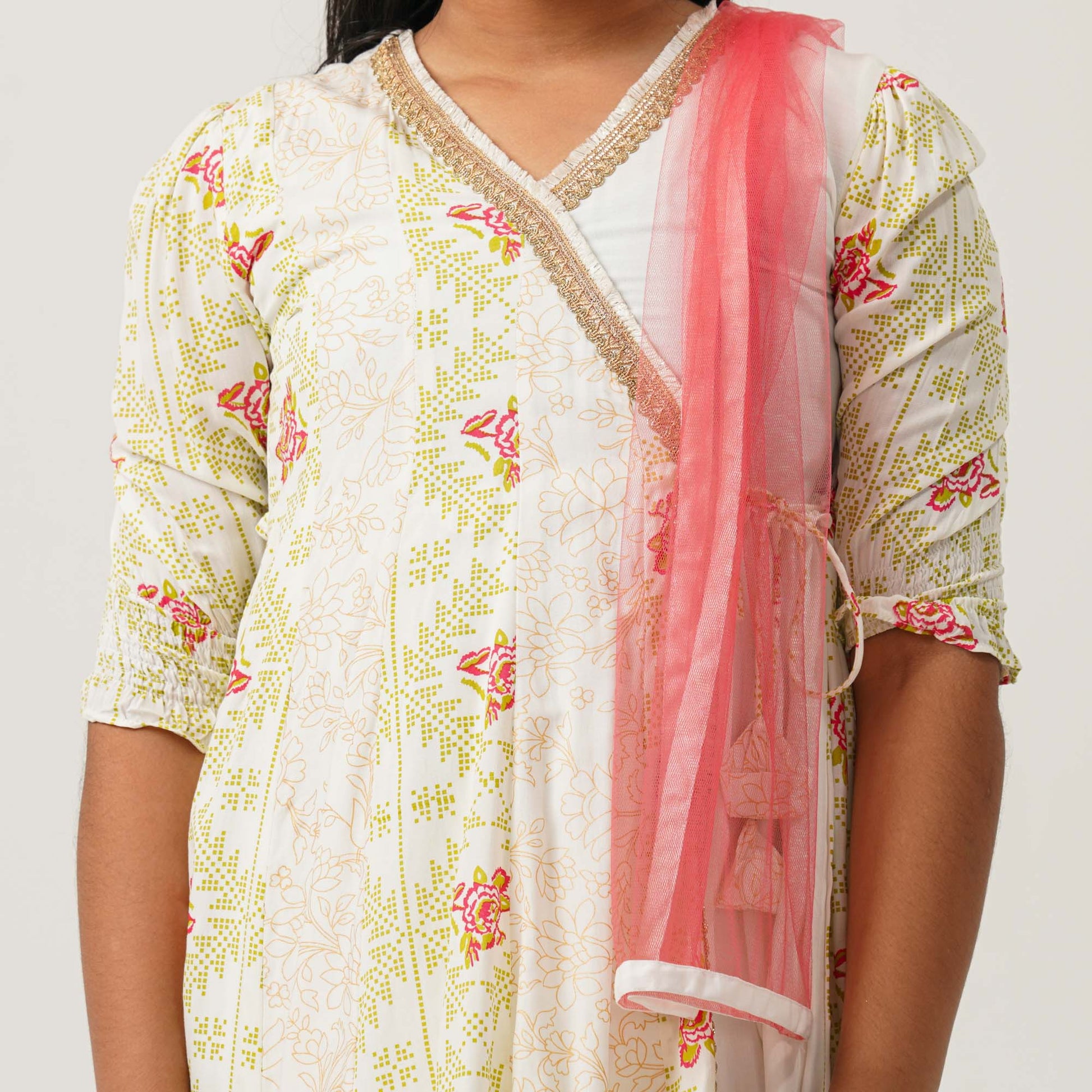 Linen three piece set featuring an Angrakha-style kameez in geo-floral screen print, paired with a matching bottom and a soft net dupatta. Enhanced with decorative lace for a stylish and festive look.