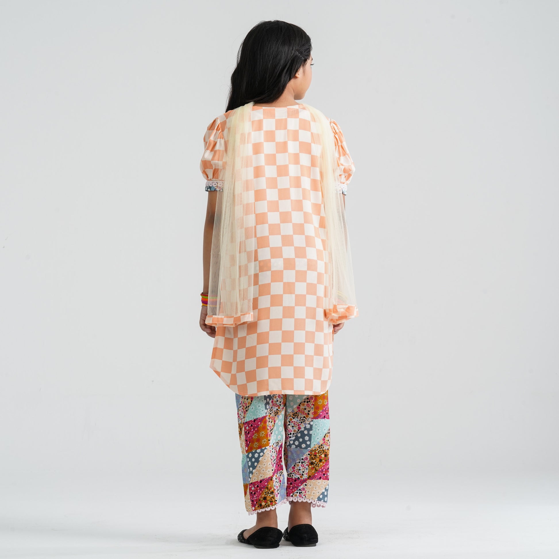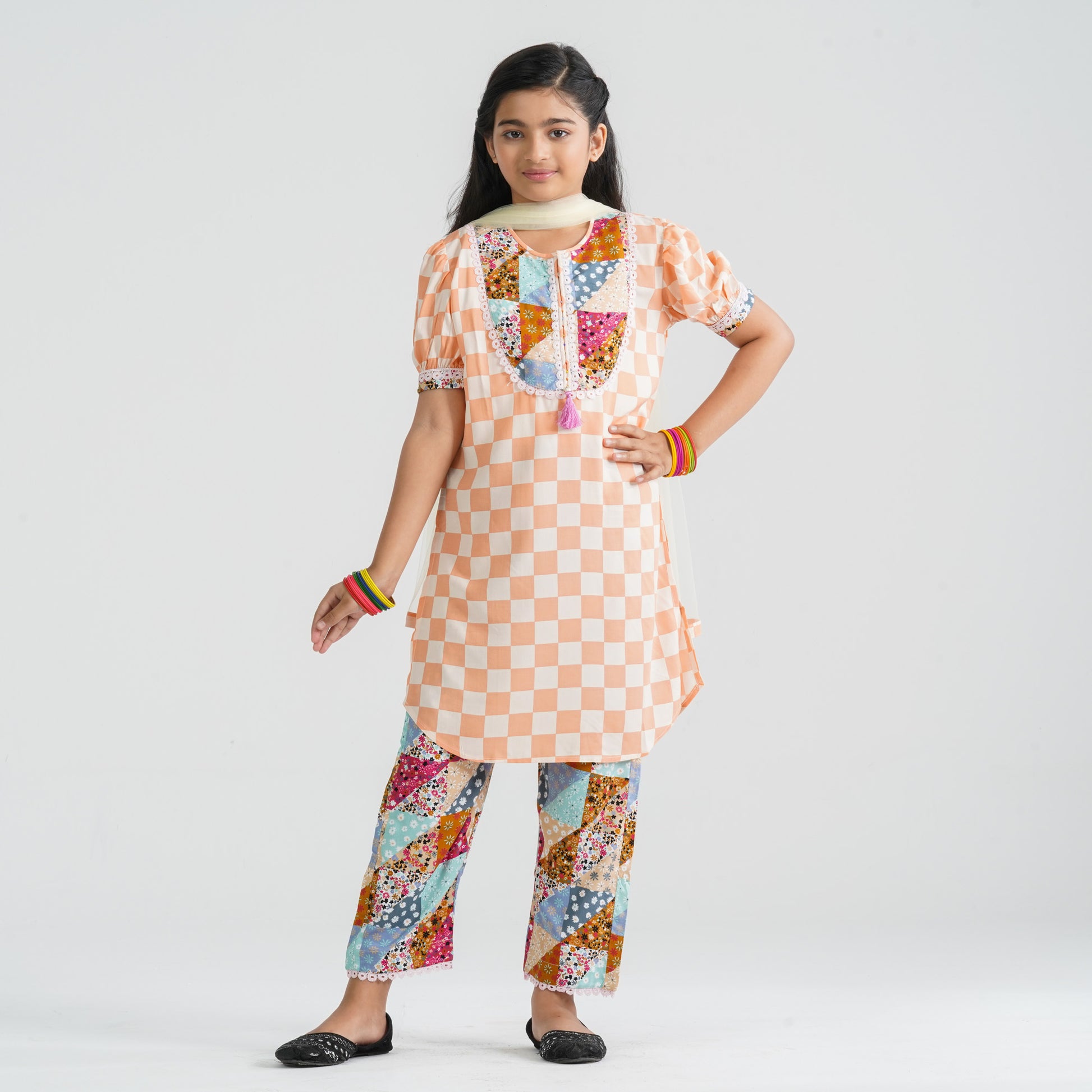 Crafted from soft check cotton fabric and paired with a comfortable viscose pant, this girl’s multicolor three piece ethnic set offers breathable comfort with traditional charm. The contrast floral yoke is beautifully detailed with delicate lace and tassel accents for an elegant festive touch. Designed for a graceful and coordinated look, it ensures easy movement and all-day wearability. Perfect for cultural events, festive occasions, and family gatherings.