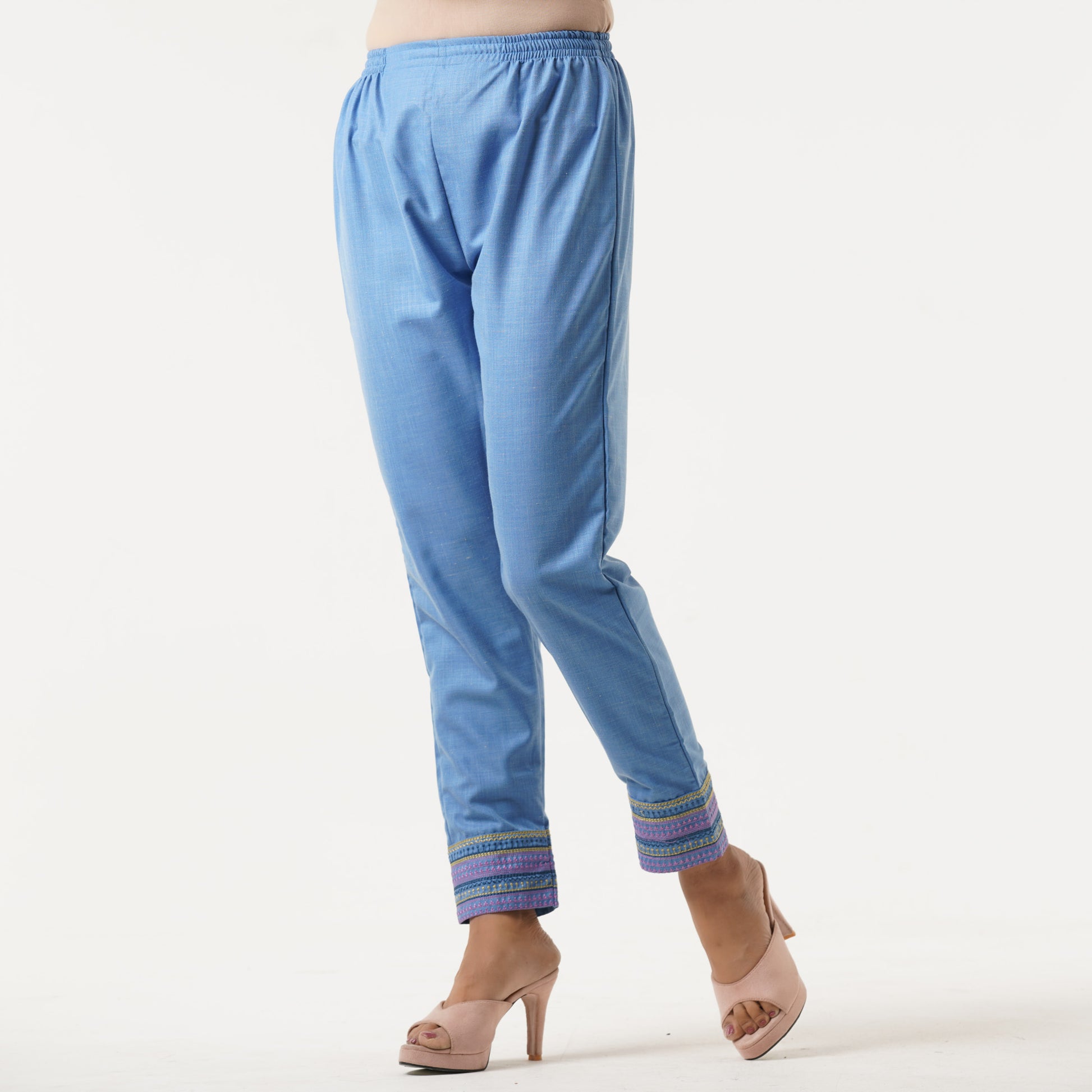 Elegant ethnic bottom in denim blue, crafted from blended fabric for comfort and durability. Designed for a versatile look, perfect for pairing with tunics or kurtis. A stylish addition to your wardrobe.