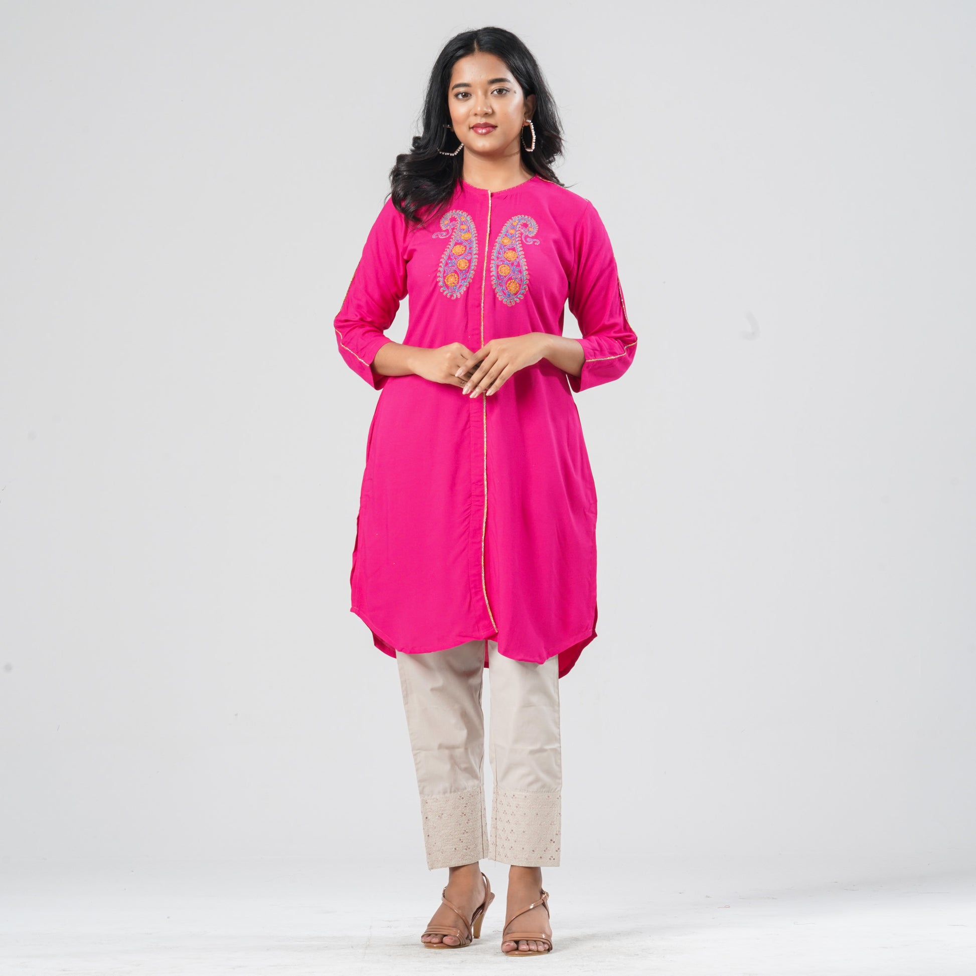 This women’s pink kurti features a classic round neck design with subtle embroidery and contrast piping for an elegant finish. Crafted from soft and breathable viscose fabric, it offers comfort and a smooth drape. Perfect for casual outings or semi-formal occasions, this Kurti combines simplicity with a touch of sophistication.