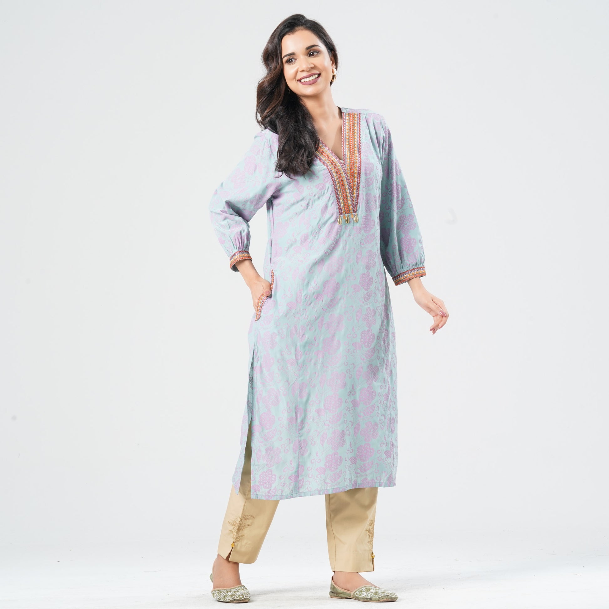 Crafted from premium shimmer cotton fabric, this women’s sky blue kurti offers a soft texture with a subtle elegant sheen. Designed with a flattering V-neckline, it features delicate embroidery on the neckline and gathered sleeves for an enhanced ethnic look. The tassels and bead work detailing add a graceful festive charm, while functional pockets ensure everyday convenience. Perfect for casual gatherings, festive occasions, and cultural events.